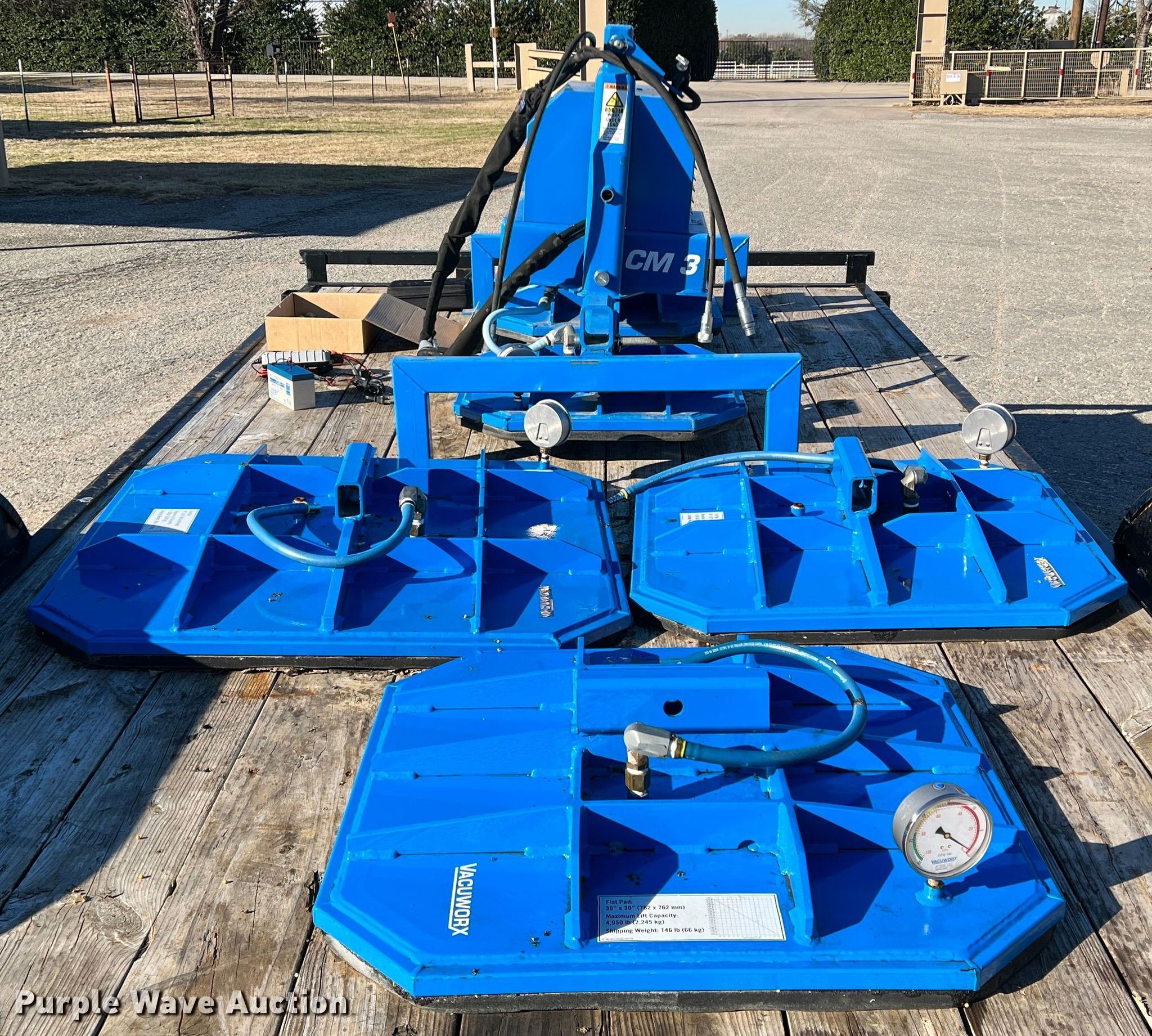 Vacuworx CM 3 slab vacuum. Serial: CM3000033R. Features (2) 24" x 24" pads, (2) 30" x 30" pads, 36" x 36" pad. Notes Trailer not included. RECS, Inc. 430 N Hays Rd. Prosper, TX 75078