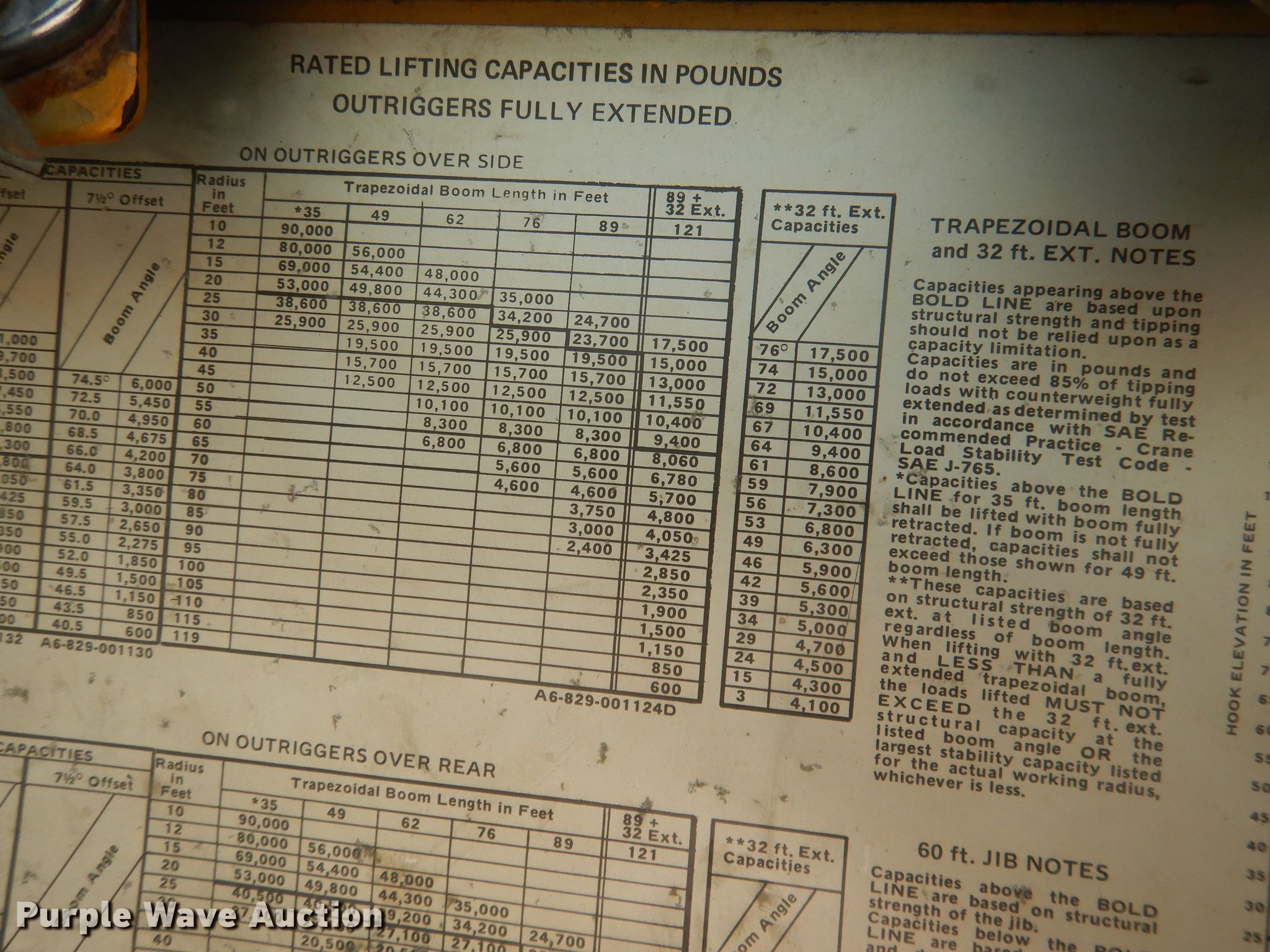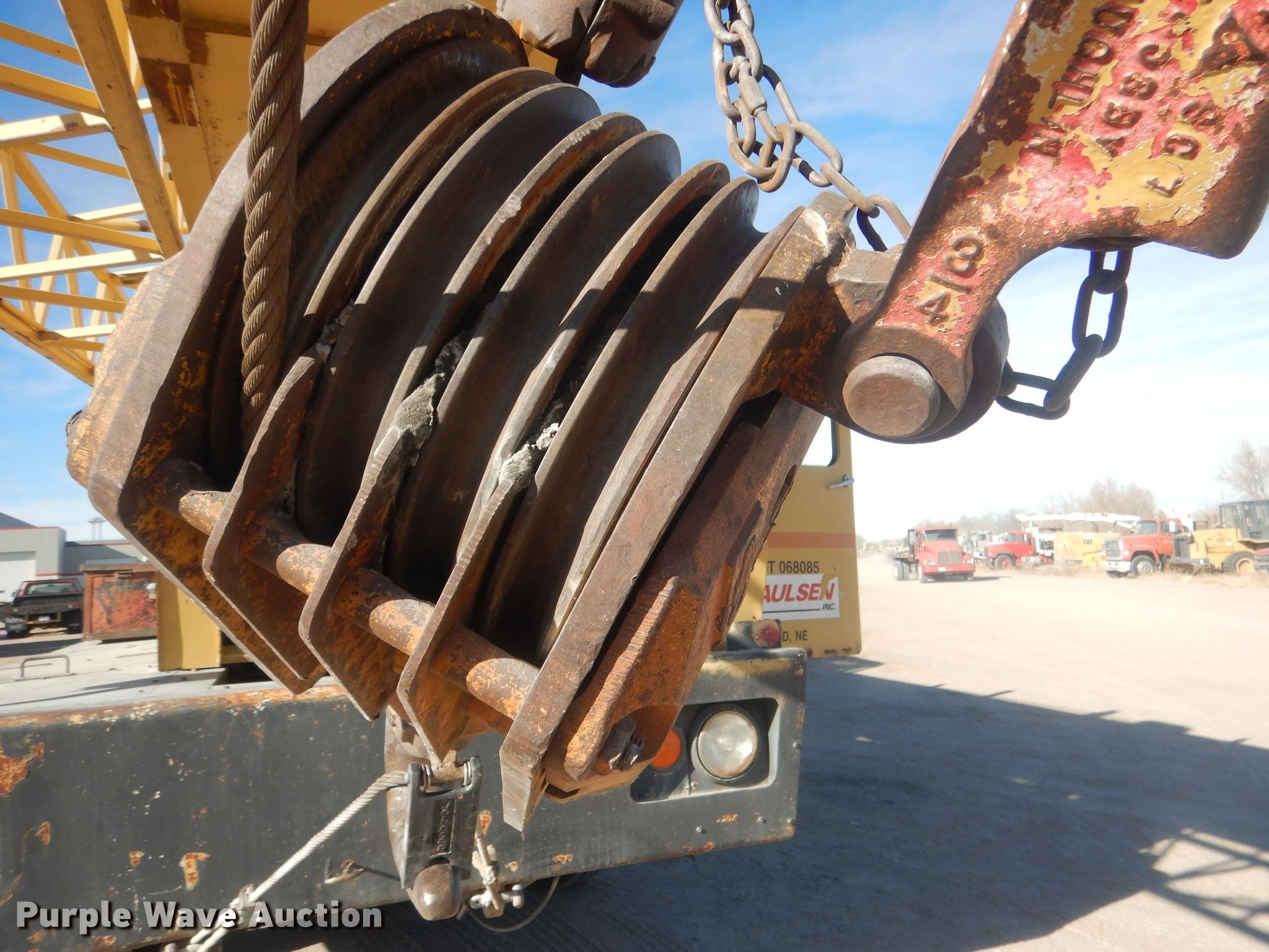 1973 Grove TM375 crane. Miles: 109,585 on odometer, Serial: 10155 G 21548. Engine Detroit Diesel, Cylinders: 6, Fuel type: Diesel. Transmission Eaton Fuller, Manual, Speed: 13, Direct-drive. Chassis Axles: Tandem, Suspension: Spring, Brakes: Air, Controls: Air actuated, Hydraulic actuated. Operators station Enclosed cab, Crane controls: Stick, Upper interior Crane controls: Stick. Features Boom Telescopic, Maximum boom length: 89' Sections: 3, Maximum lift capacity: 90,000 lbs, Maximum lift height: 121', Jib: 32', Stabilizers: 4, Boom controls In-cab, Crane block Sheaves: 4, Crane ball & hook, Lift chart. Tires Front: 315/80R22.5, Rear: 12R22.5. Notes Contents not included. Transfer of ownership documentation will be a bill of sale. Paulsen Inc.. PO Box 17. Cozad, NE 69130