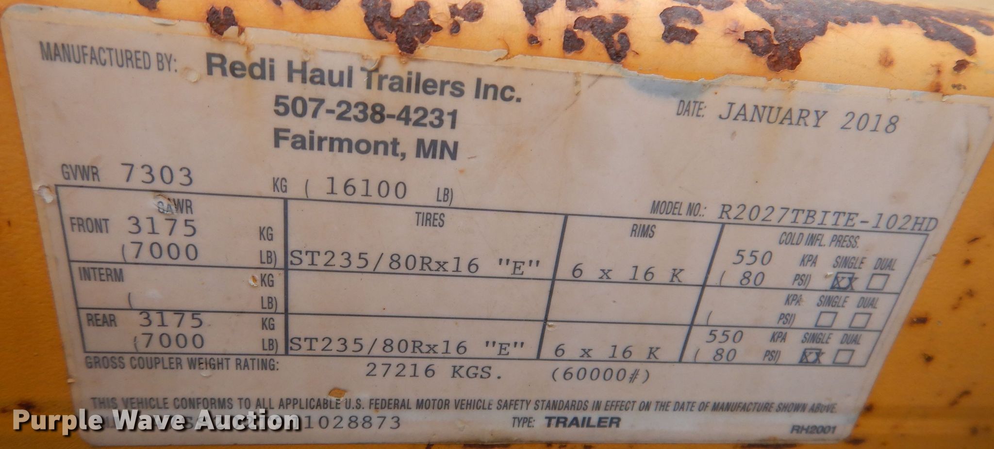 2018 Redi Haul R2027TBITE-102HD tilt deck equipment trailer. VIN: 47SS202T9J1028873. Dimensions Overall: 27' 7" L x 102" W, Deck: 20' L x 81" W. Features Deck type: Wood. Chassis Hitch: Pintle, Landing gear: Single, Brakes: Electric, Axles: Tandem, GVWR: 16,100 lbs, GAWR: 7,000 lbs. Tires Steel wheels, Size: ST235/80R16. Iowa title. Title distribution may be delayed up to 14 days from verification of funds. Minturn, Inc.. Des Moines, IA 50313