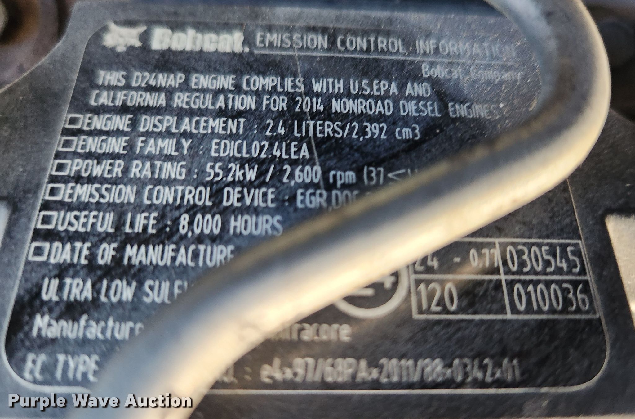 2014 Bobcat S650 skid steer loader. Hours: 3,657 on meter, Serial: S1ML11364. Engine Bobcat, Displacement: 2.4L, Cylinders: 4, Fuel type: Diesel, HP: 74. Transmission Hydrostatic, Two speed travel. Operators station EROPS, AC, Heat, Bucket control: Hand, Foot, Electronic Monitoring System panel. Features Auxiliary hydraulics High flow, Auxiliary electrical outlet, Quick coupler: Hydraulic, Bucket Width: 72", Cutting edge: Bolt-on. Tires Size: 33x6x11, Solid. Concrete Strategies, LLC. St. Louis, MO 63146