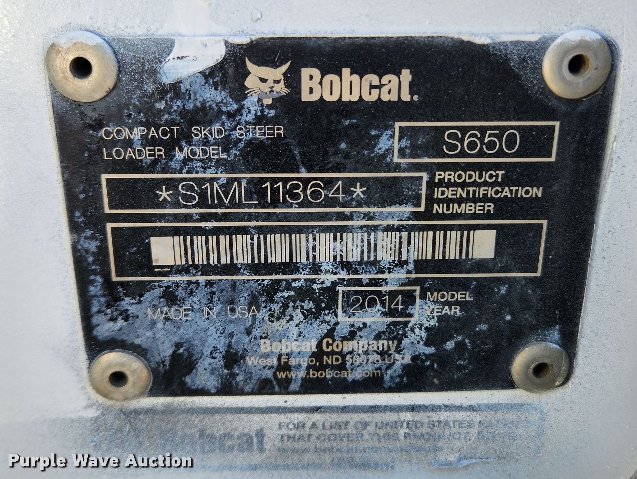 Purple Wave is selling a used Skid Steer Loader in Missouri. This item is a 2014 Bobcat S650 skid steer loader with the following: Hours: 3,657 on meter, Serial: S1ML11364