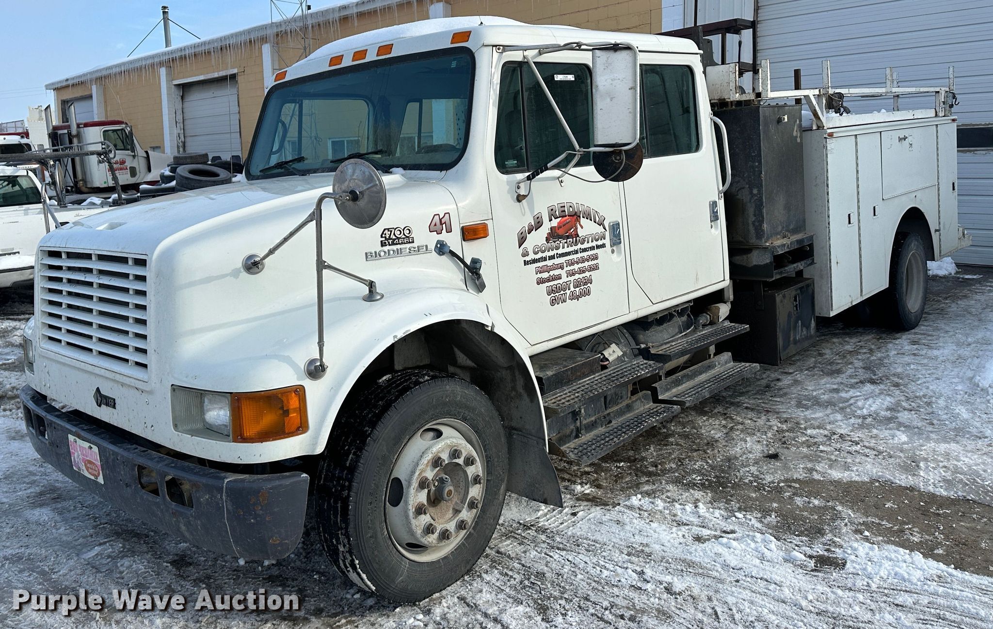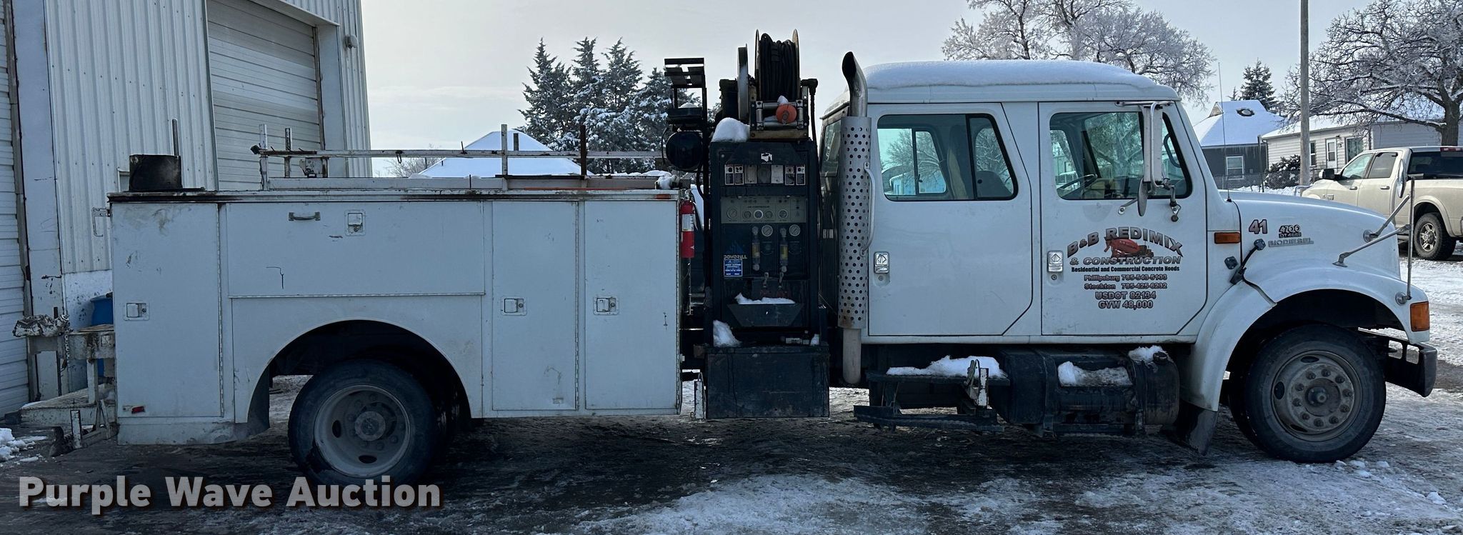 1999 International 4700 Crew Cab utility / service truck. Miles: 165,994 on odometer, Hours: 11,449 on meter, VIN: 1HTSCAAL2XH652566. Engine International, Displacement: 7.6L, Cylinders: 6, Fuel type: Diesel. Transmission Automatic. Chassis Axles: Single, Suspension: Spring, Brakes: Air, PTO. Interior AC, Heat, Heated mirrors, Cruise control. Features Bed 10' L x 96" W, Torch bottle rack, Powerall hydraulic power unit Hours: 793 on meter, PSI: 2,000 , CFM: 100 , Volts: 120 , Amps: 20. Tires Front: 245/70R19.5. Notes Job box not included. Kansas title. Title distribution may be delayed up to 14 days from verification of funds. B&B Redimix Inc.. Phillipsburg, KS 67661