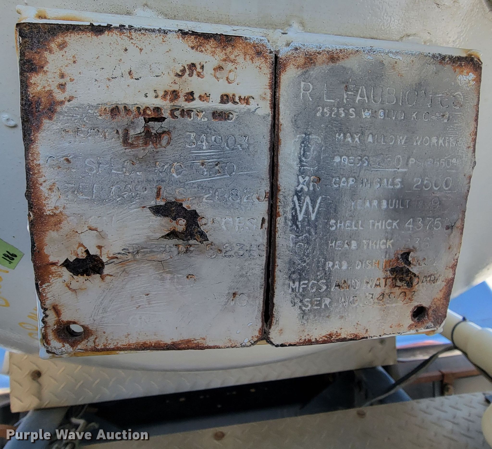 2001 Kenworth T300 propane delivery truck. Miles: 358,808 on odometer, VIN: 2NKMHD7X91M879005. Engine Caterpillar 3126, Displacement: 7.2L, Cylinders: 6, Fuel type: Diesel. Transmission Eaton Fuller, Manual, Speed: 6. Chassis Axles: Single, Suspension: Spring, Brakes: Air, PTO. Interior AC, Heat. Features Bed / tank R.L. Faubion Co., Serial: 34903, Capacity: 2,500 gallons, 16' x 102" W, Hose reel. Tires Size: 295/75R22.5. South Dakota title. Title distribution may be delayed up to 14 days from verification of funds. Agland coop. 115 South 1st Street. Parkston, SD 57366