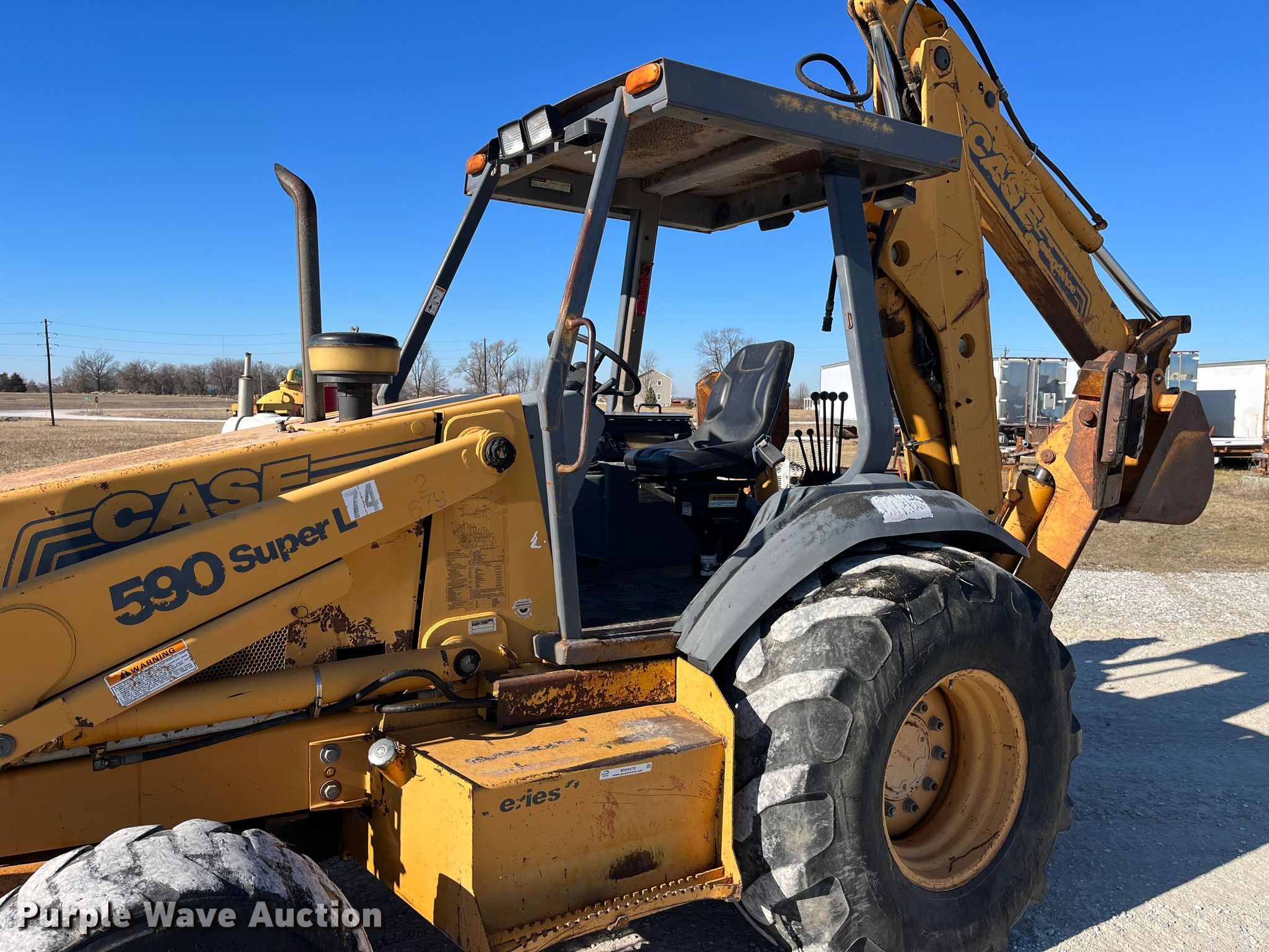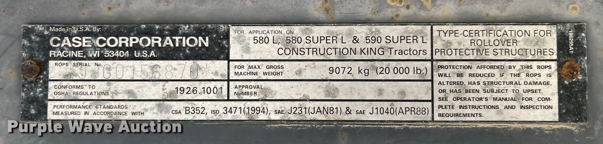 1999 Case 590 Super L Series 2 backhoe. Hours: 4,659 on meter, Serial: JJG0212150. Engine Case 4T-390, Serial: 45840924, Displacement: 3.9L, Cylinders: 4, Fuel type: Diesel. Transmission Shuttle shift, 4F - 4R. Chassis Four wheel drive. Operators station OROPS, Backhoe controls: Four stick Foot control. Features Loader Bucket Width: 92", Cutting edge: Bolt-on, Backhoe Extendable stick, Quick coupler: Manual, Auxiliary hydraulics, Bucket Width: 24", Teeth: 5.. Tires Front: 14-17.5, Rear: 21L-24. Lawson Construction. 29032 Hwy 11. Kirksville, MO 63501