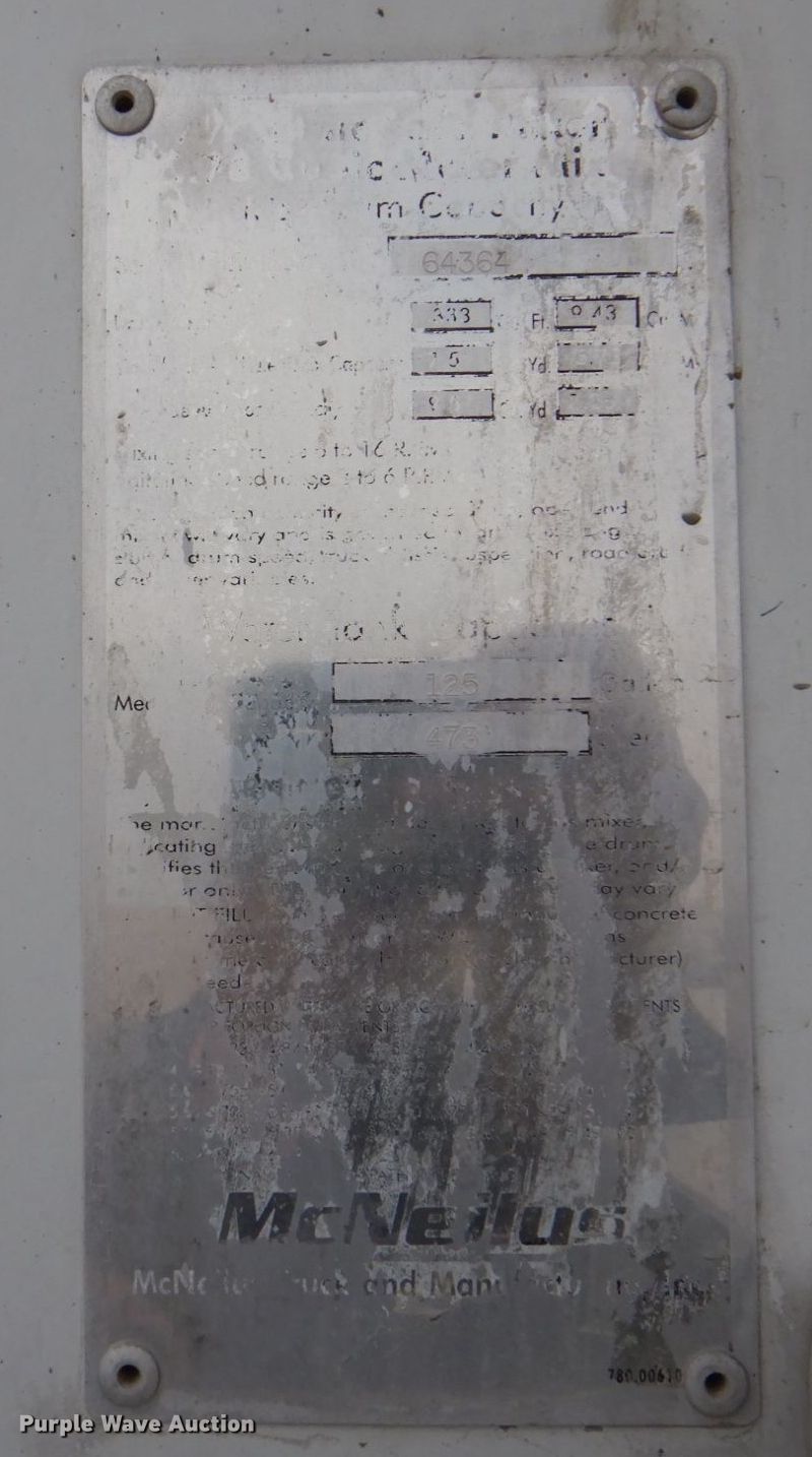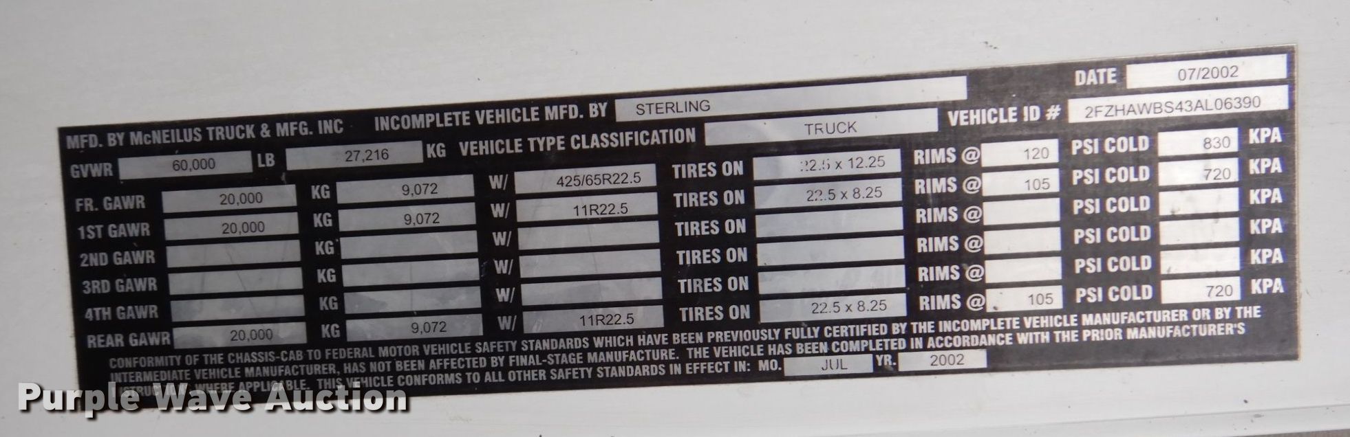 2003 Sterling LT8500 ready mix truck. Miles: 88,543 on odometer, Hours: 11,064 on meter, VIN: 2FZHAWBS43AL06390, Unit #: 37044. Engine Cummins, Displacement: 8.3L, Cylinders: 6, Fuel type: Diesel. Transmission Allison, Automatic. Chassis Double frame, Axles: Tandem, Differential lock: Inter-axle, Suspension: Spring over walking beam, Brakes: Air, Front mount PTO, GVWR: 60,000 lbs FAWR: 20,000 lbs, IAWR: 20,000 lbs, RAWR: 20,000 lbs. Interior Heat, Auxiliary controls, Backup camera. Features Mixer McNeilus, Capacity: 7.5 cu.yd., Discharge: Rear, In-cab controls, Rear drum controls, Water tank capacity: 125 gallons, Chute Extensions: 3, Chute type: Steel.. Tires Front: 425/65R22.5, Rear: 11R22.5. Nebraska title. Title distribution may be delayed up to 14 days from verification of funds. 3200 Baldwin Avenue. Lincoln, NE 68504