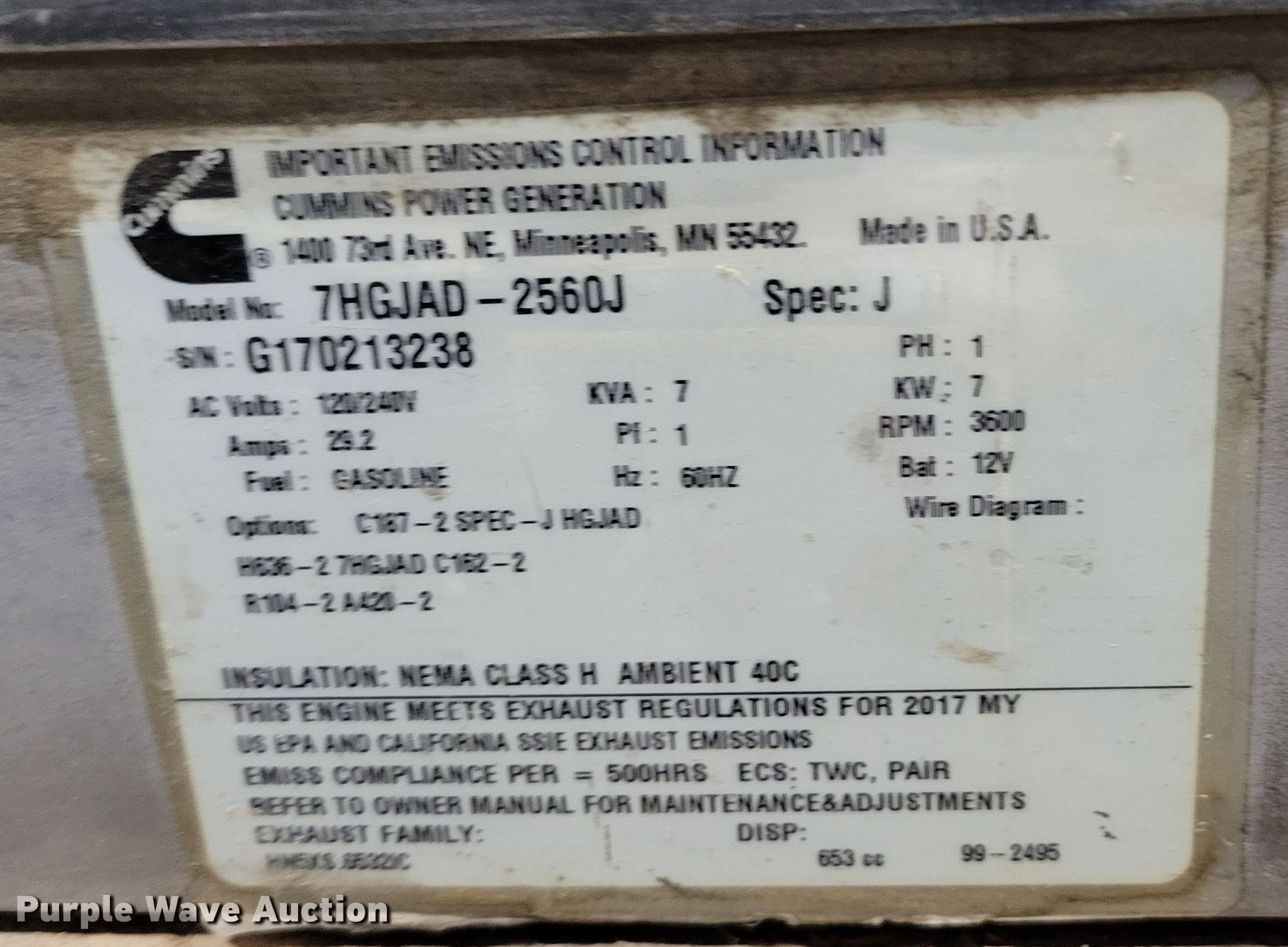 Cummins Onan Commercial QG EFI generator. Serial: G170213238. Engine Cylinders: 1, Fuel type: Gas. Features Generator kVA: 7, kW: 7, Volts: 120/240V, Phase: Single, Electric start, Skid mounted. Notes Stand: 28" W x 57" L x 12" H. City of Lincoln WasteWater Plant. 2400 Theresa Street. Lincoln, NE 68521