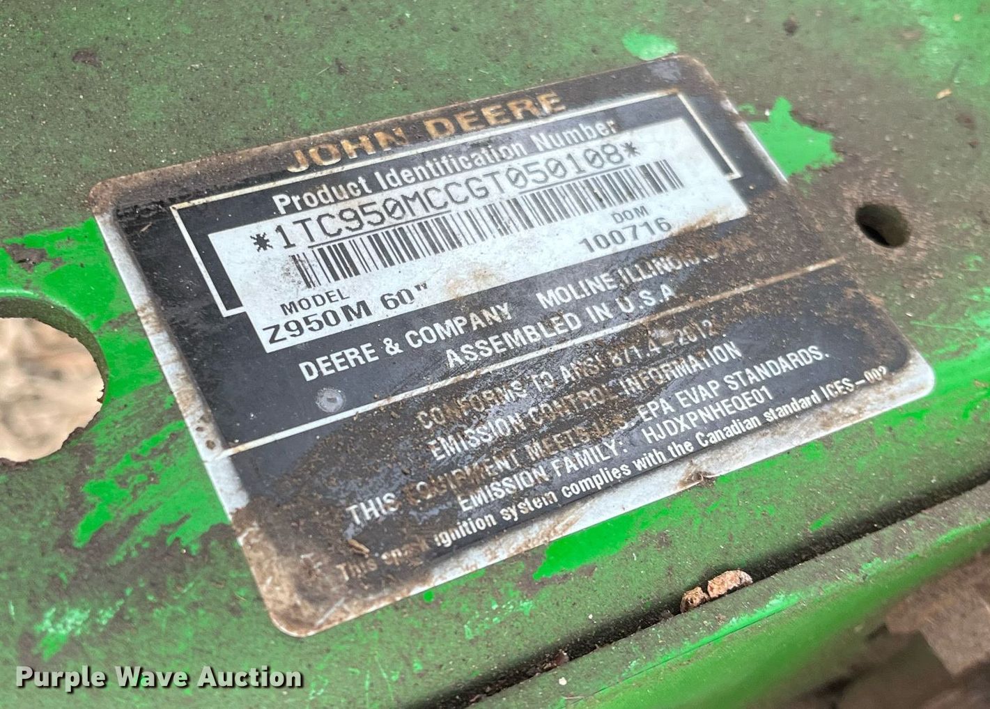 Purple Wave is selling a used Commercial Turf Mower in Kansas. This item is a John Deere Z950M ZTR lawn mower with the following: Hours: 1,930 on meter, Cutting width: 60", Serial: 1TC950MCCGT050108