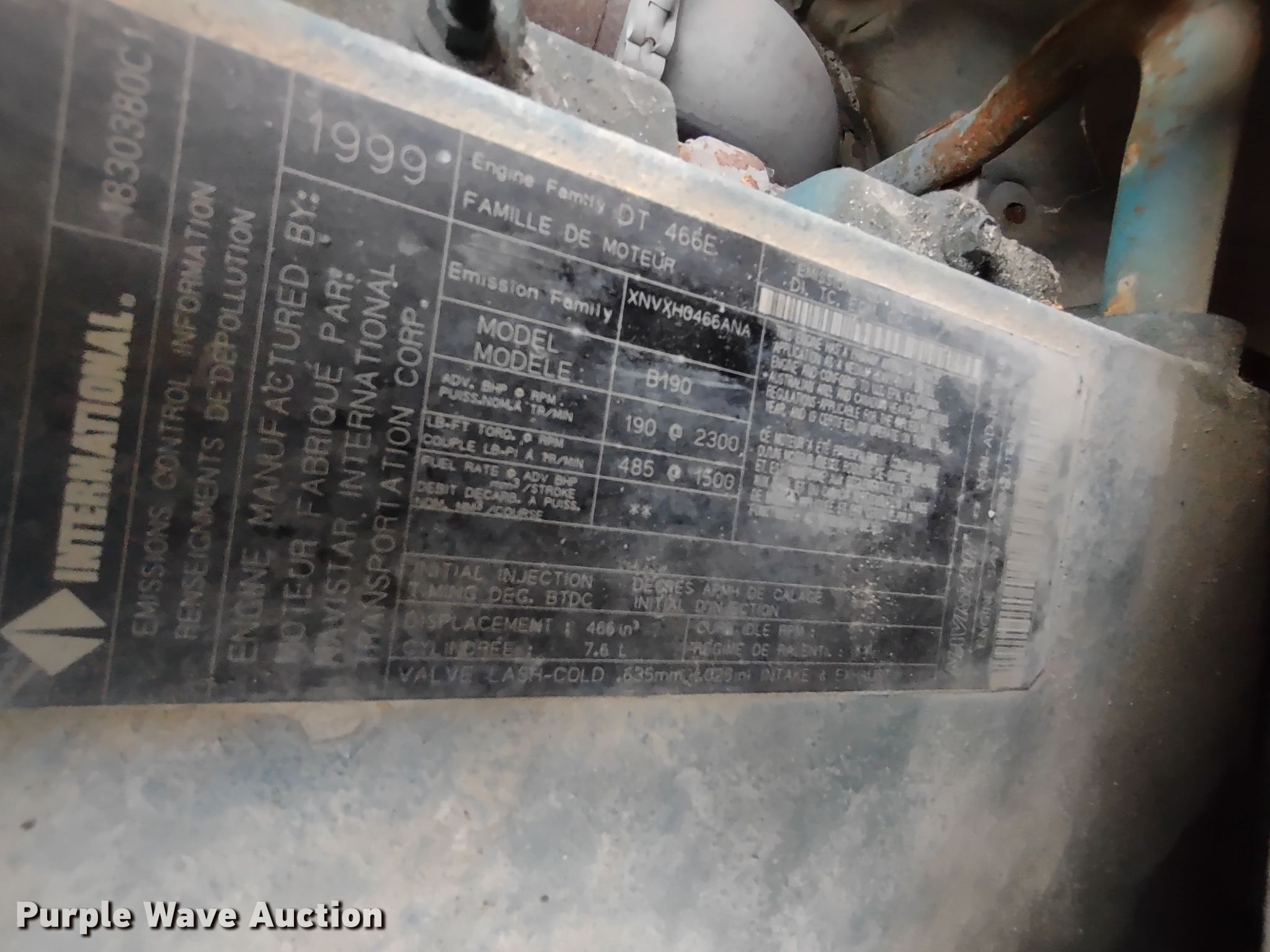 1999 International 3800 school bus. Miles: 187,908 on odometer, Hours: 9,881 on meter, VIN: 1HVBBAAP5XH683307, Unit #: 7. Engine International DT 466E, Displacement: 7.6L, Cylinders: 6, Fuel type: Diesel, HP: 190. Transmission Automatic. Chassis Axles: Single, Suspension: Spring, Brakes: Hydraulic, GVWR: 29,000 lbs. Interior Heat, Heated mirrors, Cruise control, Passengers: 60. Tires Size: 11R22.5. Notes Parts only unit, Multiple parts missing, Frame has been cut, Hole in engine, Non-operational unit. Kansas title. Title distribution may be delayed up to 14 days from verification of funds. Wellsville Unified School District 28. 614 East 7th Street. Wellsville, KS 66092