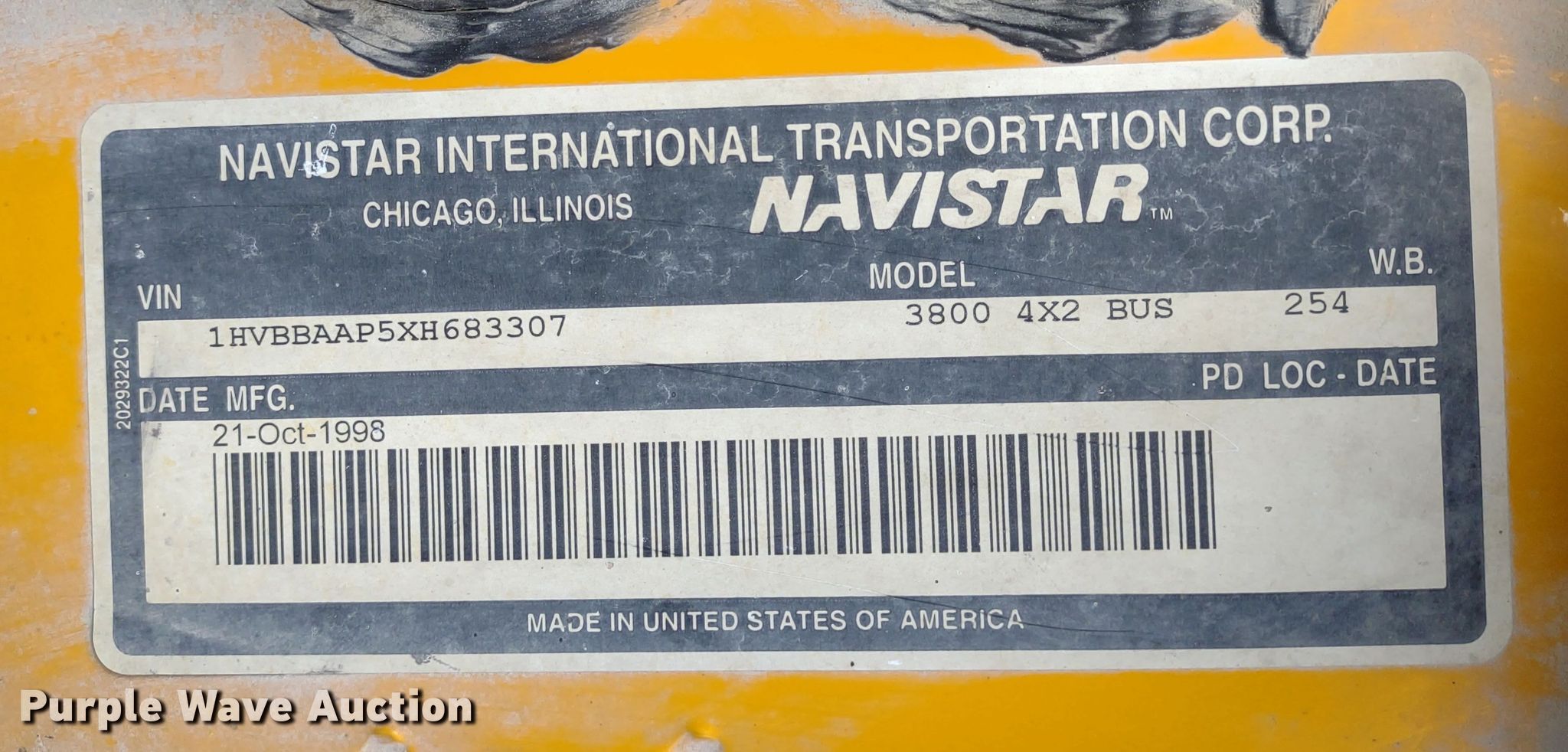 Purple Wave is selling a used Bus in Kansas. This item is a 1999 International 3800 school bus with the following: Miles: 187,908 on odometer, Hours: 9,881 on meter, VIN: 1HVBBAAP5XH683307, Unit #: 7