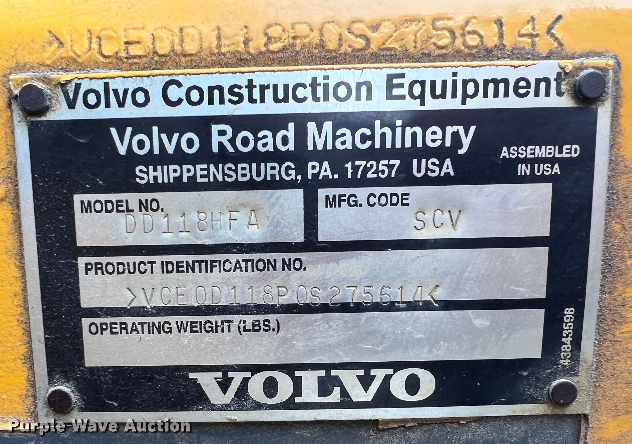 Purple Wave is selling a used Double Drum Roller Compactor in Oklahoma. This item is a 2011 Volvo DD118HFA double drum vibratory roller with the following: Hours: 2,634 on meter, Serial: VCE0D118P0S275614