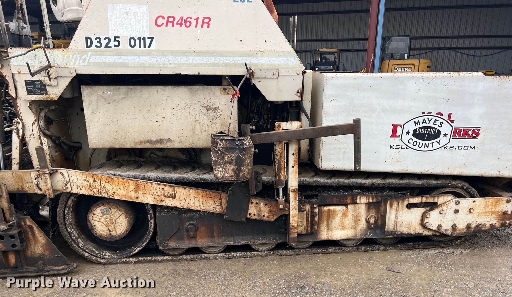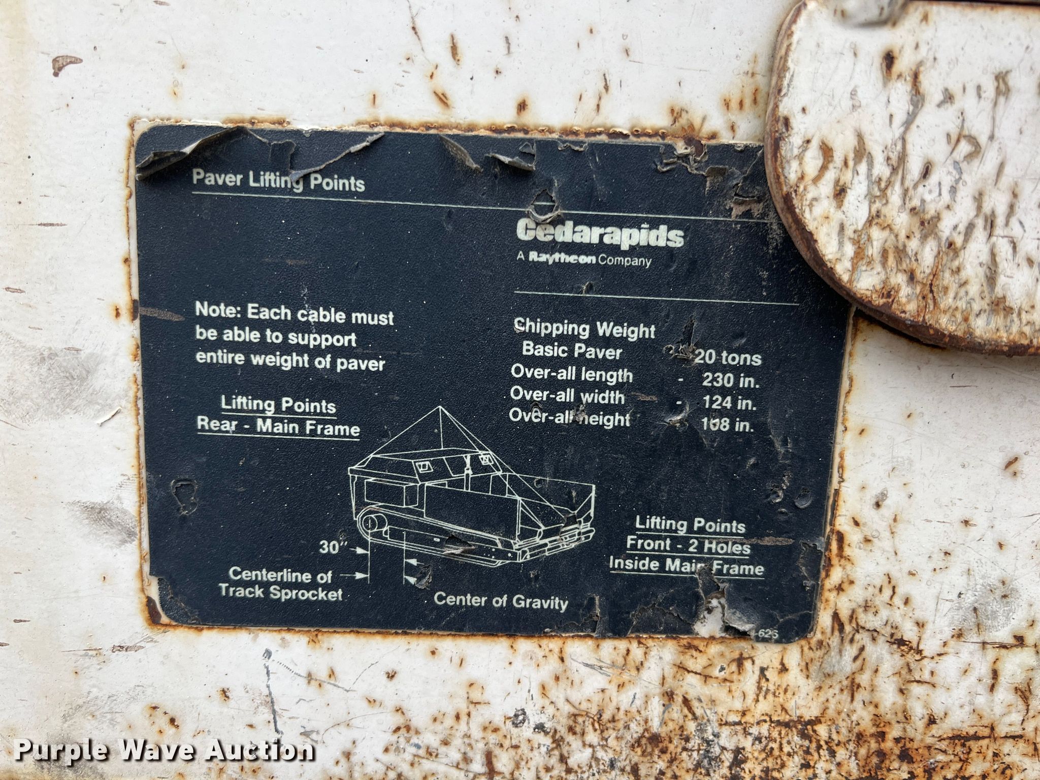 1999 Cedarapids CR461R paver. Hours: 6,349 on meter Actual hours unknown, Serial: 48547. Engine Cummins, Cylinders: 6, Fuel type: Diesel. Transmission Hydrostatic. Features Screed, Paving width: 10' to 18', Front spread hopper width: 10'. Tracks Width: 17", Rubber. Notes Non-operational hour meter, Non-operational conveyor sensor. Mayes County, OK. Adair, OK 74330