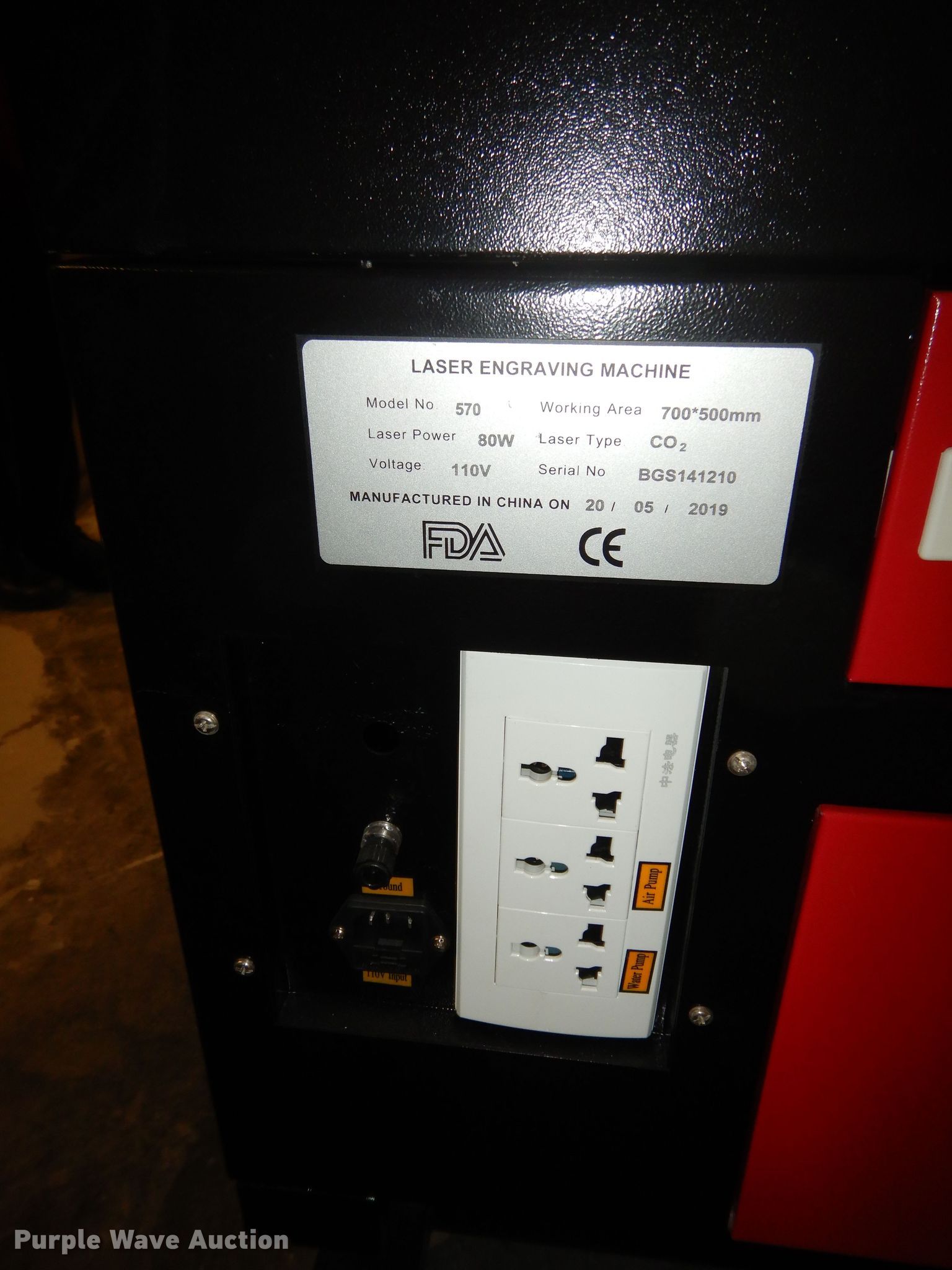 Purple Wave is selling a used Tools in Kansas. This item is a 2019 FDA 570 laser engraving machine with the following: 5' x 3' x 3', 700 mm x 500 mm working area, 80 watts, 110V, Laser type: CO2, Unused, Serial: BGS141210