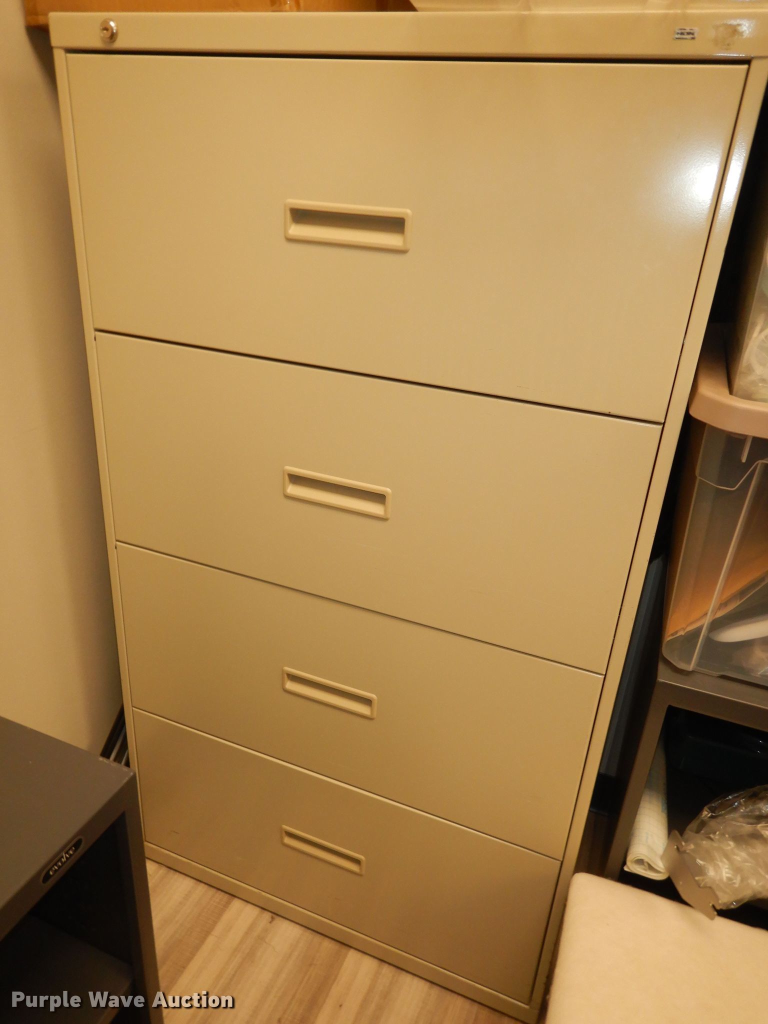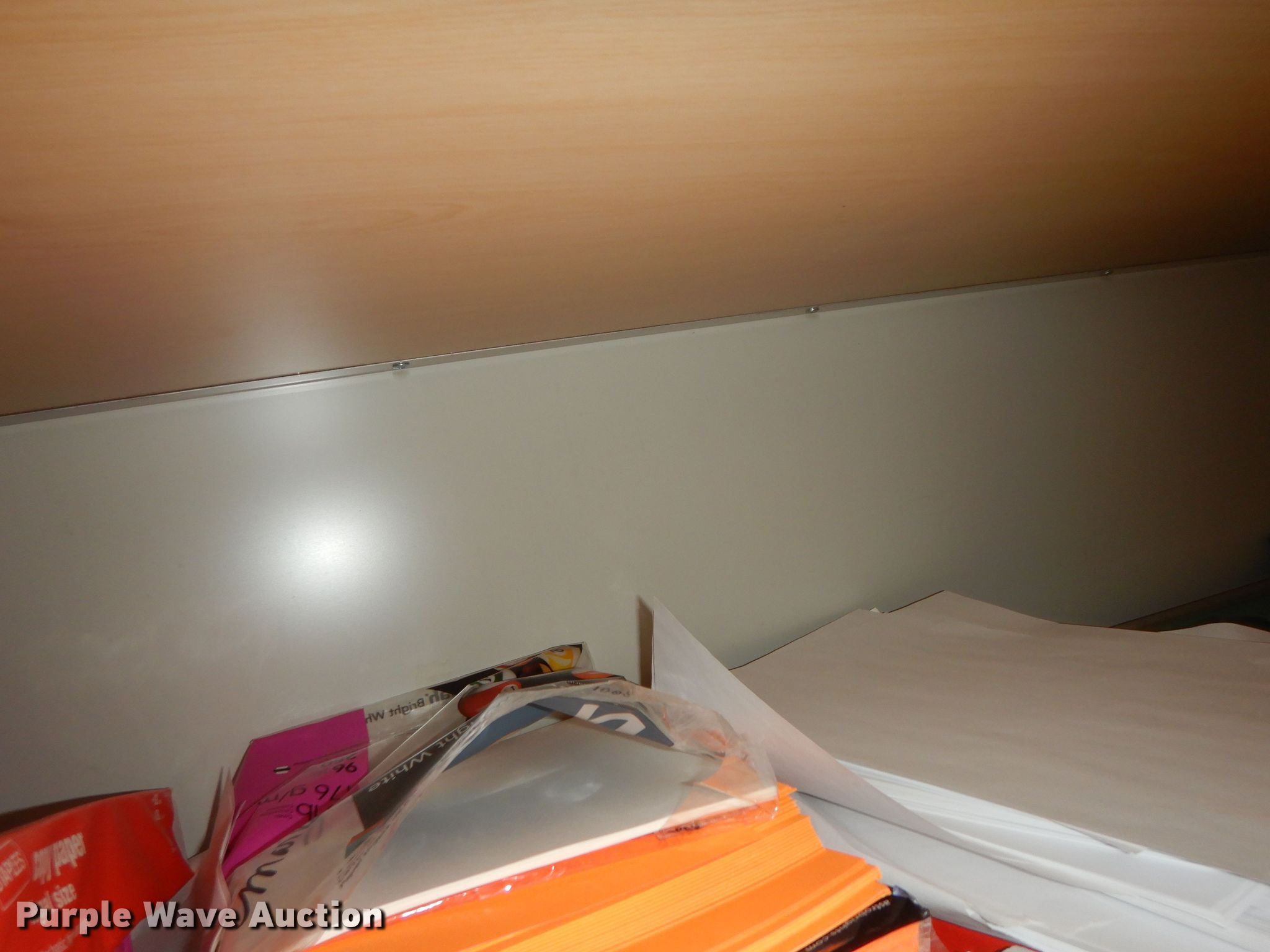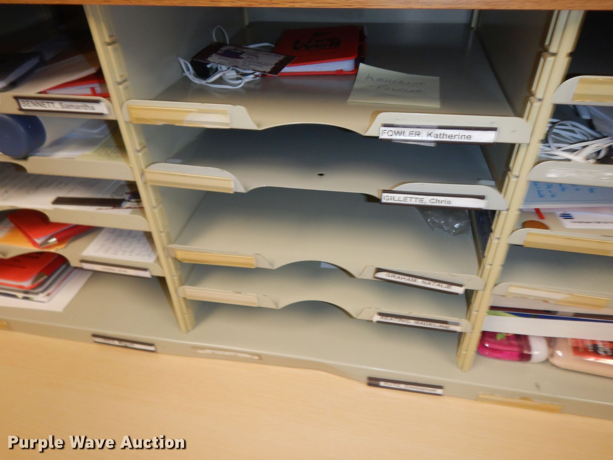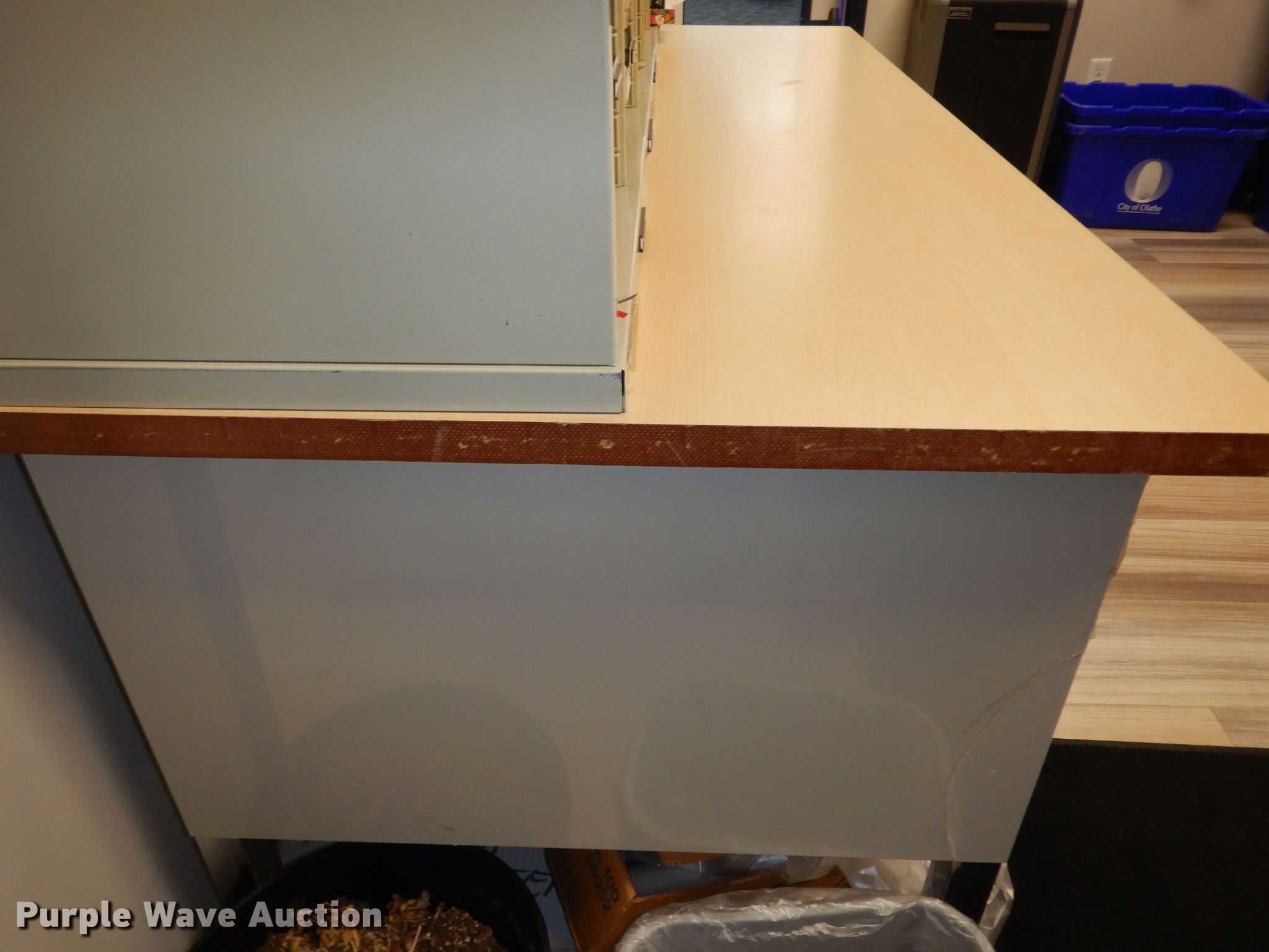Purple Wave is selling a used Furniture in Kansas. This item is a Furniture with the following: Desk, 5' x 30", Mailbox shelving, 62" x 15", (3) shelves, 36" x 18", (2) file cabinets, Contents not included
