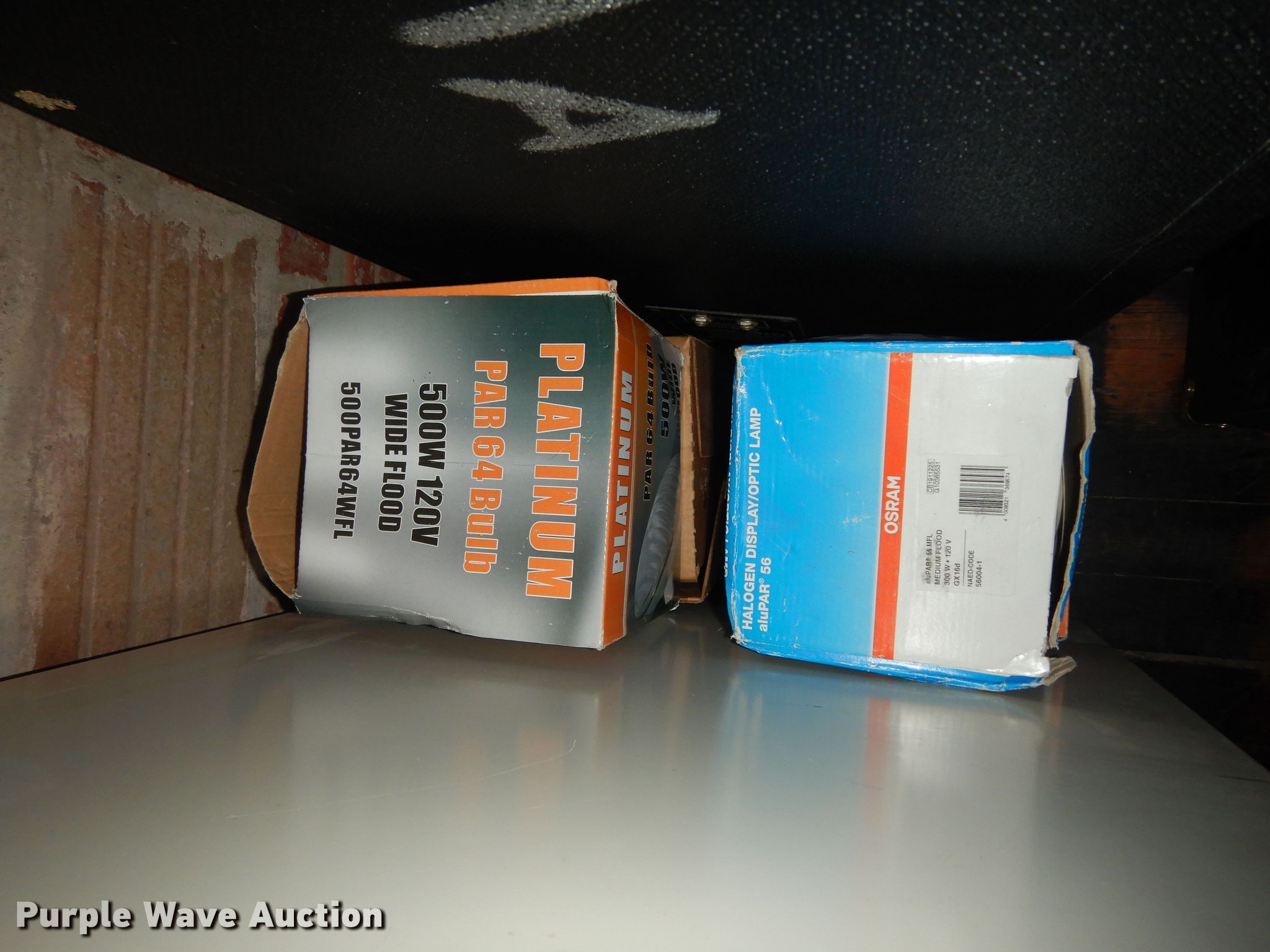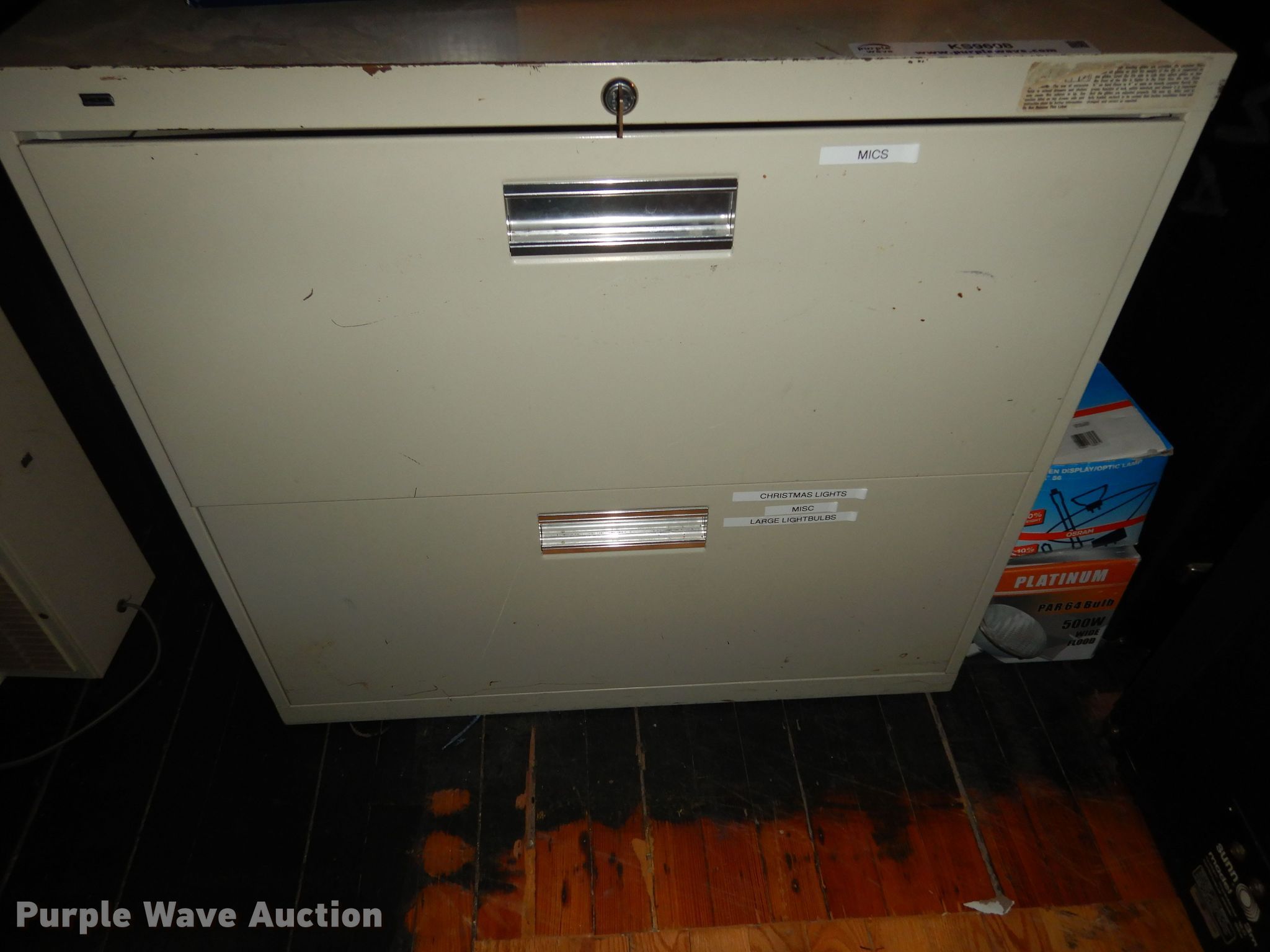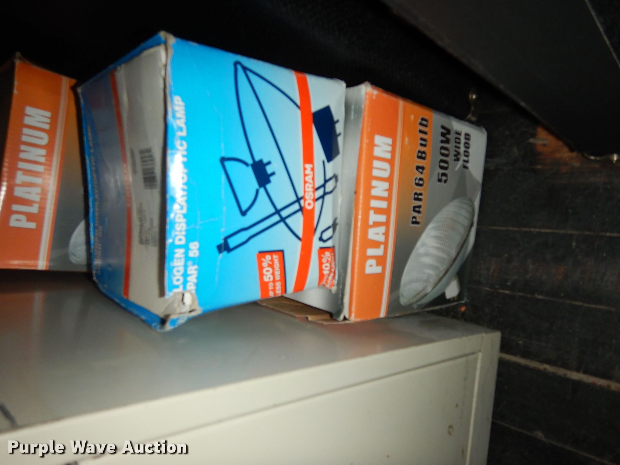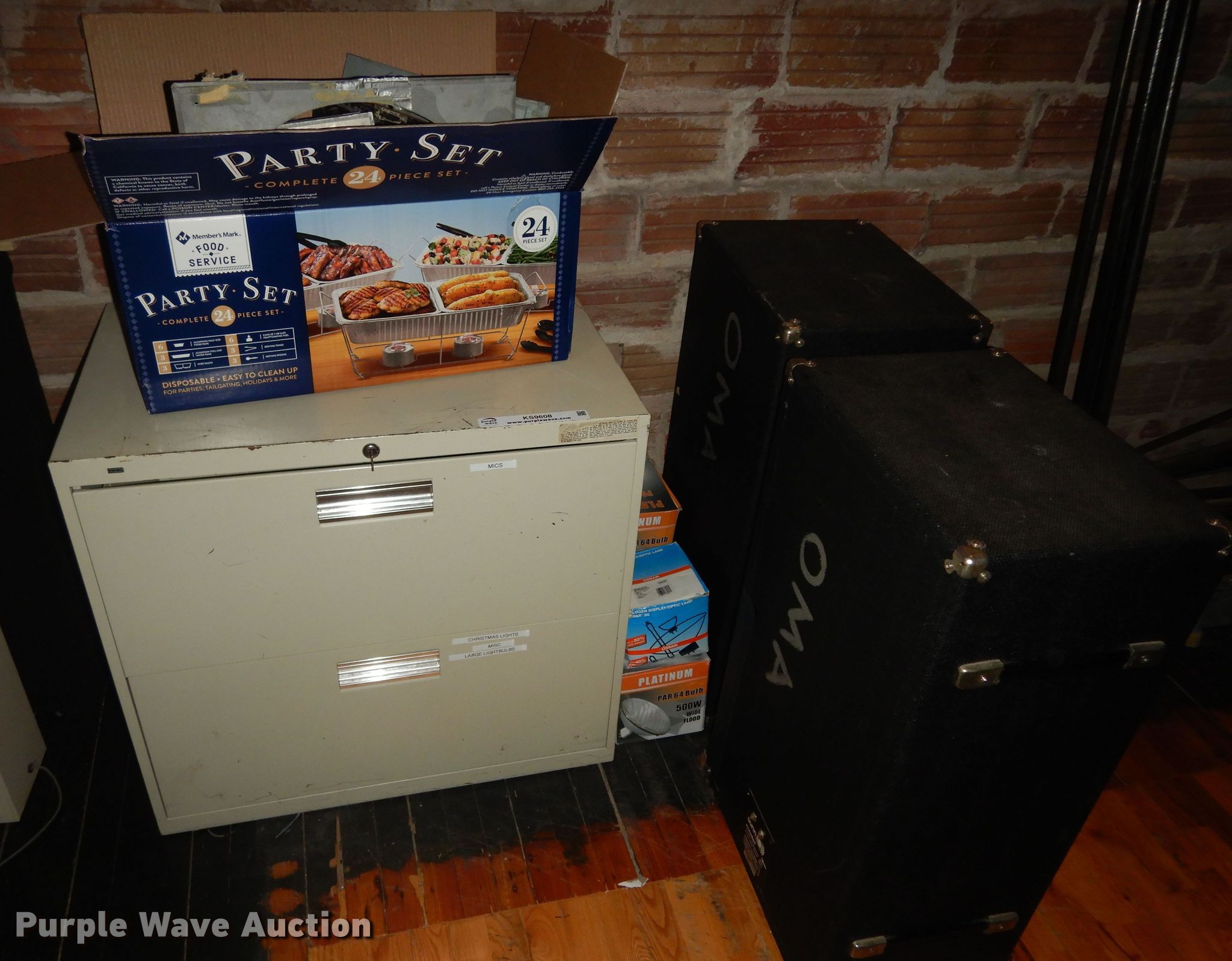 Purple Wave is selling a used Office Supplies and Equip. in Kansas. This item is a Office supplies and equipment with the following: Two drawer file cabinet, Stage light film slides, Light bulbs, Sunn 3m speakers