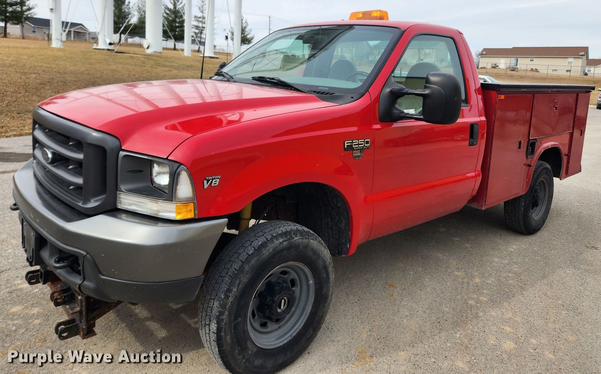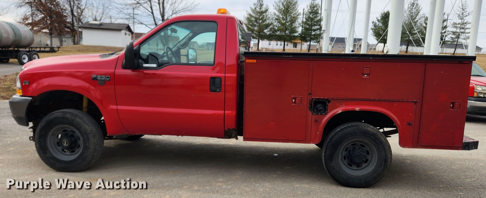 This 2002 Ford F250 Super Duty XL utility bed pickup truck will sell to the highest bidder regardless of price.