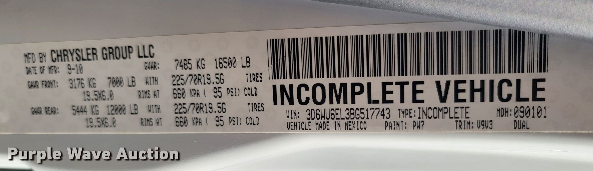 Purple Wave is selling a used Truck Chassis in Kansas. This item is a 2011 Dodge Ram 4500 truck cab and chassis with the following: Miles: 116,391 on odometer, VIN: 3D6WU6EL3BG517743
