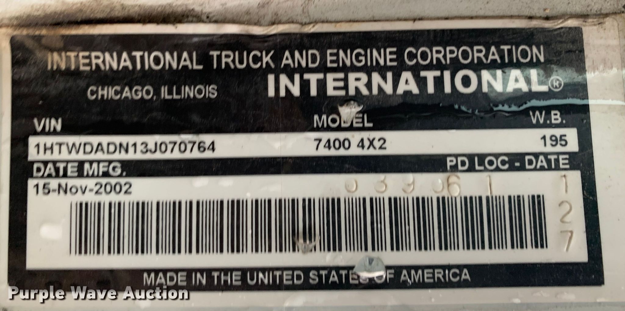 2003 International 740 pothole patcher truck. Miles: Unknown, VIN: 1HTWDADN13J070764, Unit #: 310. Engine International C275, Displacement: 8.7L, Cylinders: 6, Fuel type: Diesel. Transmission Automatic. Chassis Axles: Single, Suspension: Air, Brakes: Air, PTO. Interior AC, Heat, Heated mirrors, Cruise control, Brake controller. Features Bed / tank 9' L x 6' 9" W, Spray wand. Tires Size: 11R22.5. Notes Dead battery, Possible starter issues, Transmission issues, housing damaged, Unknown operating condition. Oklahoma title. Seller is a government entity who will be assigning and distributing the title. Please contact the seller for distribution questions. Title distribution may be delayed up to 30 days from verification of funds. City of Tulsa, OK. 108 North Trenton Avenue. Tulsa, OK 74120