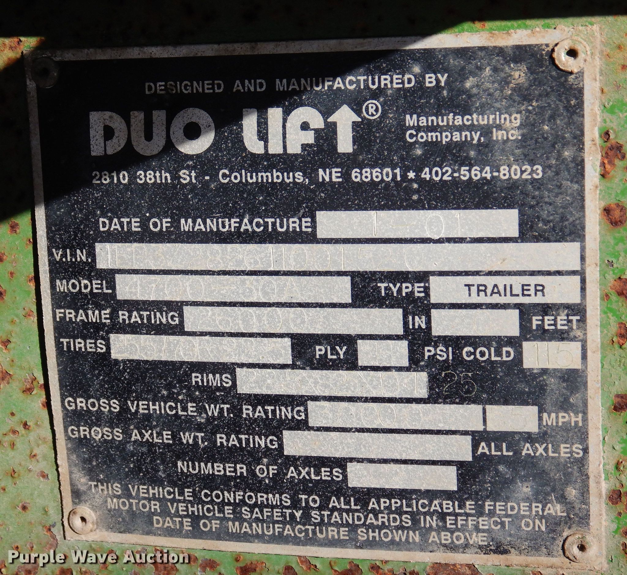 Purple Wave is selling a used Ag Equip. or Header Trailer in Nebraska. This item is a 2001 Duo Lift 4700-30A sprayer trailer with the following: VIN: 1EP3Z282611001520