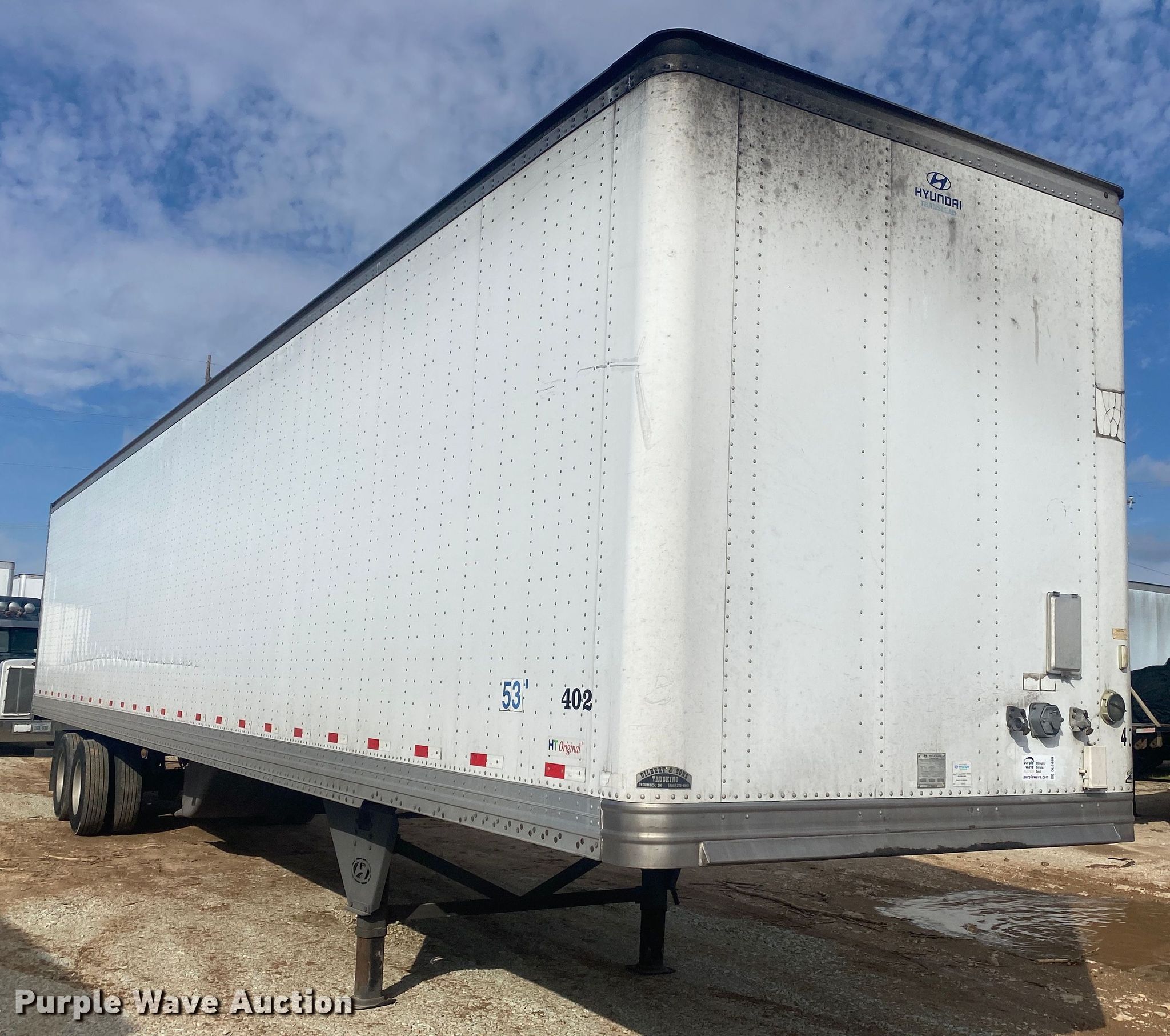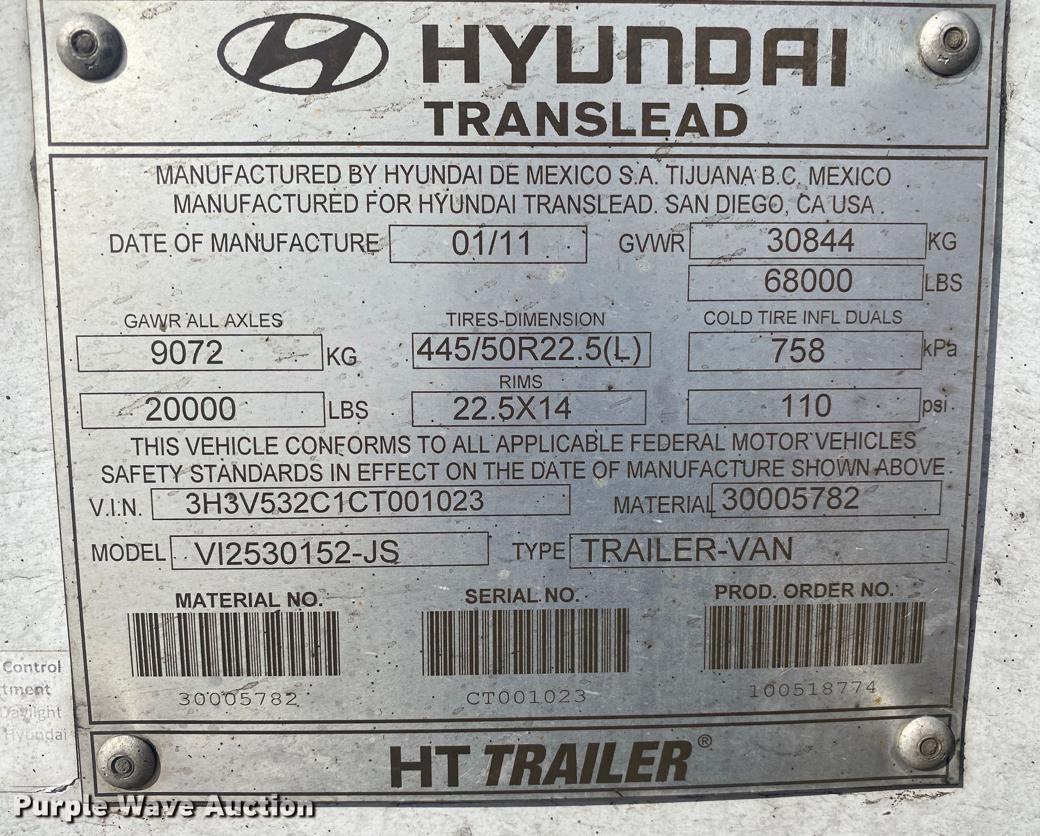2012 Hyundai Translead dry van trailer. VIN: 3H3V532C1CT001023, Unit #: 402. Dimensions Overall: 53' L x 102" W. Features Deck type: Wood. Chassis Landing gear: Dual, Two speed, Suspension: Spring, Brakes: Air, Axles: Tandem, GVWR: 68,000 lbs, GAWR: 20,000 lbs. Tires Aluminum wheels, Size: 275/80R22.5. Notes Body damage. Oklahoma title. Title distribution may be delayed up to 14 days from verification of funds. 14280 U.S. 177. Shawnee, OK 74804