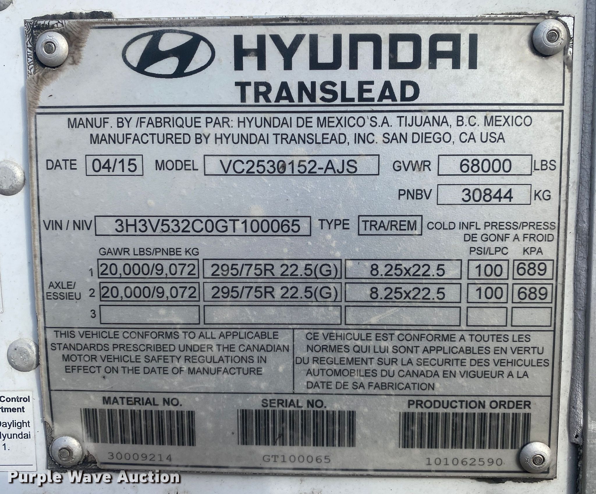 Purple Wave is selling a used Dry Van Trailer in Oklahoma. This item is a 2016 Hyundai Translead dry van trailer with the following: VIN: 3H3V532C0GT100065, Unit #: 405