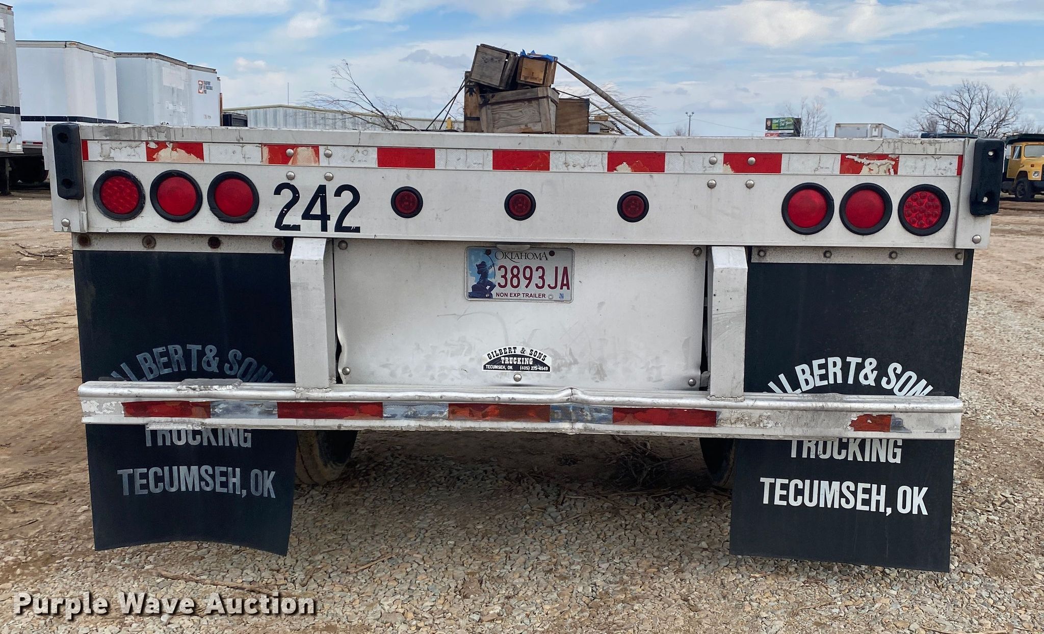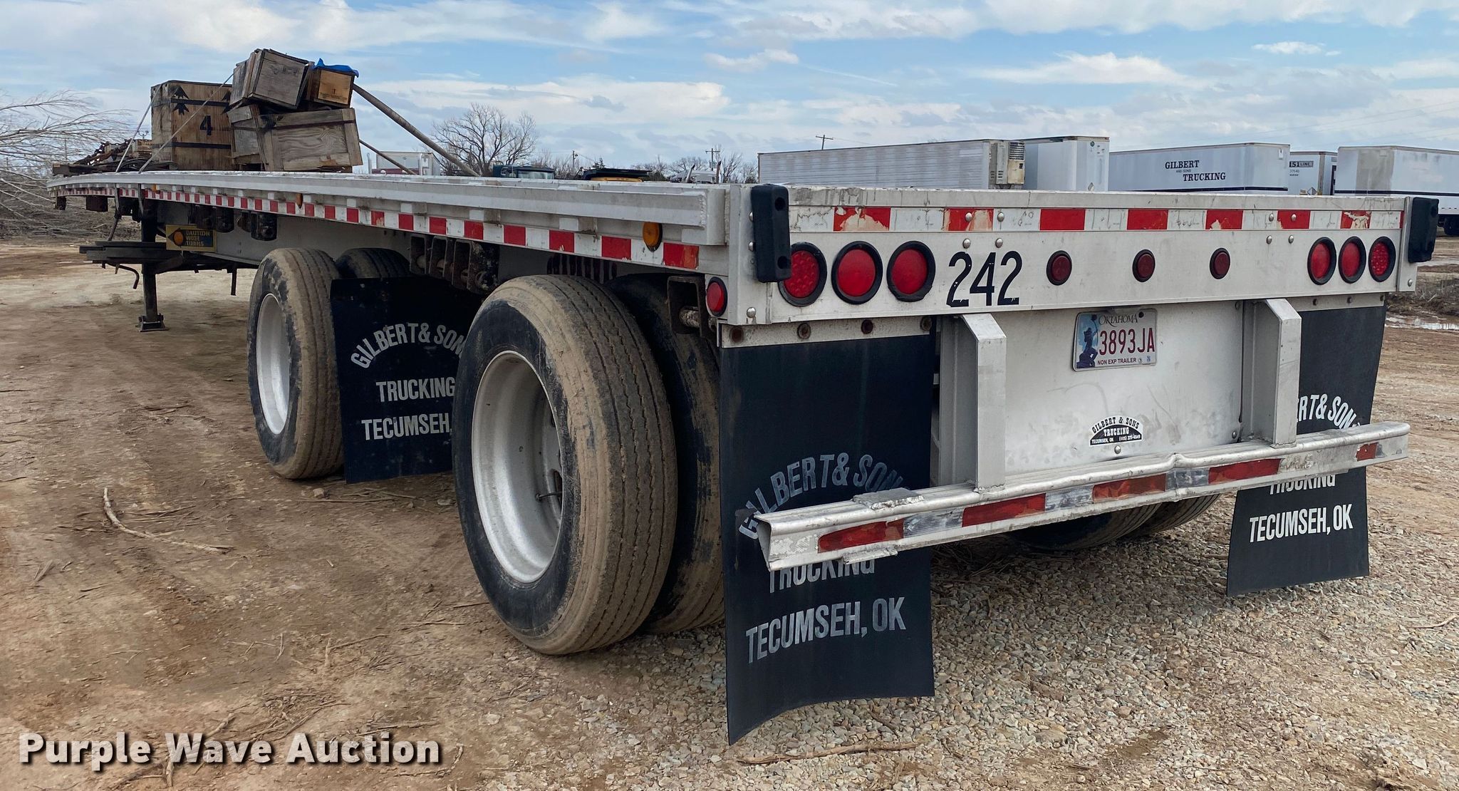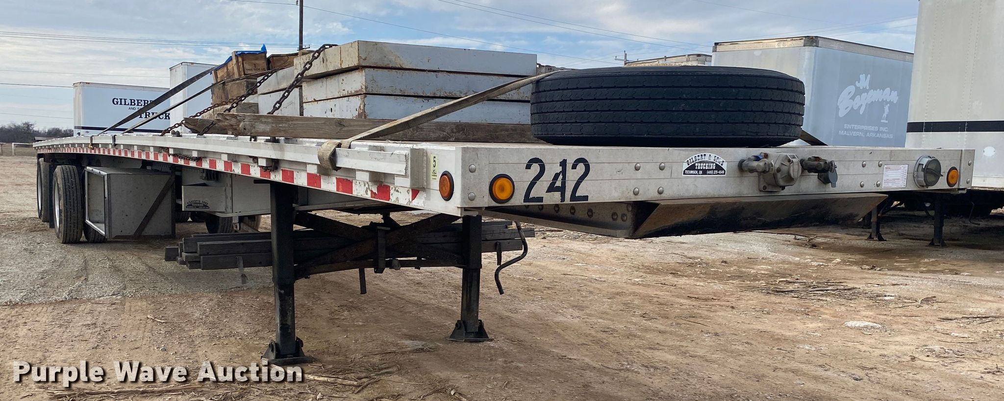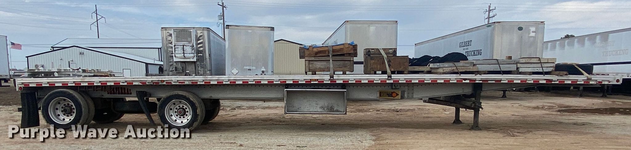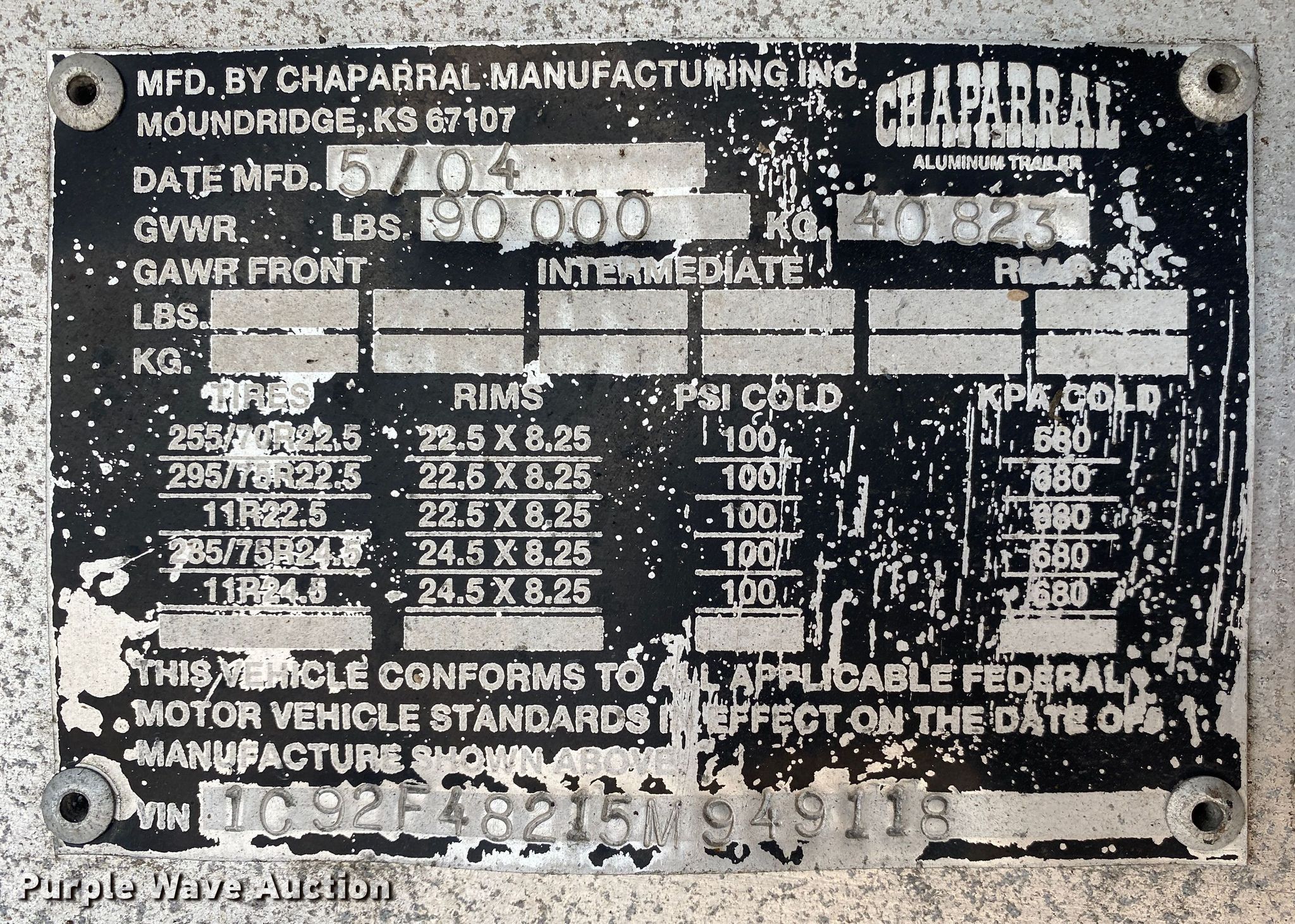 2005 Chaparral flatbed trailer. VIN: 1C92F48215M949118, Unit #: 242. Dimensions Overall: 53' L x 102" W. Features Deck type: Aluminum. Chassis Landing gear: Dual, Two speed, Suspension: Air, Brakes: Air, Axles: Tandem, GVWR: 90,000 lbs. Tires Aluminum wheels, Size: 275/70R22.5. Notes Contents not included. Oklahoma title. Title distribution may be delayed up to 14 days from verification of funds. 14280 U.S. 177. Shawnee, OK 74804