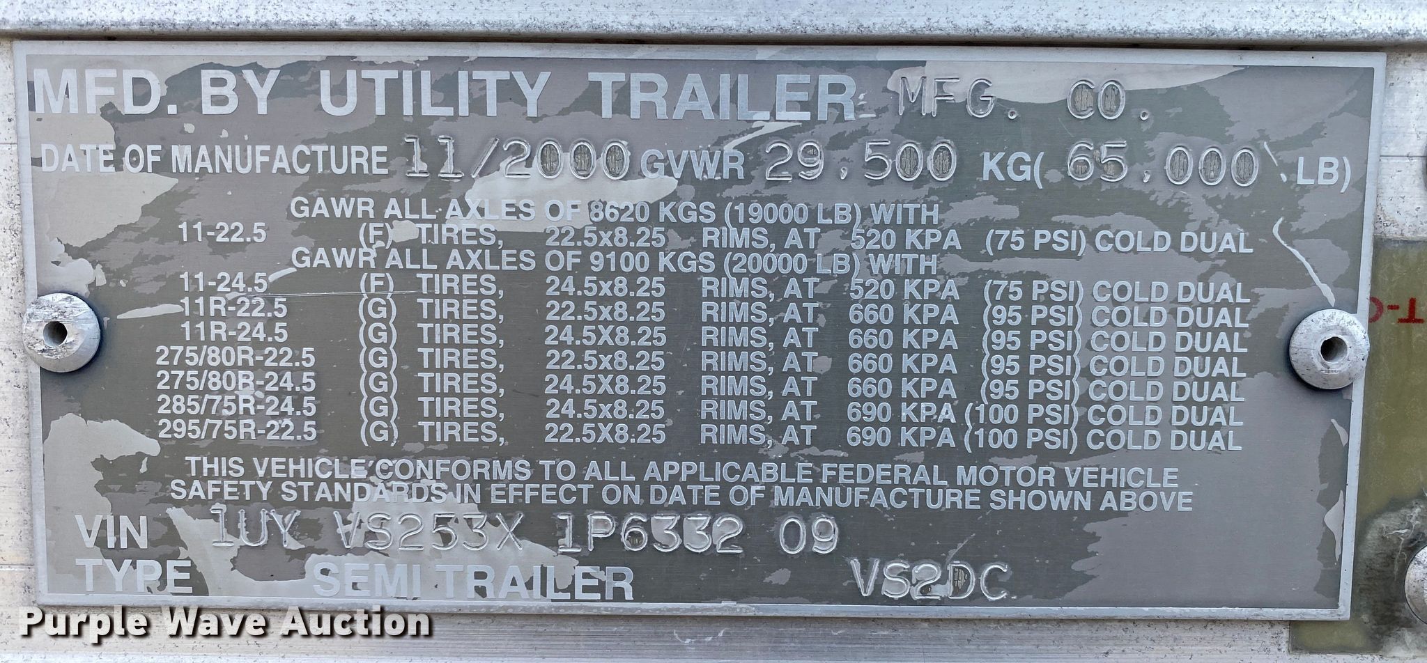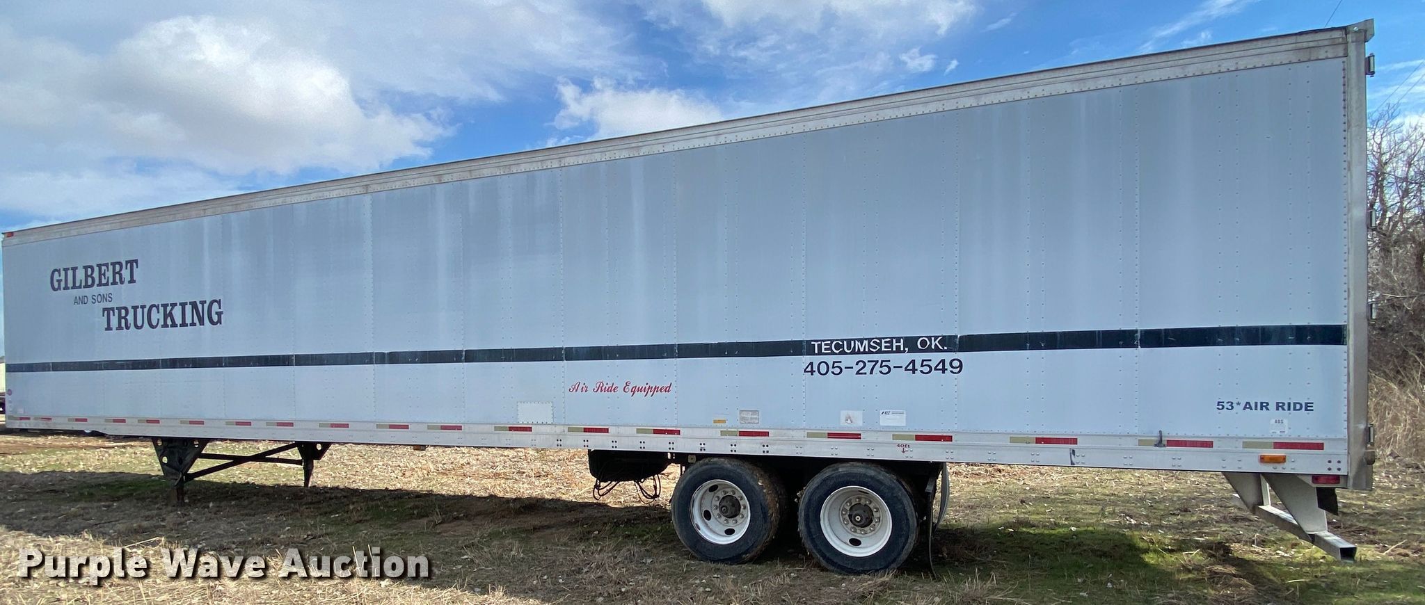 2001 Utility VS2DC dry van trailer. VIN: 1UYVS253X1P633209, Unit #: 376. Dimensions Overall: 53' L x 102" W. Features Deck type: Wood, E-track rail system. Chassis Landing gear: Dual, Two speed, Suspension: Air, Brakes: Air, Axles: Tandem, GVWR: 65,000 lbs, GAWR: 20,000 lbs. Tires Steel wheels, Size: 295/75R22.5. Notes Decals will be removed prior to auction. Oklahoma title. Title distribution may be delayed up to 14 days from verification of funds. 14280 U.S. 177. Shawnee, OK 74804