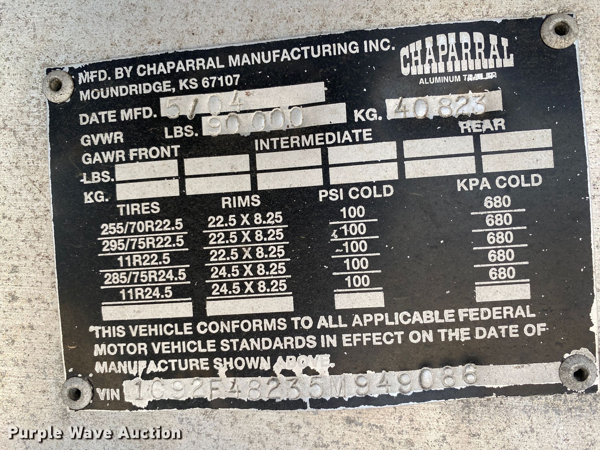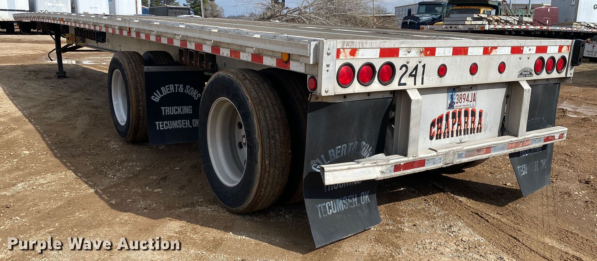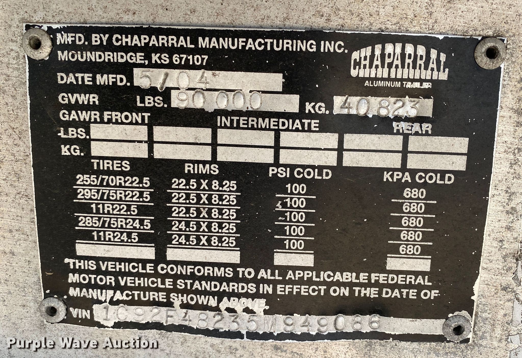 2005 Chaparral flatbed trailer. VIN: 1C92F48235M949086, Unit #: 241. Dimensions Overall: 53' L x 102" W. Features Deck type: Aluminum. Chassis Landing gear: Dual, Two speed, Suspension: Air, Brakes: Air, Axles: Spread, GVWR: 90,000 lbs. Tires Aluminum wheels, Size: 285/75R24.5. Oklahoma title. Title distribution may be delayed up to 14 days from verification of funds. 14280 U.S. 177. Shawnee, OK 74804