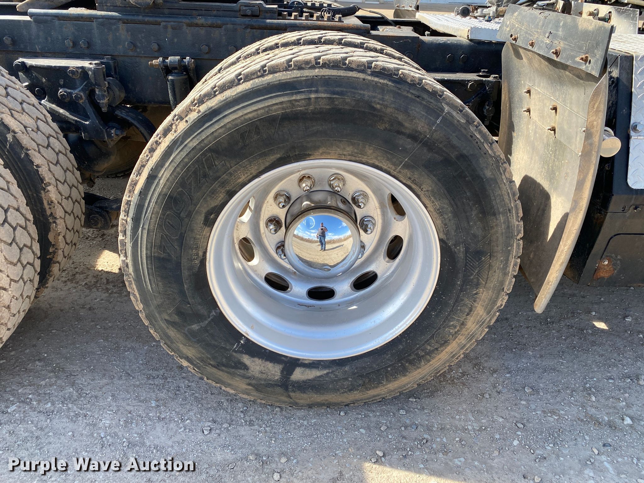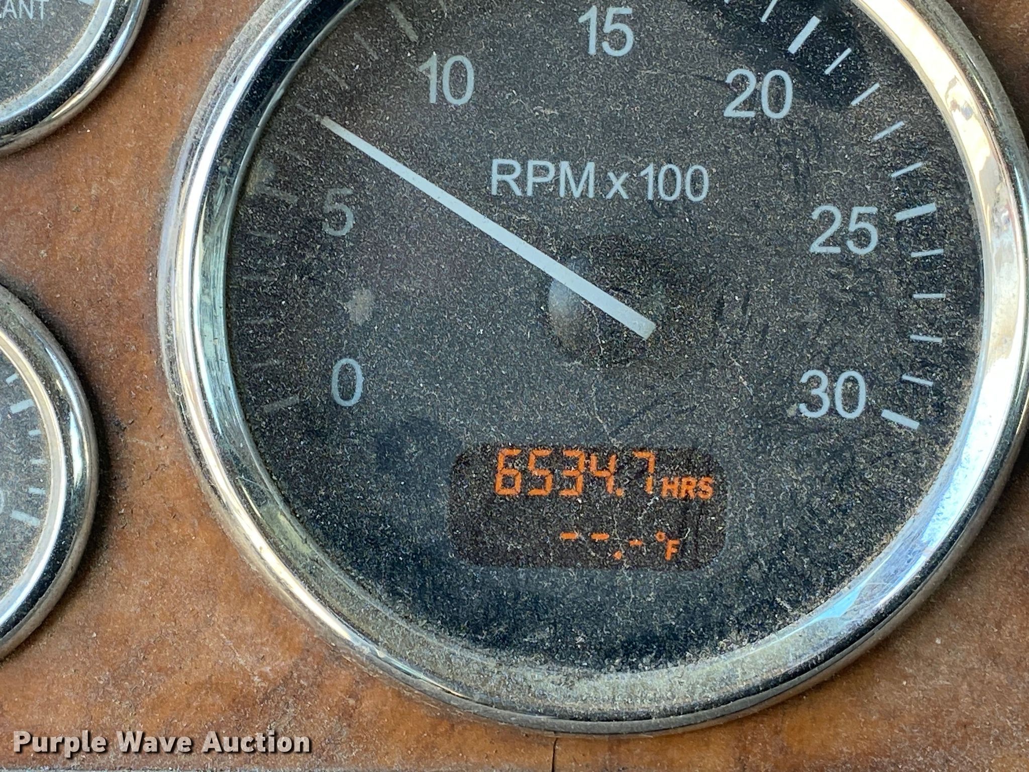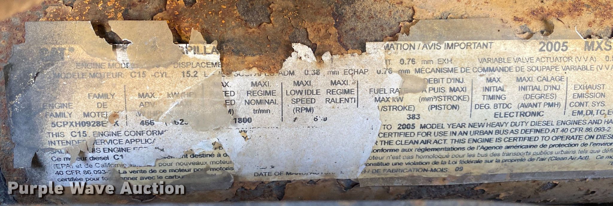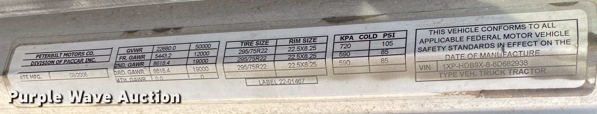 2008 Peterbilt 386 semi truck. Miles: 1,240,526 on odometer, Hours: 6,535 on meter, VIN: 1XPHDB9X88D682938. Engine Caterpillar C15, Displacement: 15.2L, Cylinders: 6, Fuel type: Diesel. Transmission Manual, Speed: 13. Chassis Axles: Tandem, Differential lock: Inter-axle, Suspension: Air Dump valves, Brakes: Air, GVWR: 50,000 lbs FAWR: 12,000 lbs, IAWR: 19,000 lbs, RAWR: 19,000 lbs. Interior AC, Heat, Power windows, Power locks, Cruise control, Air ride cab, Sleeper Unibilt, Sleeper length: 5', Beds: Double bunk, Refrigerator. Features Deck plate: Aluminum, Fifth wheel type: Air operated, Sliding, Fuel tank: Dual. Tires Size: 275/80R22.5. Notes Dash warning indicator: ABS, Windshield chipped or cracked. Oklahoma title. Title distribution may be delayed up to 14 days from verification of funds. 14280 U.S. 177. Shawnee, OK 74804