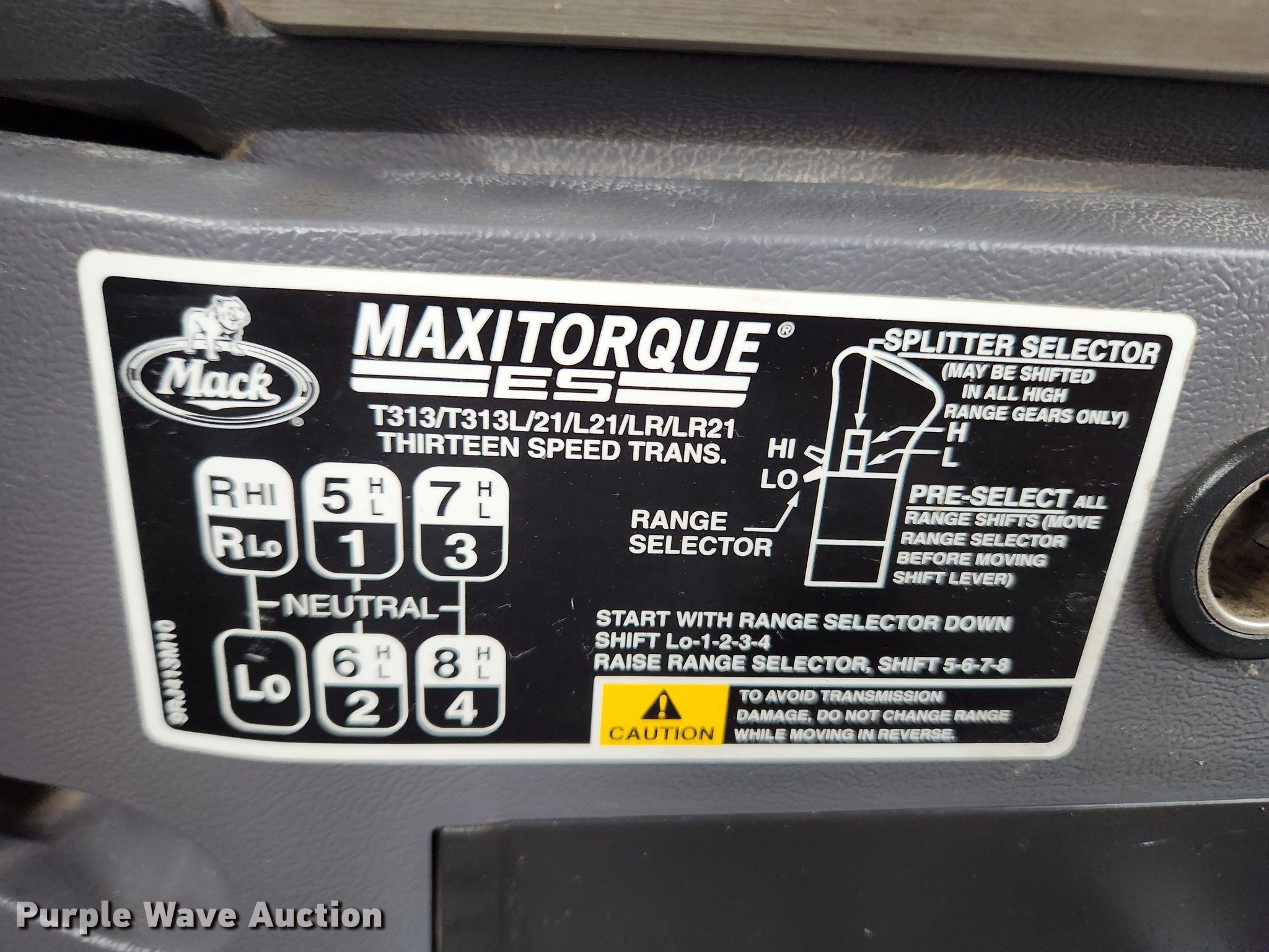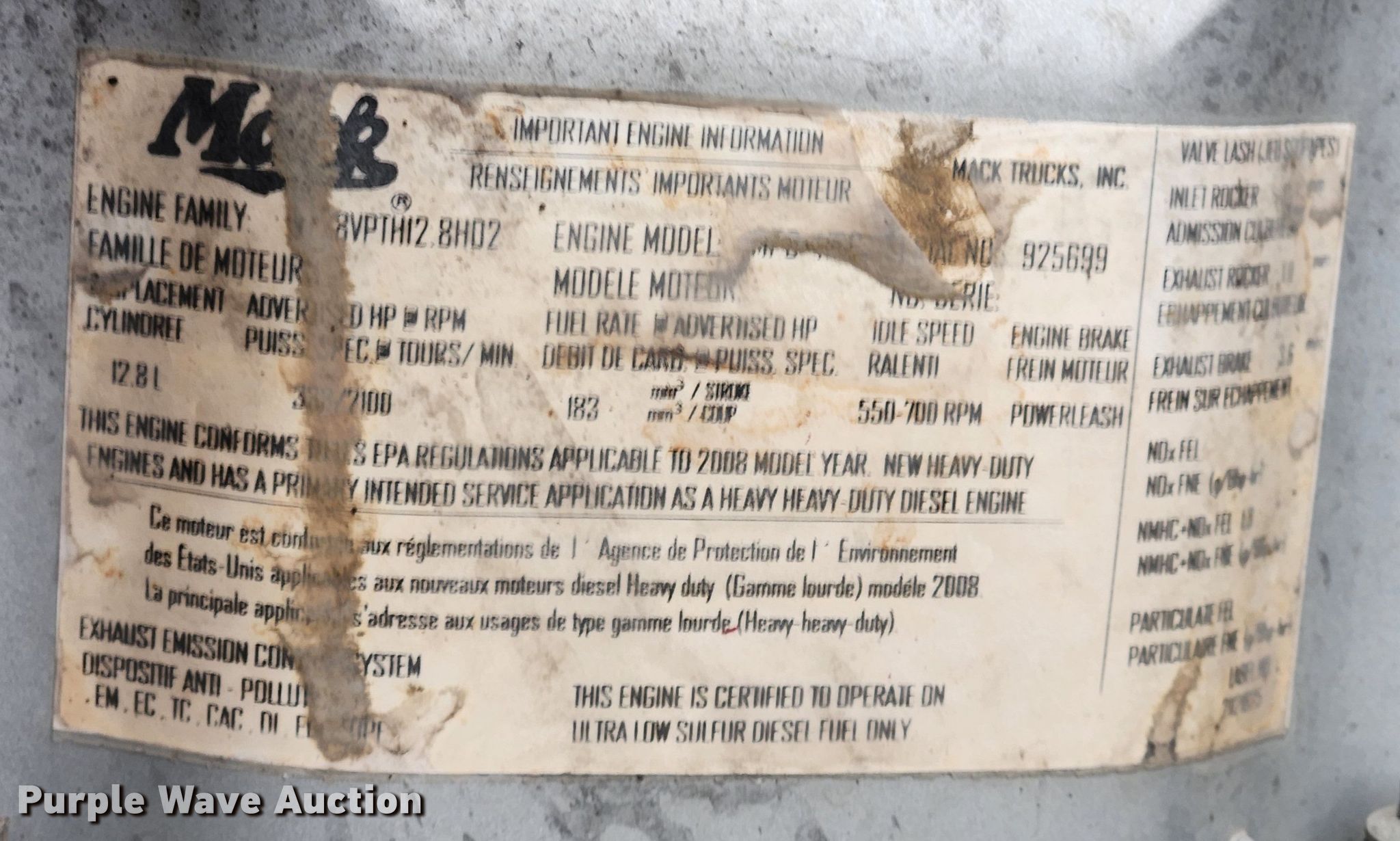 2009 Mack GU713 semi truck. Miles: 427,320 on odometer, Hours: 4,360 on meter, VIN: 1M1AX09Y59M007556. Engine Mack MP8, Serial: 925699, Displacement: 12.8L, Cylinders: 6, Fuel type: Diesel, Engine brake. Transmission Mack Maxitorque ES, Manual, Speed: 13. Chassis Axles: Tandem, Differential lock: Inter-axle, Suspension: Air, Brakes: Air, PTO, Wet kit, GVWR: 52,320 lbs FAWR: 14,320 lbs, IAWR: 19,000 lbs, RAWR: 19,000 lbs, Wheelbase: 213". Interior AC, Heat, Heated mirrors, Power locks, Cruise control, Air ride cab. Features Deck plate: Aluminum, Fifth wheel type: Air operated, Sliding, Fuel tank: Dual. Tires Size: 11R24.5. Notes DEF deleted, Dash warning indicator: ABS, Electronic throttle control. Illinois title. Title distribution may be delayed up to 14 days from verification of funds. G.A.S.A. Leasing Inc.. Pontoon Beach, IL 62040
