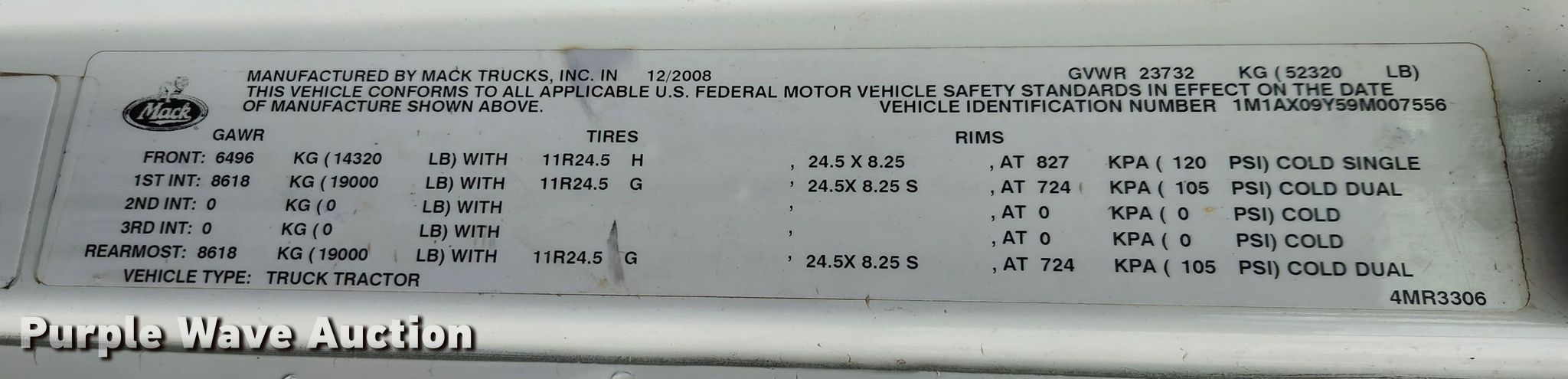 Purple Wave is selling a used Truck Tractor in Illinois. This item is a 2009 Mack GU713 semi truck with the following: Miles: 427,320 on odometer, Hours: 4,360 on meter, VIN: 1M1AX09Y59M007556