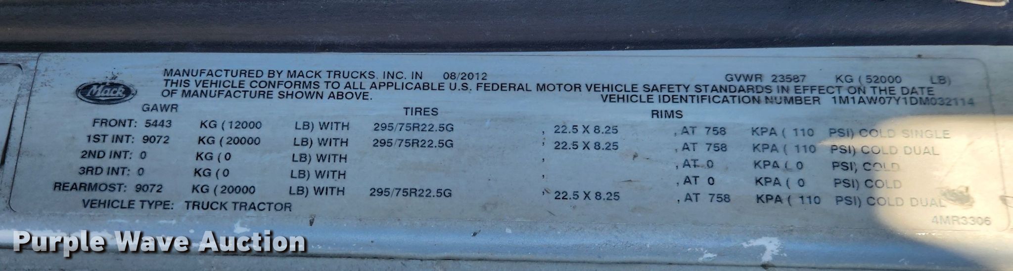 Purple Wave is selling a used Truck Tractor in Illinois. This item is a 2013 Mack CXU613 semi truck with the following: Miles: 663,617 on odometer, Hours: 23,493 on meter, VIN: 1M1AW07Y1DM032114
