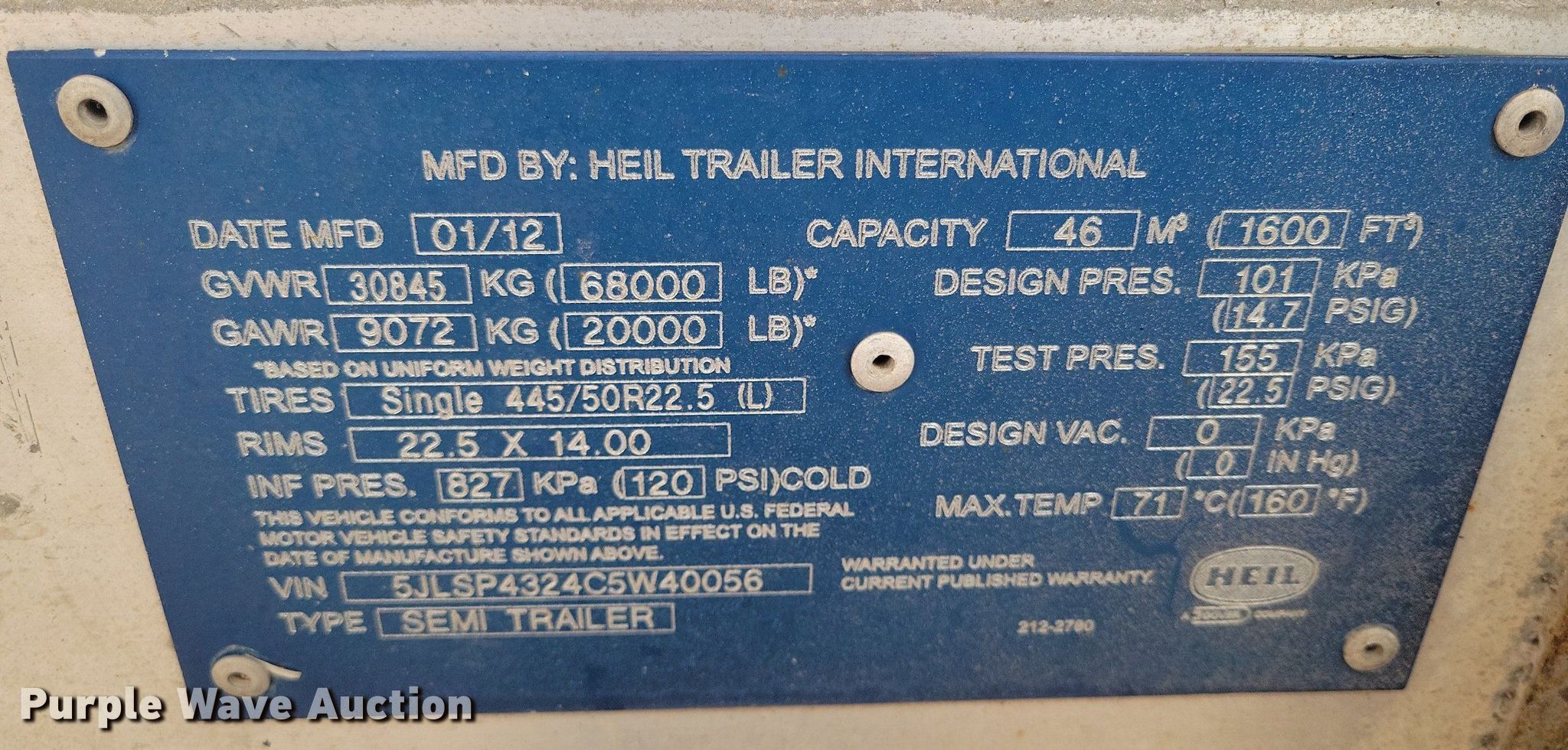 Purple Wave is selling a used Tank Trailer in Texas. This item is a 2012 Heil pneumatic dry bulk trailer with the following: VIN: 5JLSP4324C5W40056