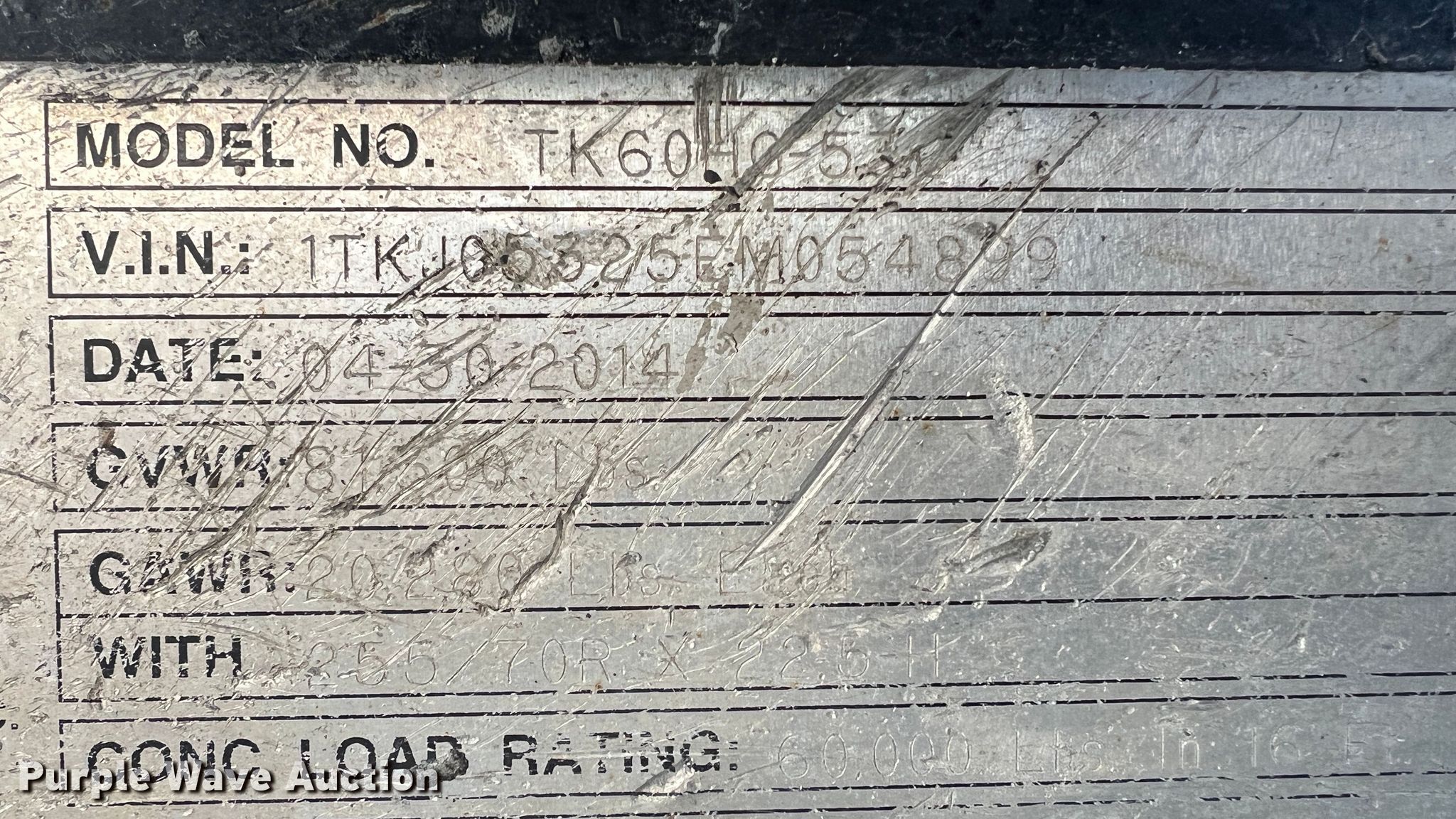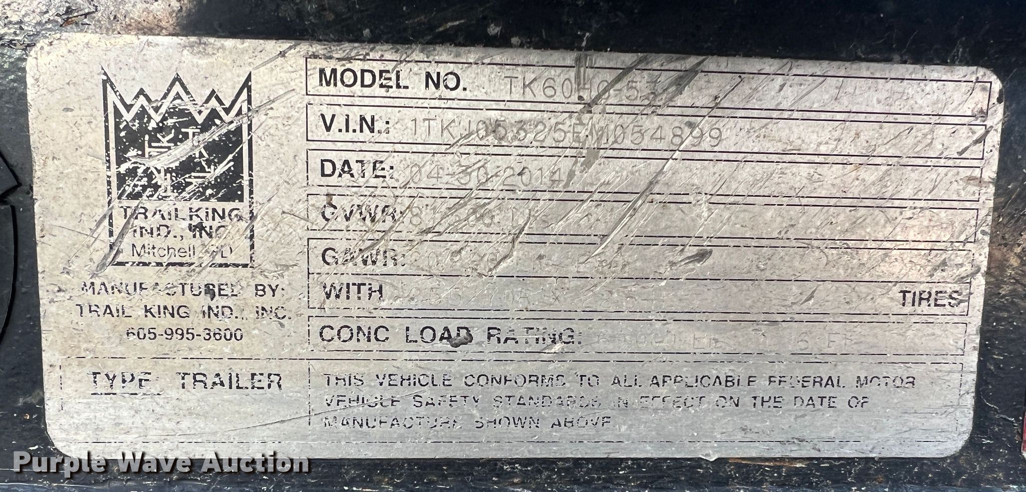 Purple Wave is selling a used Equip. Trailer in Missouri. This item is a 2014 Trail King TK60HG-53C lowboy equipment trailer with the following: VIN: 1TKJ05325EM054899
