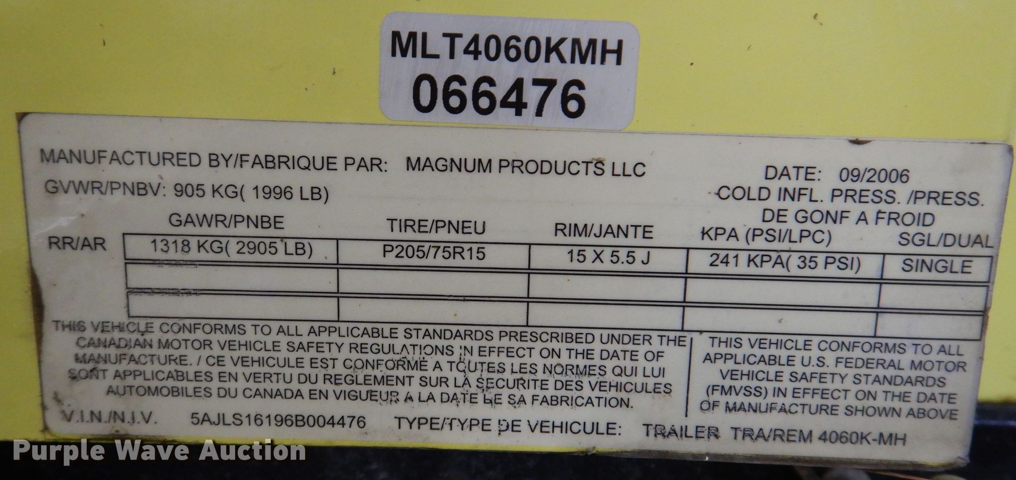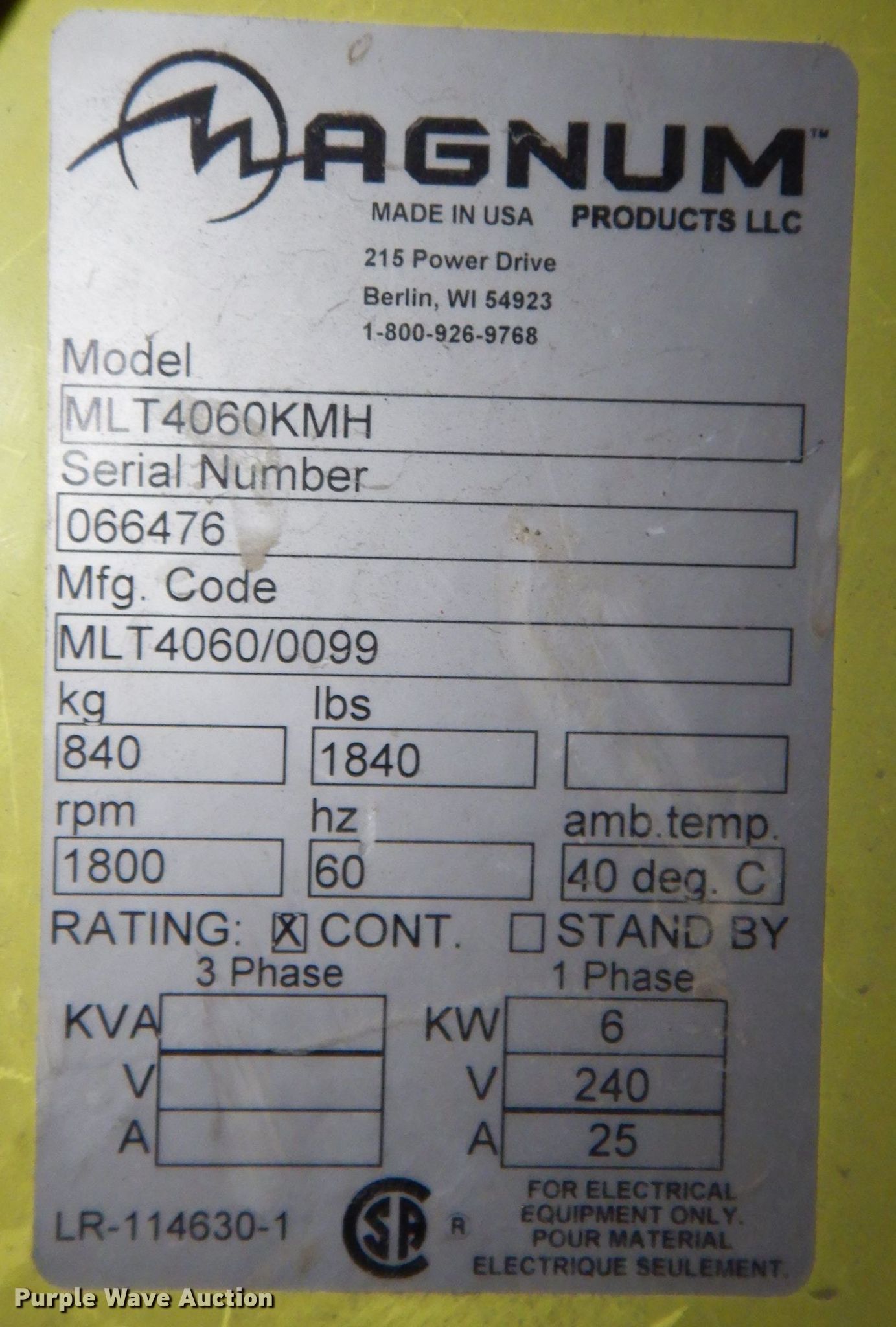 Purple Wave is selling a used Light Plant in Iowa. This item is a 2006 Magnum MLT4060KMH light plant with the following: Hours: 1,818 on meter, VIN: 5AJLS16196B004476, Serial: 066476