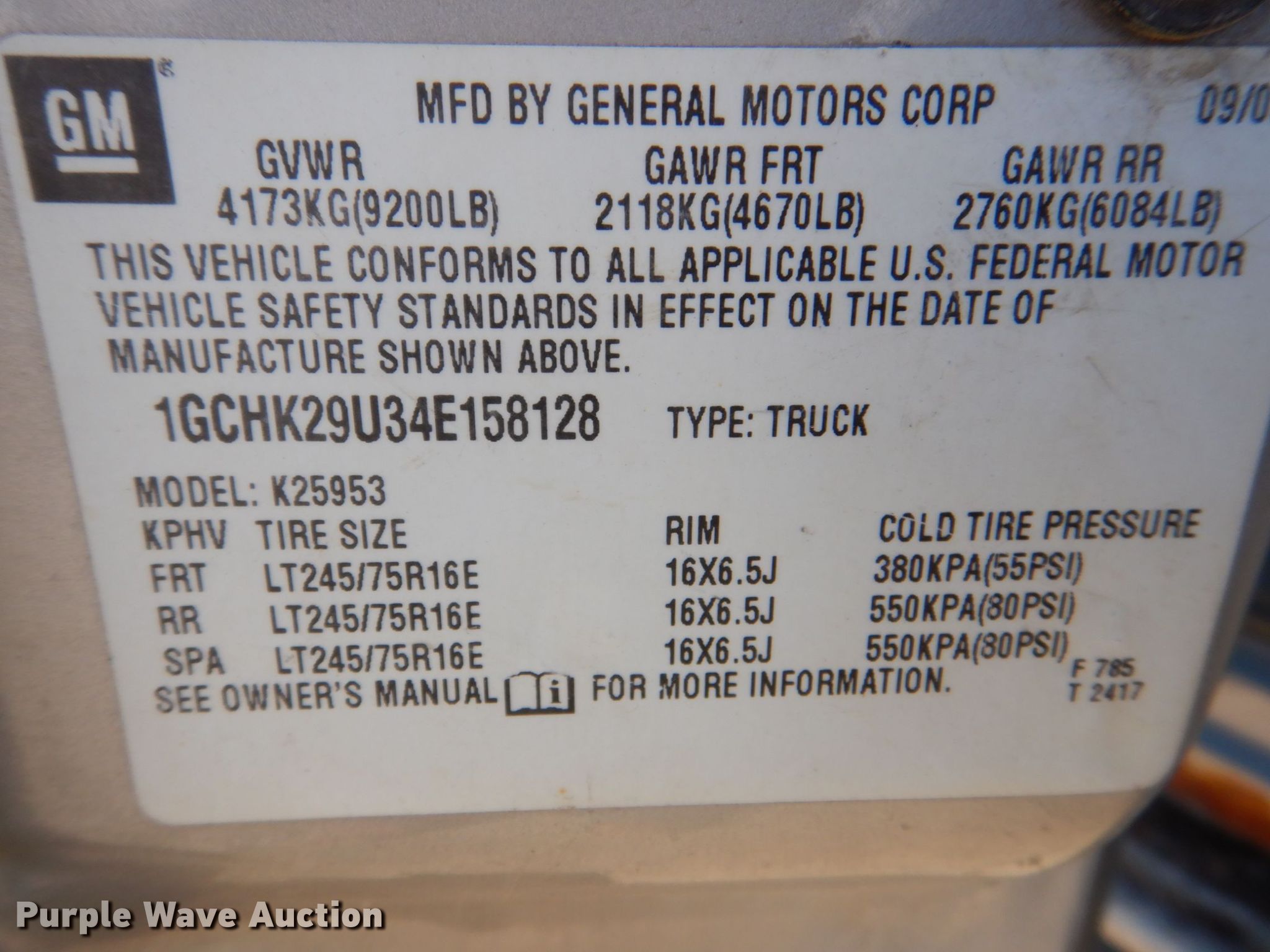 2004 Chevrolet Silverado 2500HD pickup truck. Miles: 124,371 on odometer, Miles or hours may vary, unit still in use, VIN: 1GCHK29U34E158128. Engine Displacement: 6.0L V8 OHV, Cylinders: 8, Fuel type: Gas. Transmission Automatic, Four wheel drive. Interior AC, Heat, Power windows, Power locks, Cruise control. Tires Size: LT245/75R16. Notes Dash warning indicator: ABS, Strong interior odor. Iowa title. Title distribution may be delayed up to 14 days from verification of funds. Carter and Associates Retirement - Open Inspection March 4th and March 8th. 395 Westcor Drive. Coralville, IA 52241