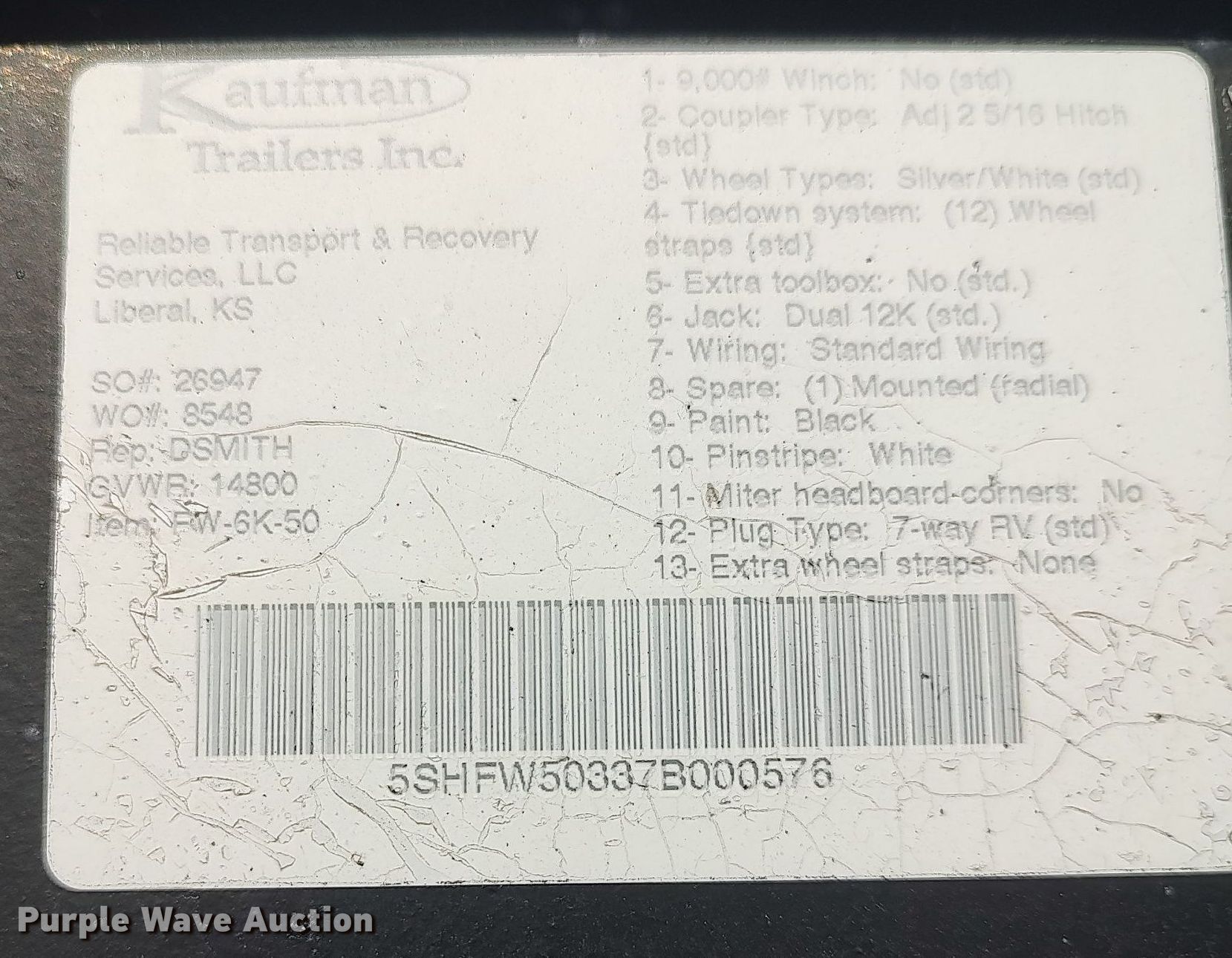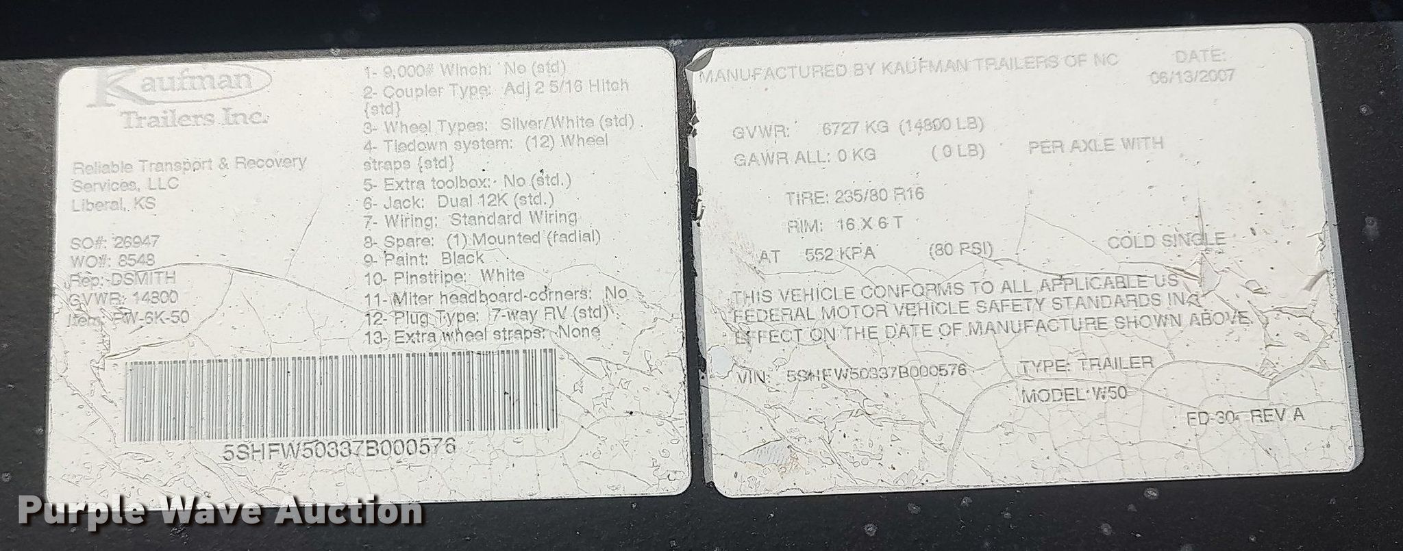Purple Wave is selling a used Car Carrier in Kansas. This item is a 2007 Kaufman W50 car carrier with the following: VIN: 5SHFW50337B000576