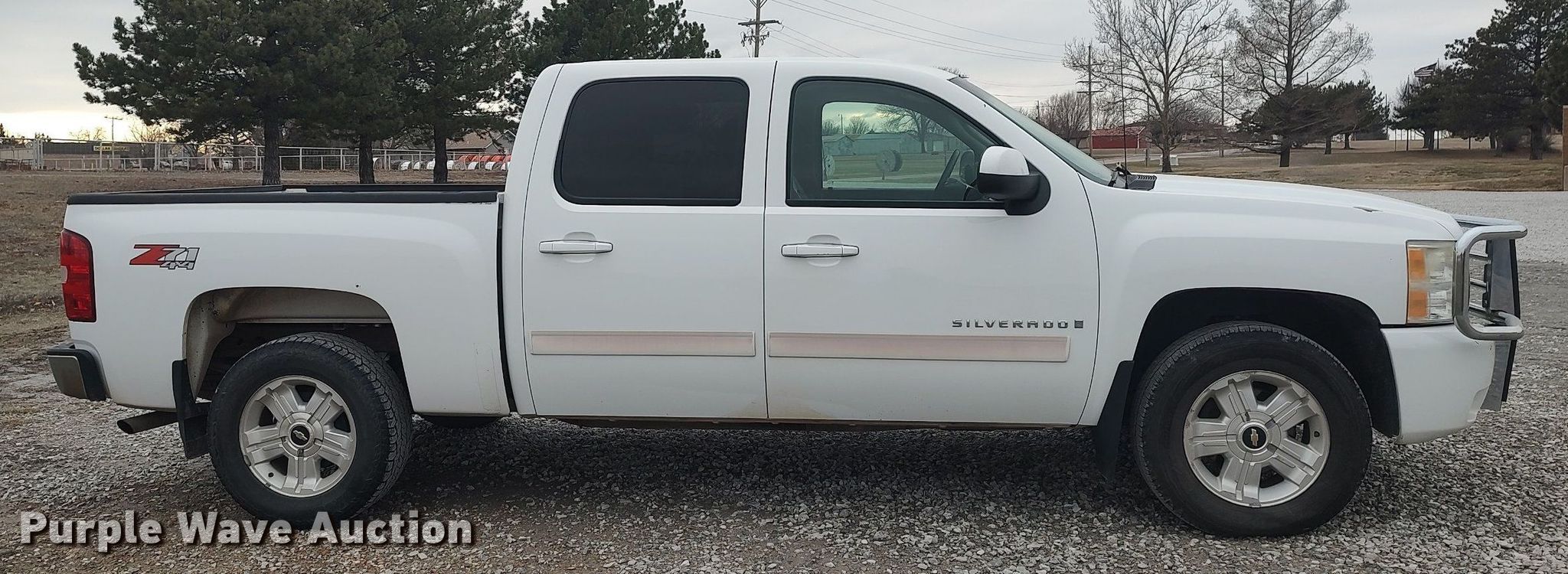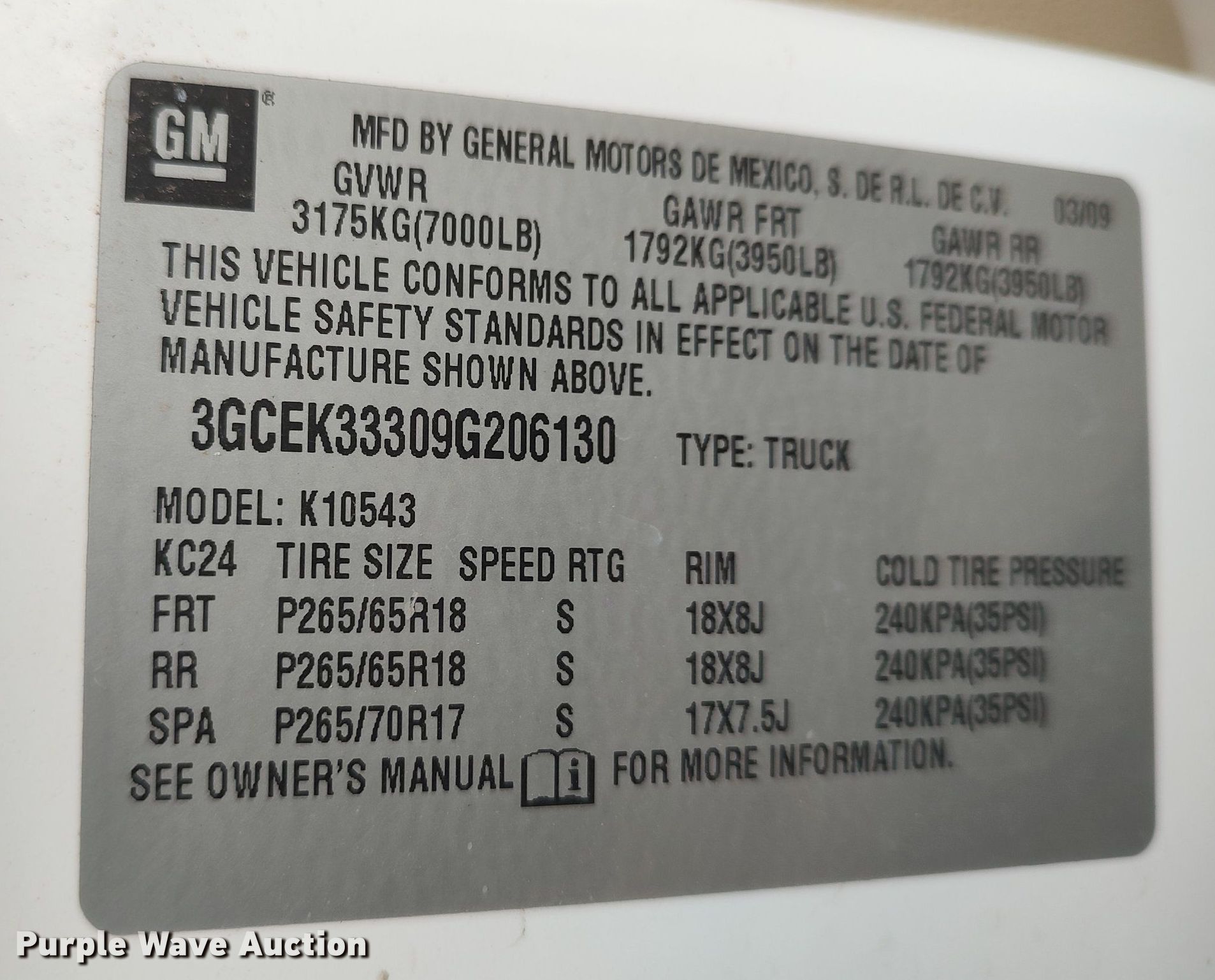 2009 Chevrolet Silverado 1500 LTZ Crew Cab pickup truck. Miles: 111,793 on odometer, VIN: 3GCEK33309G206130. Engine Displacement: 5.3L V8 OHV, Cylinders: 8, Fuel type: Gas. Transmission Automatic, Four wheel drive. Interior AC, Heat, Seat: Heated, Power driver, Power passenger, Heated mirrors, Power windows, Power locks, Cruise control. Tires Size: 265/65R18. Notes Dash warning indicator: TPMS. Kansas title. Title distribution may be delayed up to 14 days from verification of funds. 100 Kanokla Avenue. Caldwell, KS 67022