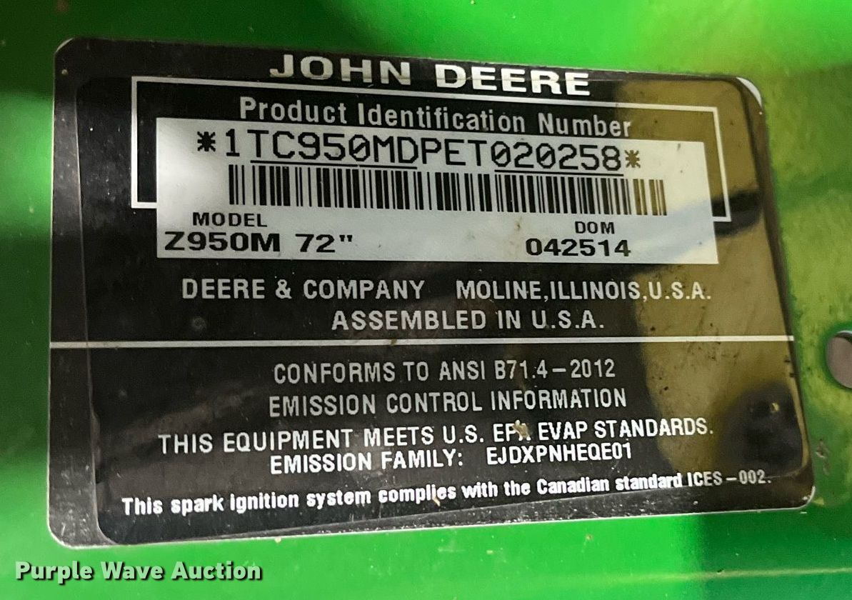Purple Wave is selling a used Commercial Turf Mower in Kansas. This item is a John Deere Z950M ZTR lawn mower with the following: Hours: 409 on meter, Cutting width: 72", Serial: 1TC950MDPET020258