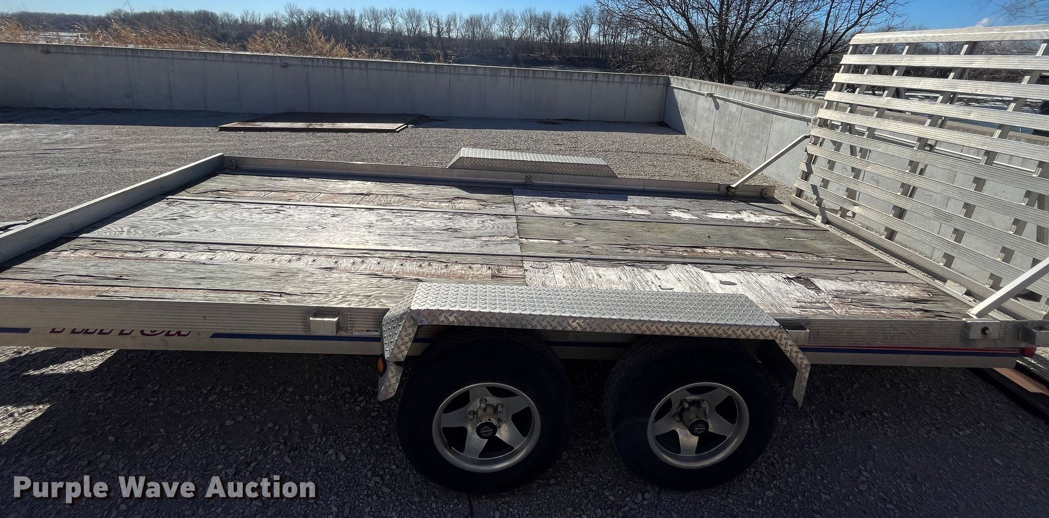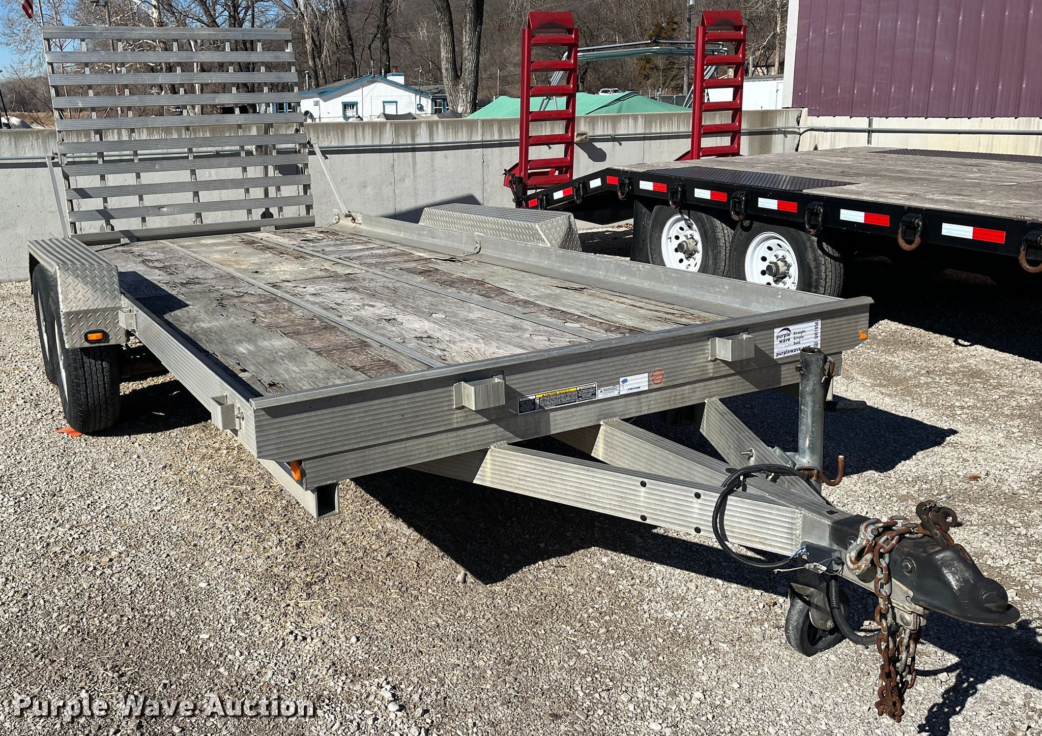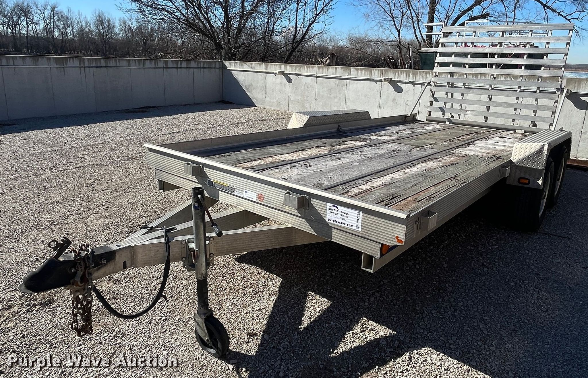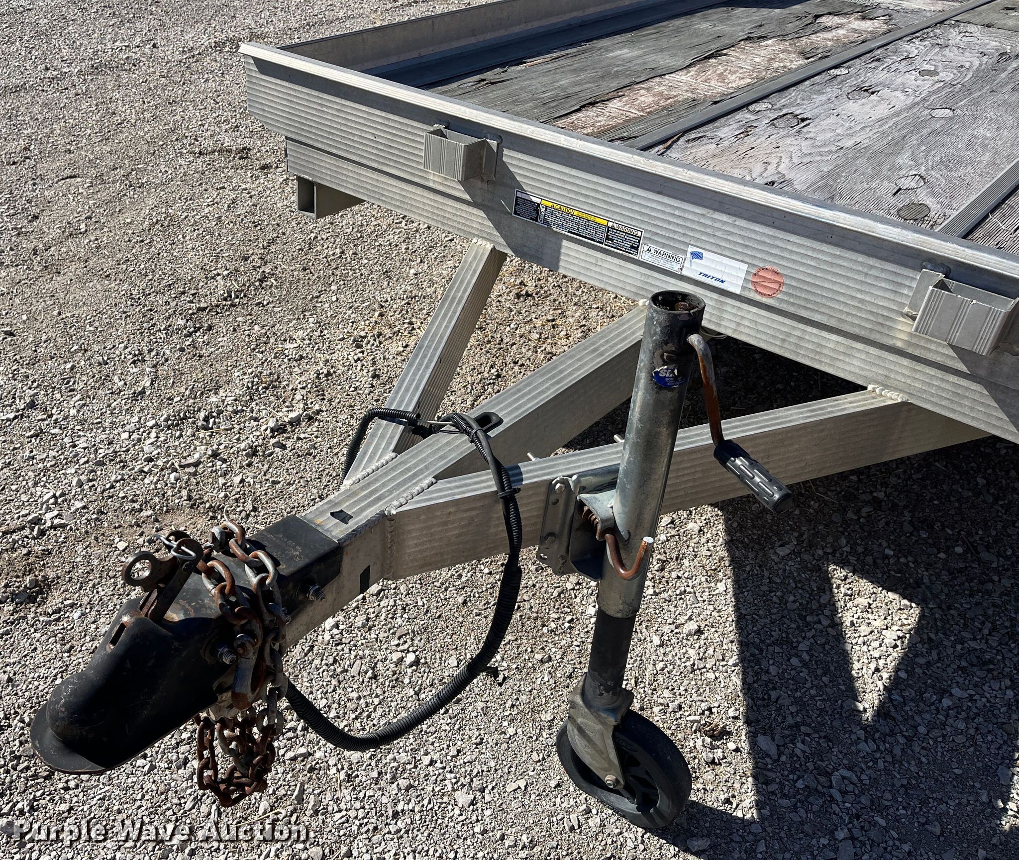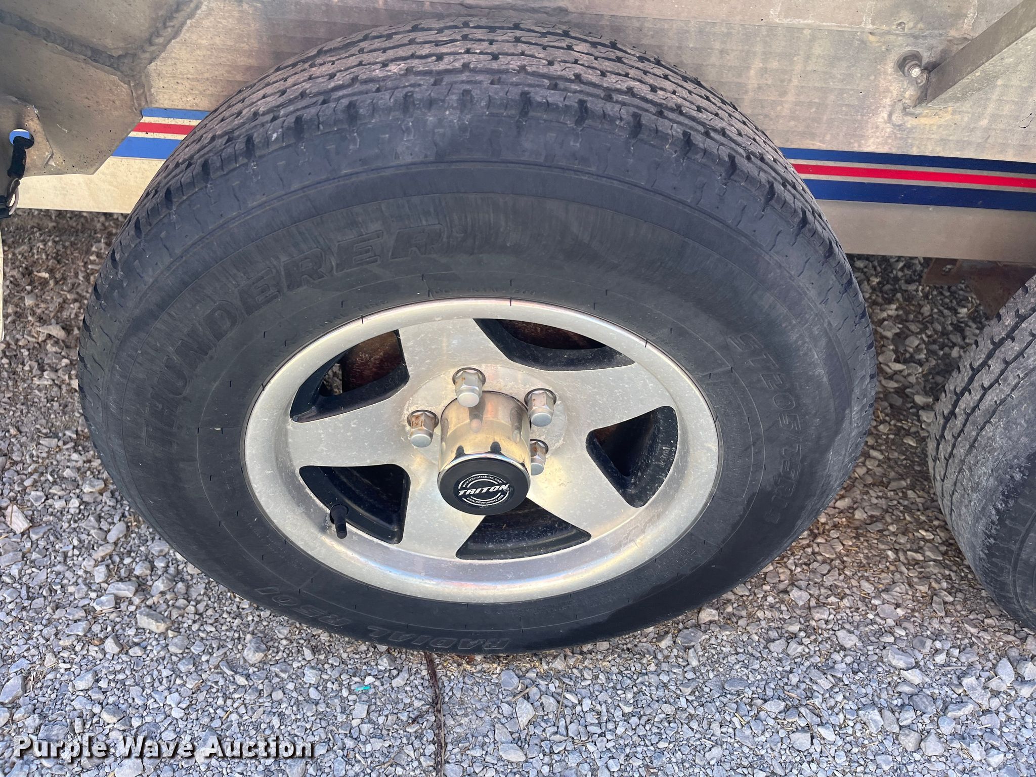 2007 Triton equipment trailer. VIN: 4TCSU216X7HH01285. Dimensions Overall: 19' 8" L x 96" W, Deck: 16' L x 82" W, Ramp: Manual Length: 60". Features Aluminum construction, Deck type: Wood. Chassis Ball hitch: 2 5/16", Landing gear: Single, Brakes: Electric, Axles: Tandem, GVWR: 7,000 lbs, GAWR: 3,500 lbs. Tires Aluminum wheels, Size: 205/75R14. Missouri title. Ball Power Equipment. 7603 Northwest River Park Drive. Parkville, MO 64152