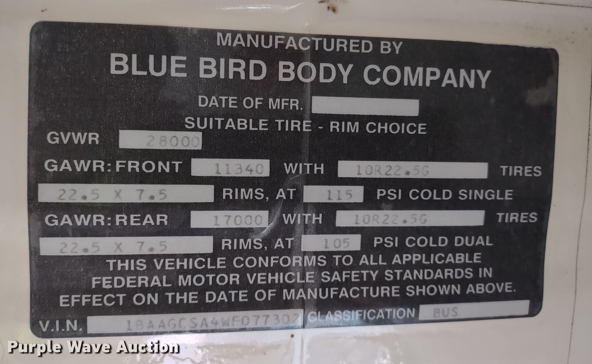 Purple Wave is selling a used Bus in Kansas. This item is a 1998 Blue Bird TC2000 school bus with the following: Miles: 108,108 on odometer, Hours: 7,541 on meter, VIN: 1BAAGCSA4WF077302