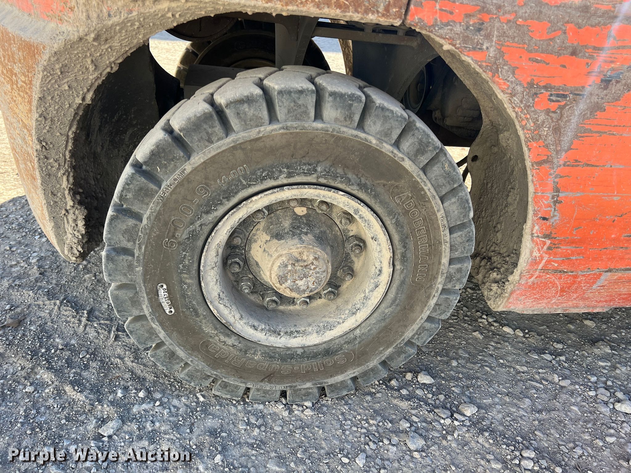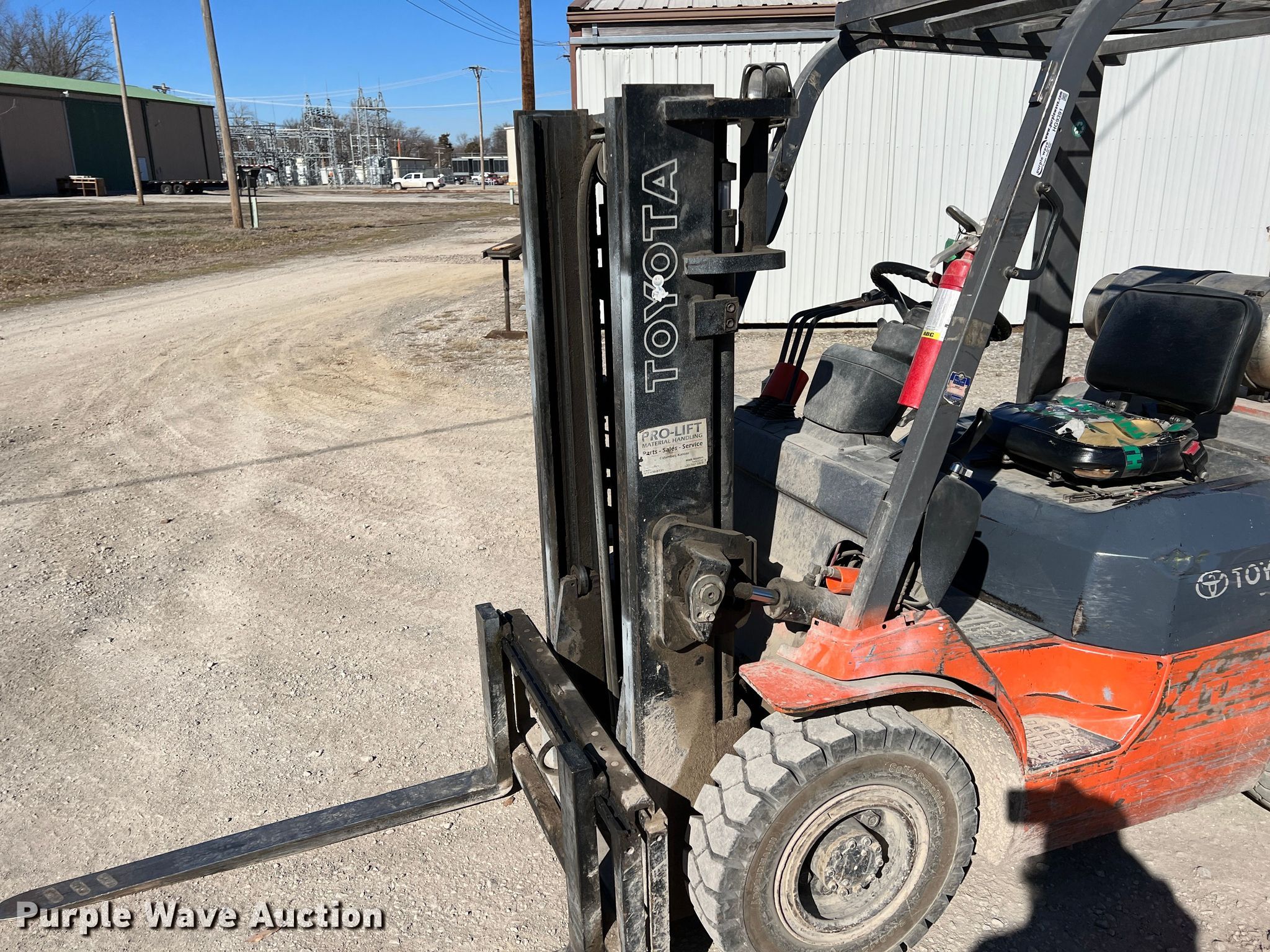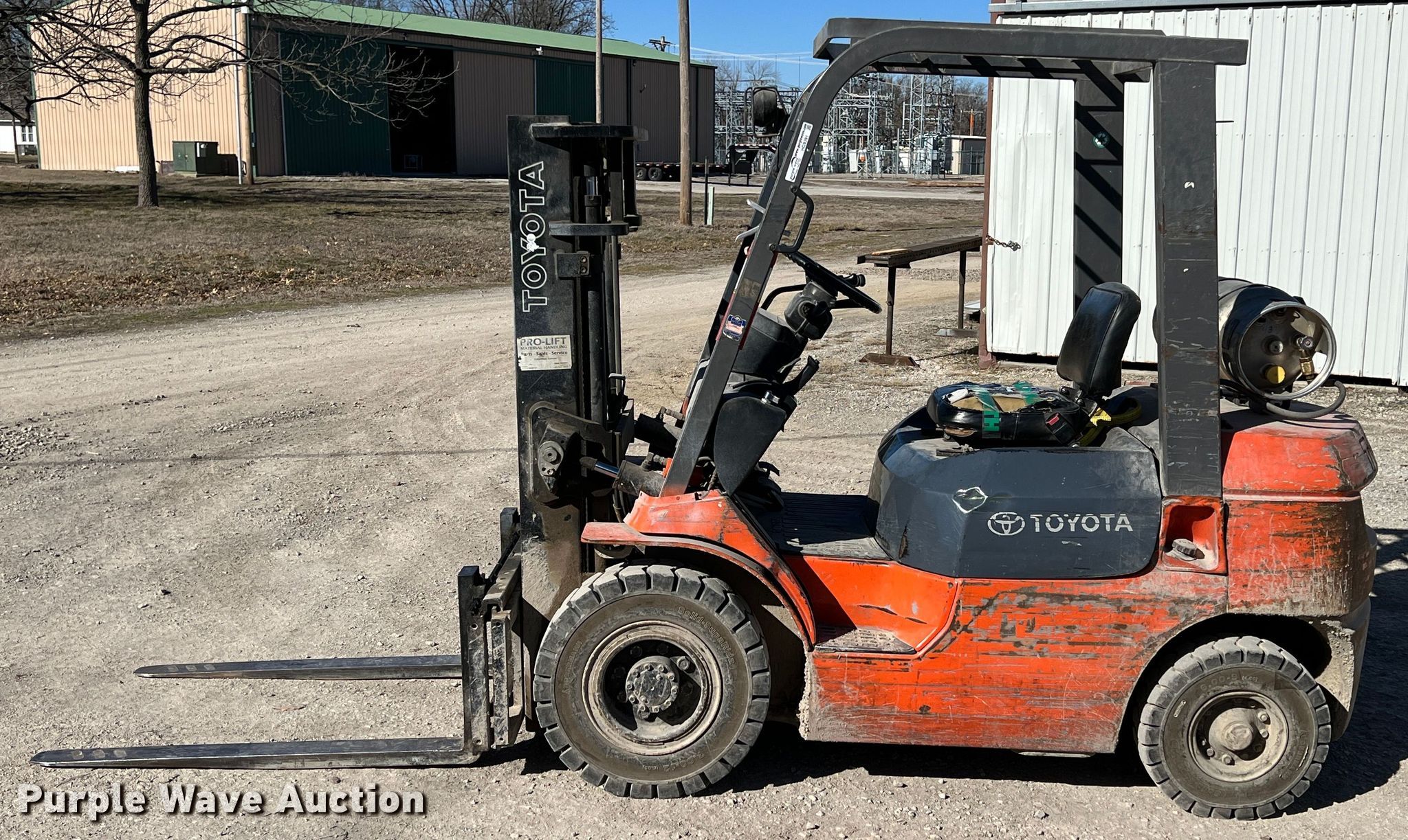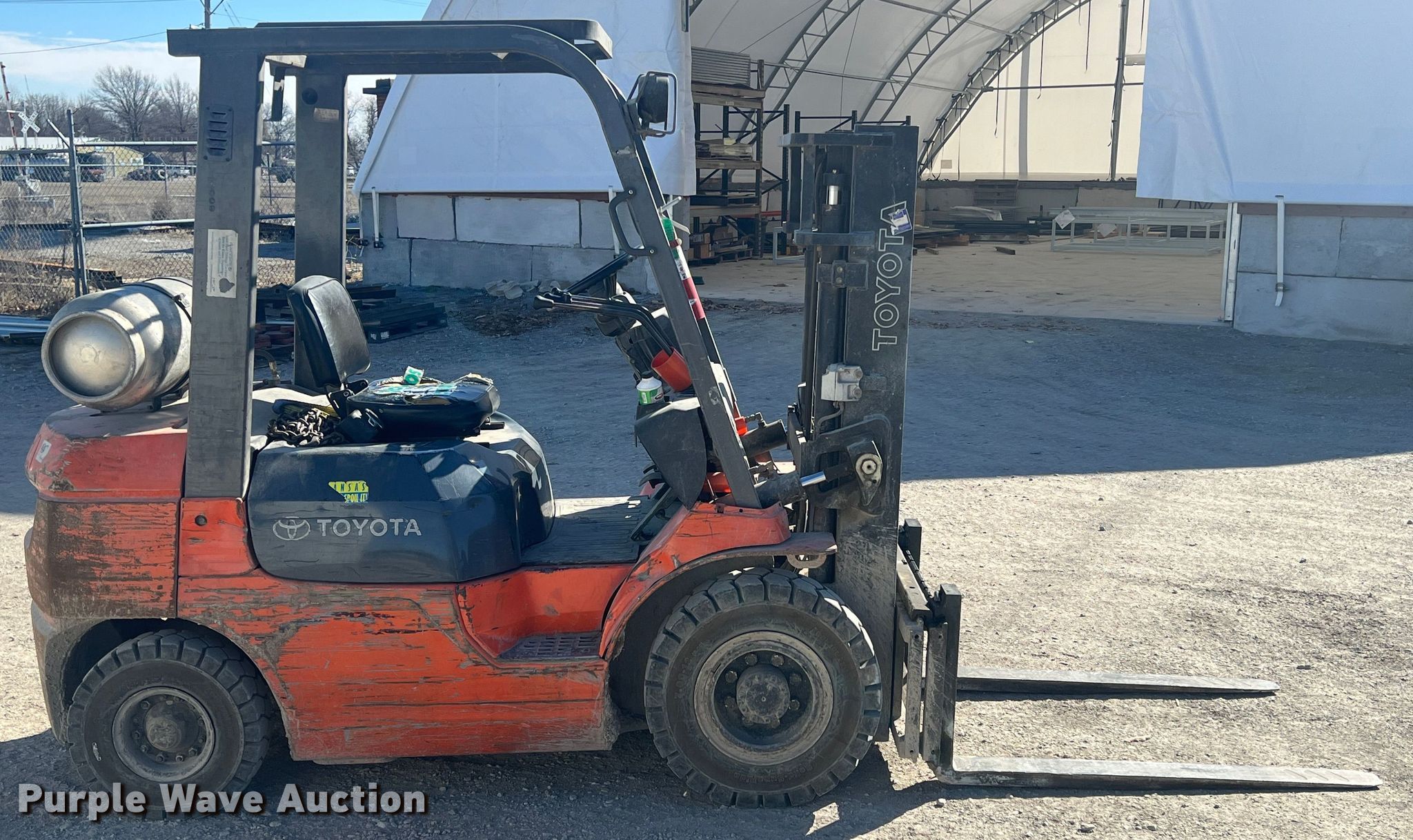 Purple Wave is selling a used Cushion Tire or Pneumatic Forklift in Kansas. This item is a Toyota forklift with the following: Cylinders: 4, Fuel type: LPG, LP bottle: Not included