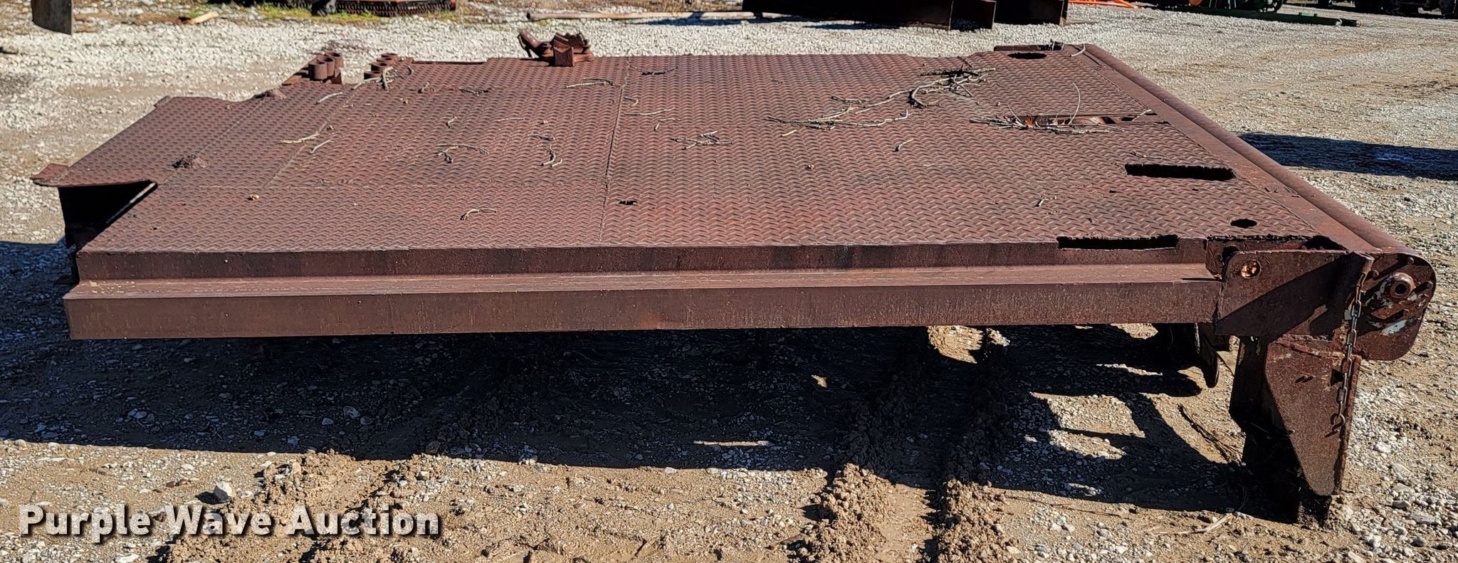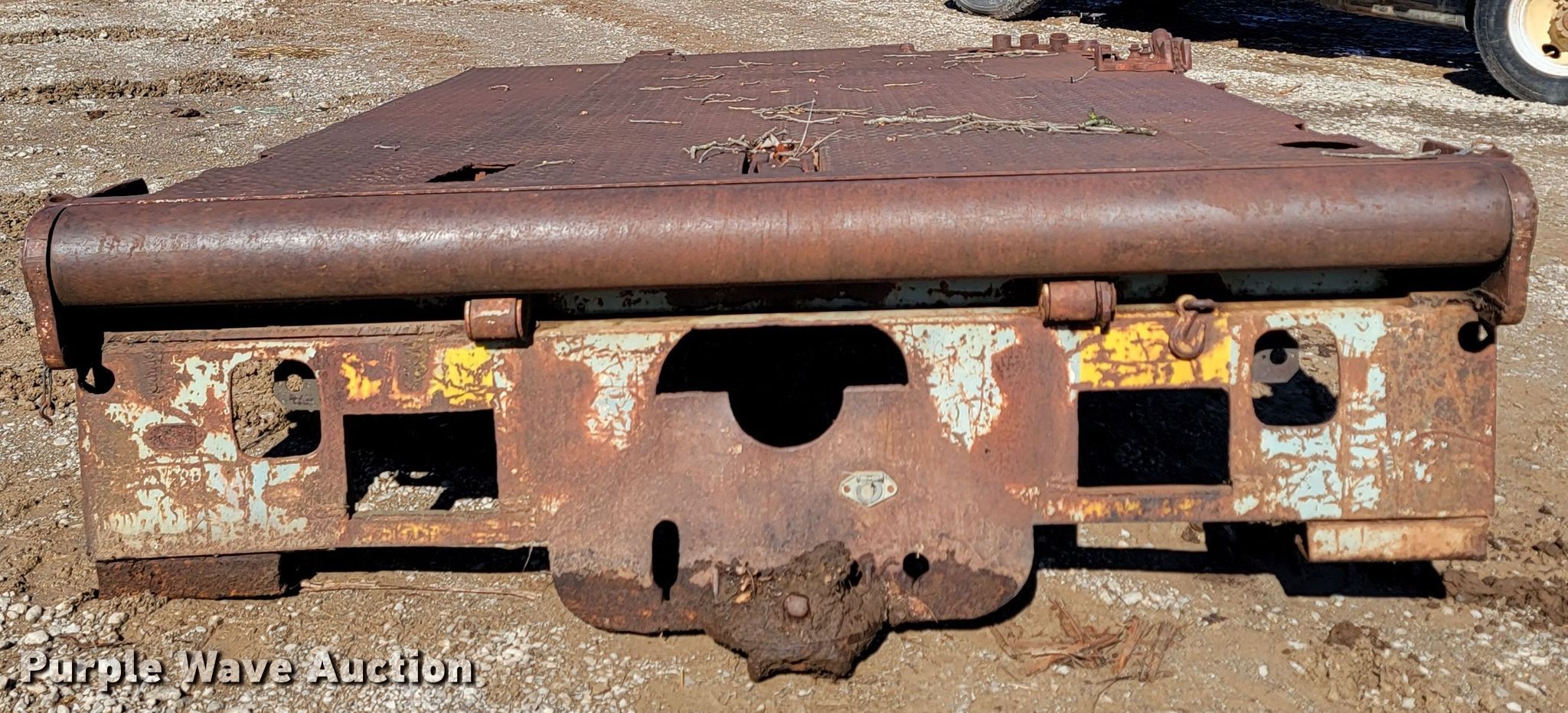 Truck bed. 9' 8" L x 96" W, Rolling tailboard, Chain clamp. JBK Well Service. Barnsdall, OK 74002