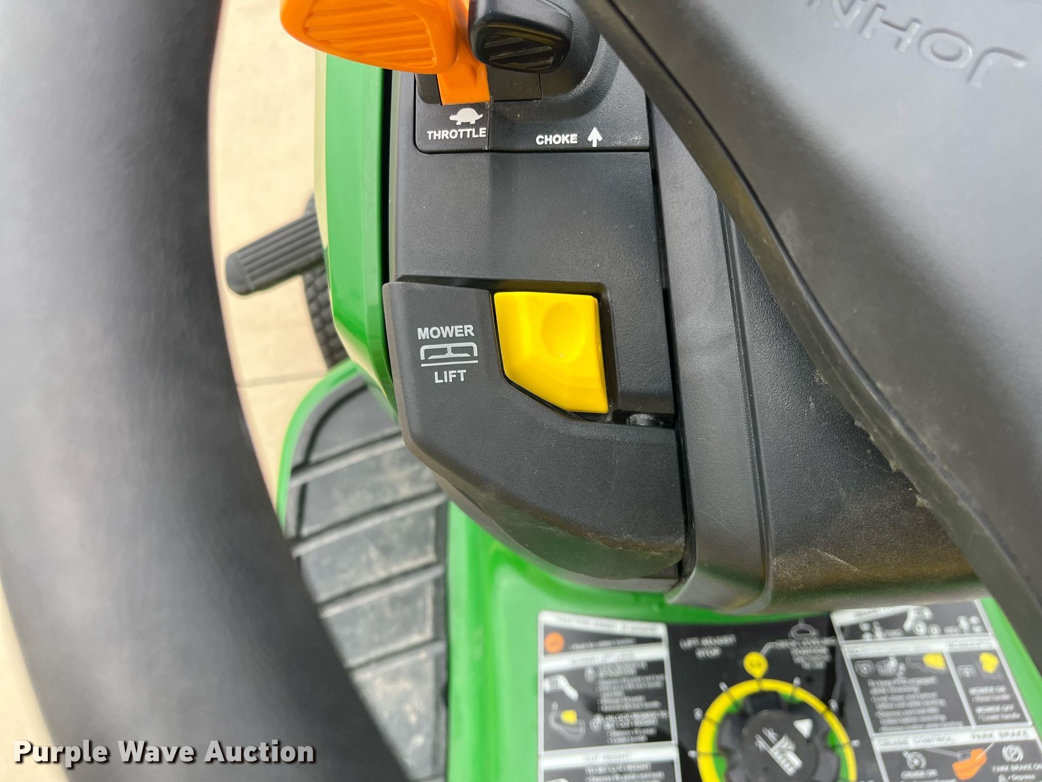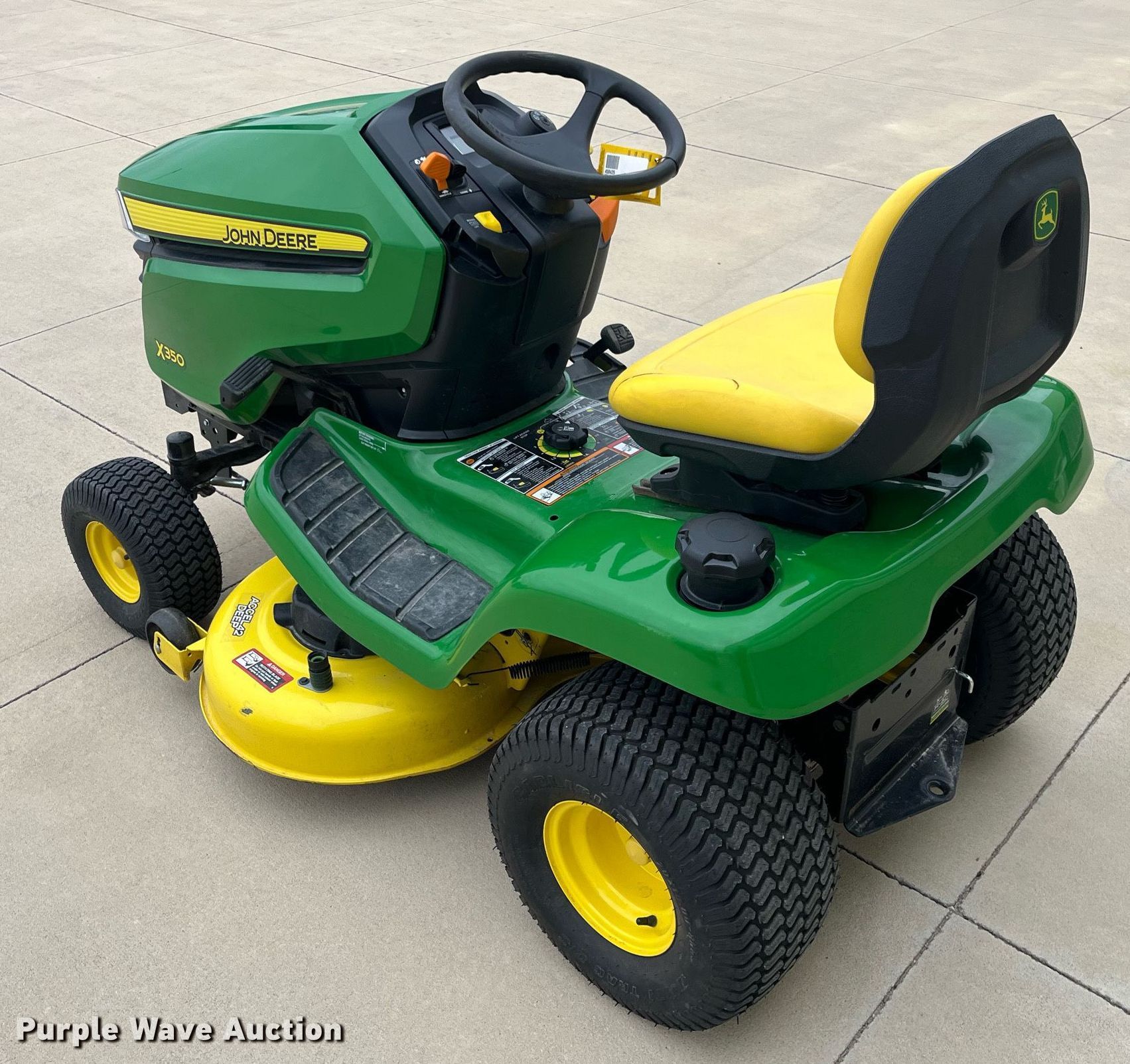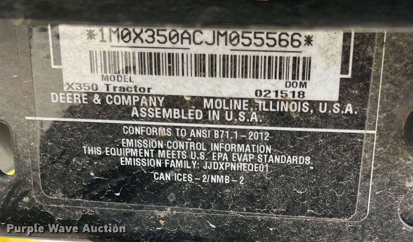 Purple Wave is selling a used Lawn Mower in Kansas. This item is a John Deere X350 lawn mower with the following: Hours: 2 on meter, Cutting width: 42", Serial: 1M0X350ACJM055566