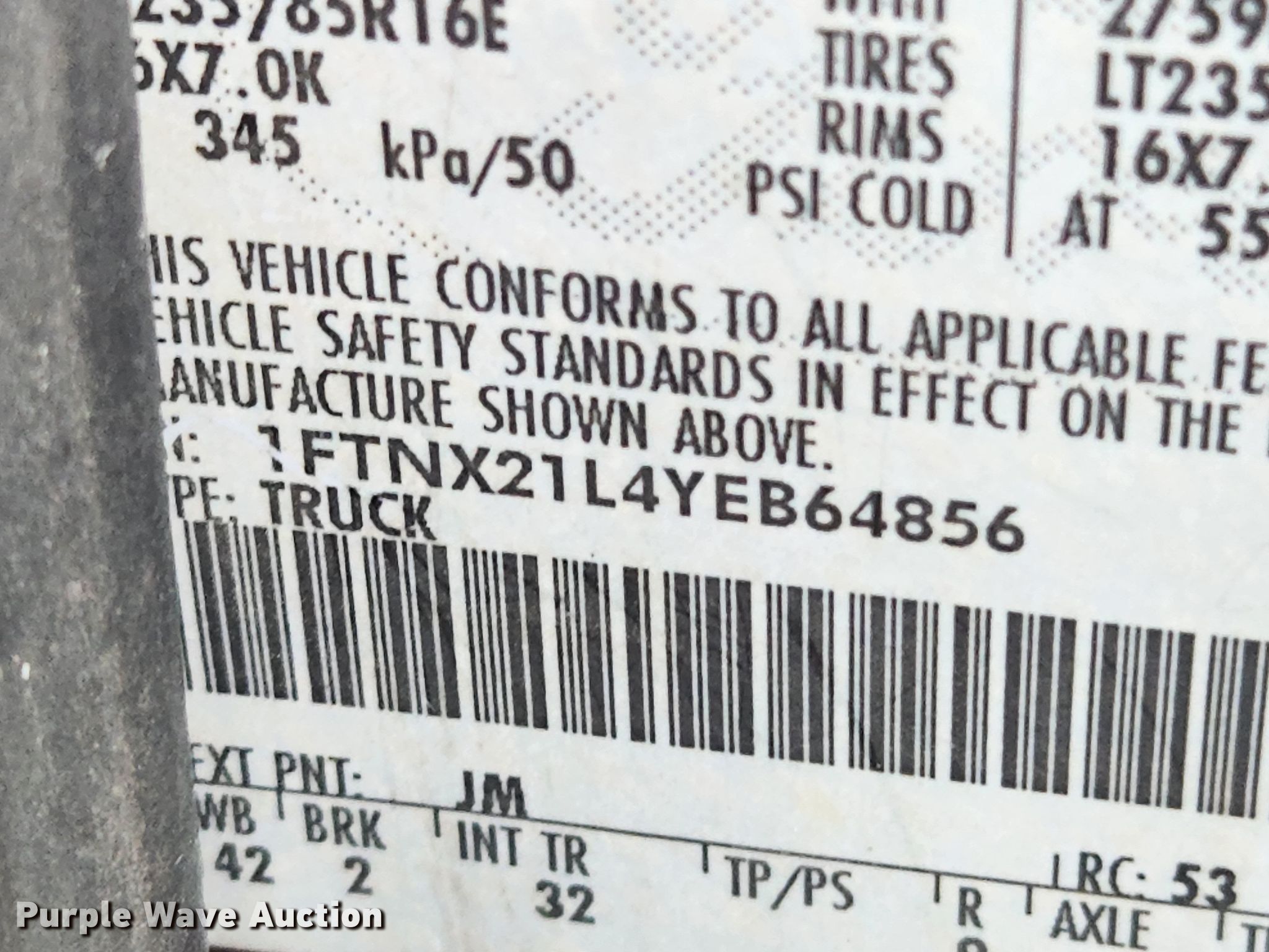 Purple Wave is selling a used 3/4 or 1 Ton Pickup or Van in Illinois. This item is a 2000 Ford F250 Super Duty XLT SuperCab pickup truck with the following: Miles: 239,035 on odometer, VIN: 1FTNX21L4YEB64856