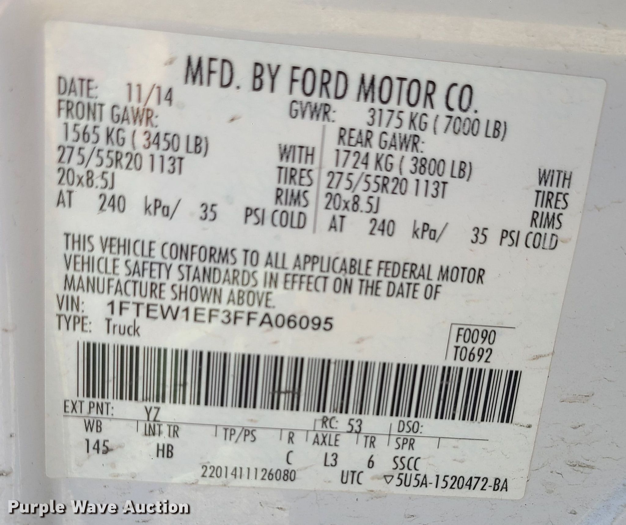 2015 Ford F150 XLT SuperCrew pickup truck. Miles: 122,854 on odometer, VIN: 1FTEW1EF3FFA06095. Engine Displacement: 5.0L V8, Cylinders: 8, Fuel type: Gas. Transmission Automatic, Four wheel drive. Interior AC, Heat, Power windows, Power locks, Cruise control. Tires Size: 275/55R20. Missouri title. Title distribution may be delayed up to 14 days from verification of funds. Kissick Construction Company. 8131 Indiana Ave. Kansas City, MO 64132