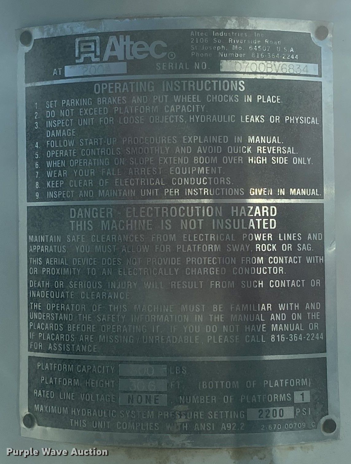 2000 Ford F450 Super Duty bucket truck. Miles: 235,037 on odometer, VIN: 1FDXF46F7YED34827. Engine Displacement: 7.3L, Cylinders: 8, Fuel type: Diesel. Transmission Automatic. Chassis Axles: Single, Suspension: Spring, Brakes: Hydraulic, PTO, GVWR: 15,000 lbs, Wheelbase: 141". Interior AC, Heat. Features Bed Knapheide 6108D54J, Serial: 875617, 11' 6" L x 96" W, Boom Altec 200A, Serial: 0700BV6834, Maximum lift capacity: 300 lbs, Maximum lift height: 30.6', Boom type: Telescopic, Man basket, Boom controls Platform/ basket, Remote control. Tires Size: 225/70R19.5. Oklahoma title. Title distribution may be delayed up to 14 days from verification of funds. 15107 North 137th East Avenue. Collinsville, OK 74021