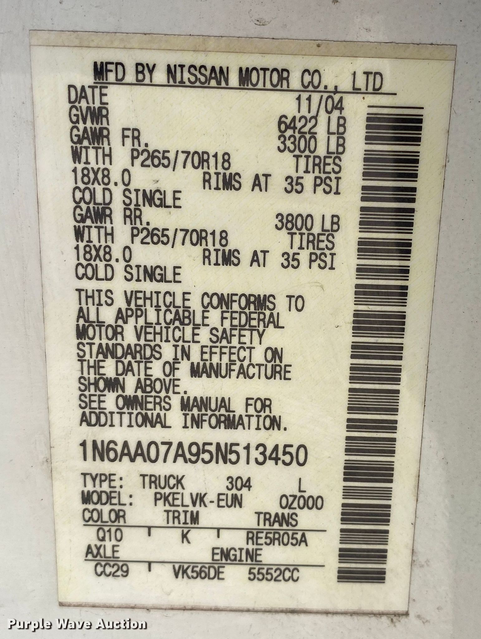 2005 Nissan Titan Crew Cab pickup truck. Miles: 236,956 on odometer, VIN: 1N6AA07A95N513450. Engine Displacement: 5.6L V8 DOHC, Cylinders: 8, Fuel type: Gas. Transmission Automatic. Interior AC, Heat, Seat: Heated, Power driver, Power passenger, Power windows, Power locks, Cruise control. Tires Size: 265/70R18. Oklahoma title. Title distribution may be delayed up to 14 days from verification of funds. CDK Distribution, Inc.. 807 S. Axanthus. Tulsa, OK 74104