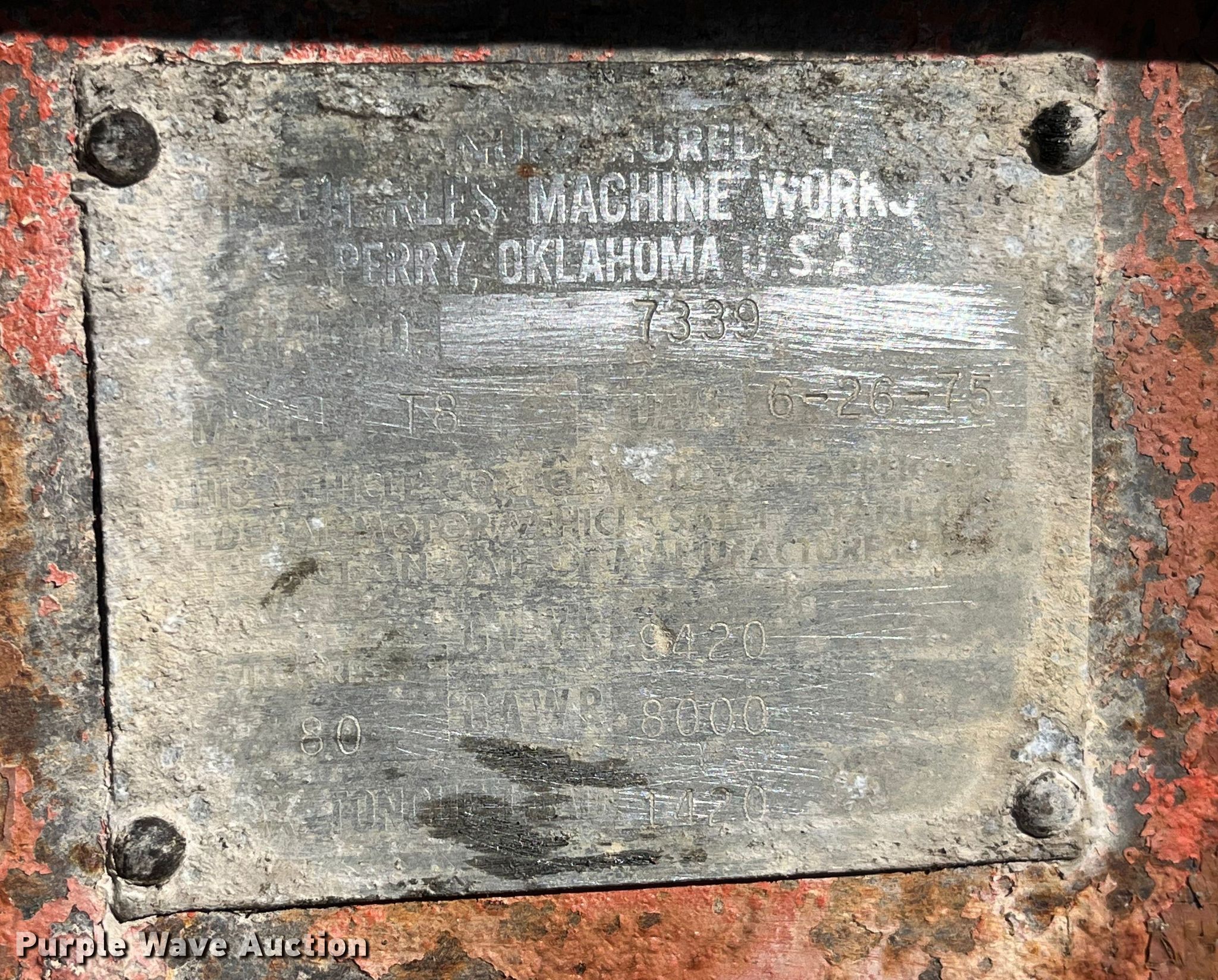 1975 Charles Machine Works T8 equipment trailer. VIN: 7339. Dimensions Overall: 20' x 95" W, Deck: 13' 2.5" L x 70" W. Features Deck type: Steel. Chassis Hitch: Pintle, Suspension: Spring, Axles: Tandem, GVWR: 9,420 lbs, GAWR: 8,000 lbs. Tires Steel wheels, Size: 215/70R15. Notes Tires flat. Transfer of ownership documentation will be a bill of sale which will be assigned and distributed by the seller. 429 W Main St. Lamoni, IA 50140