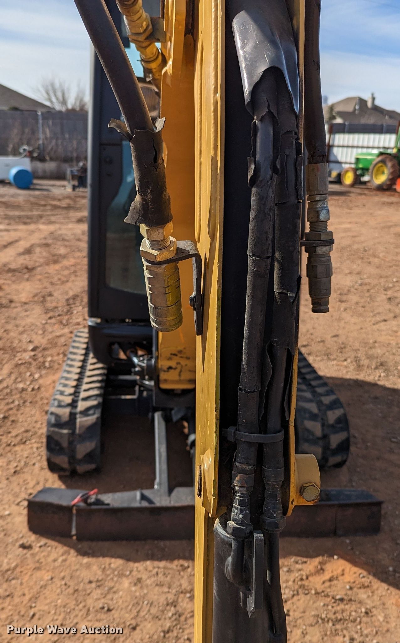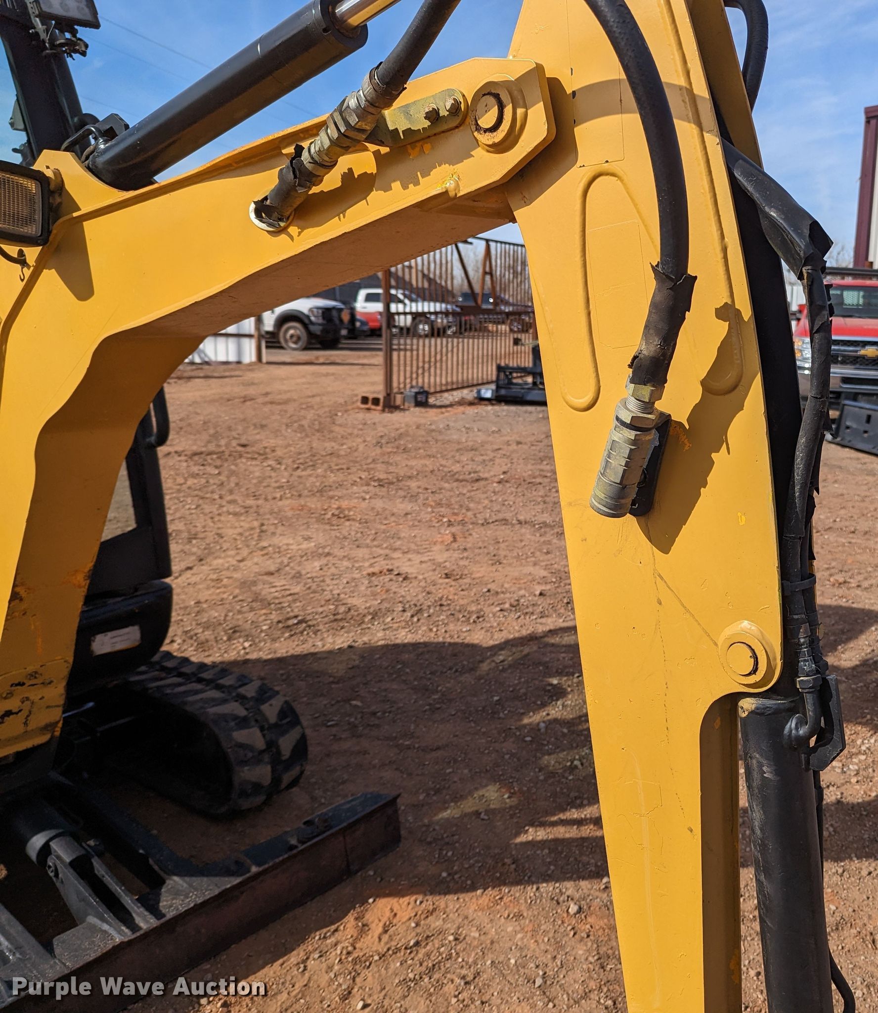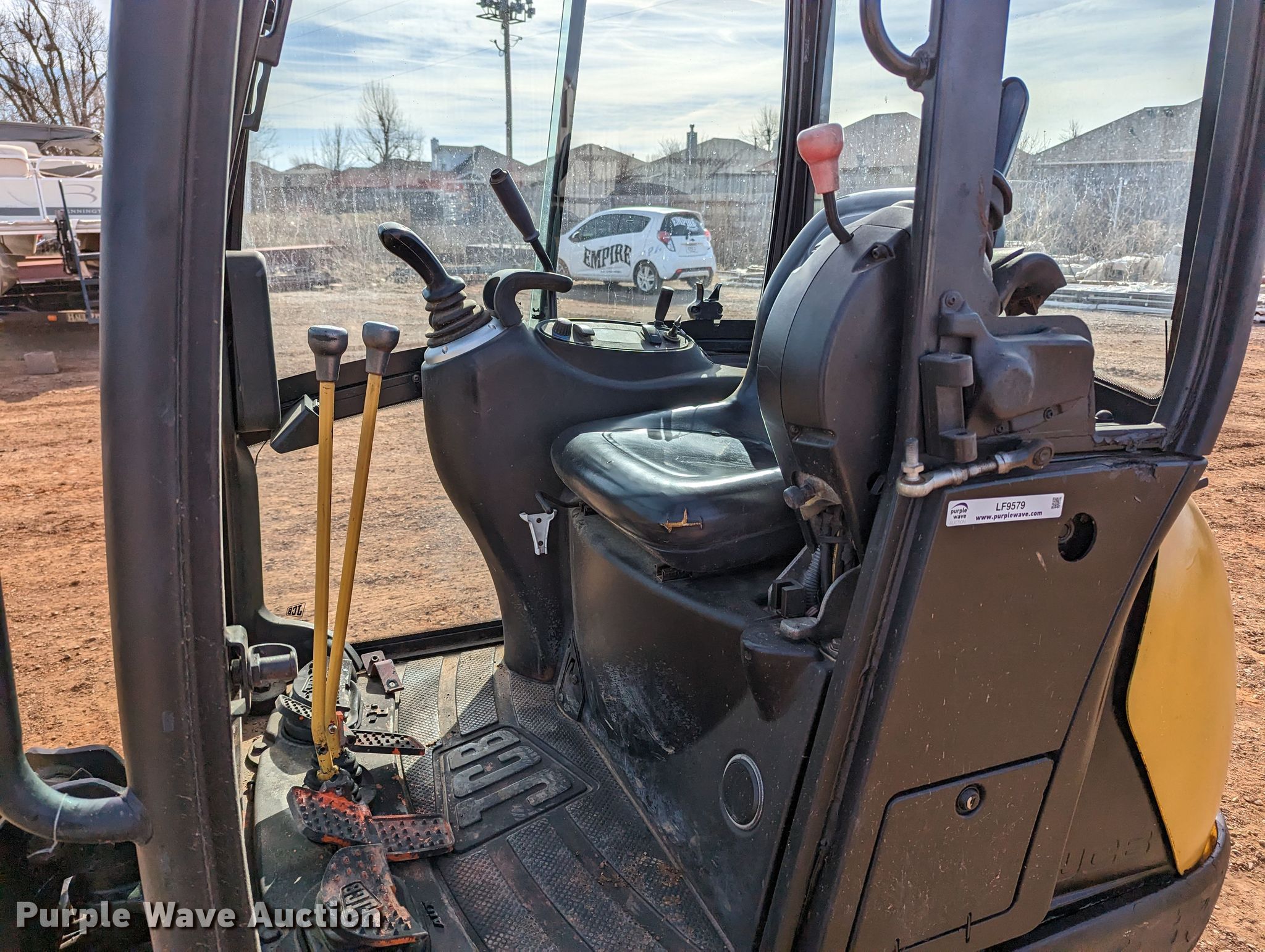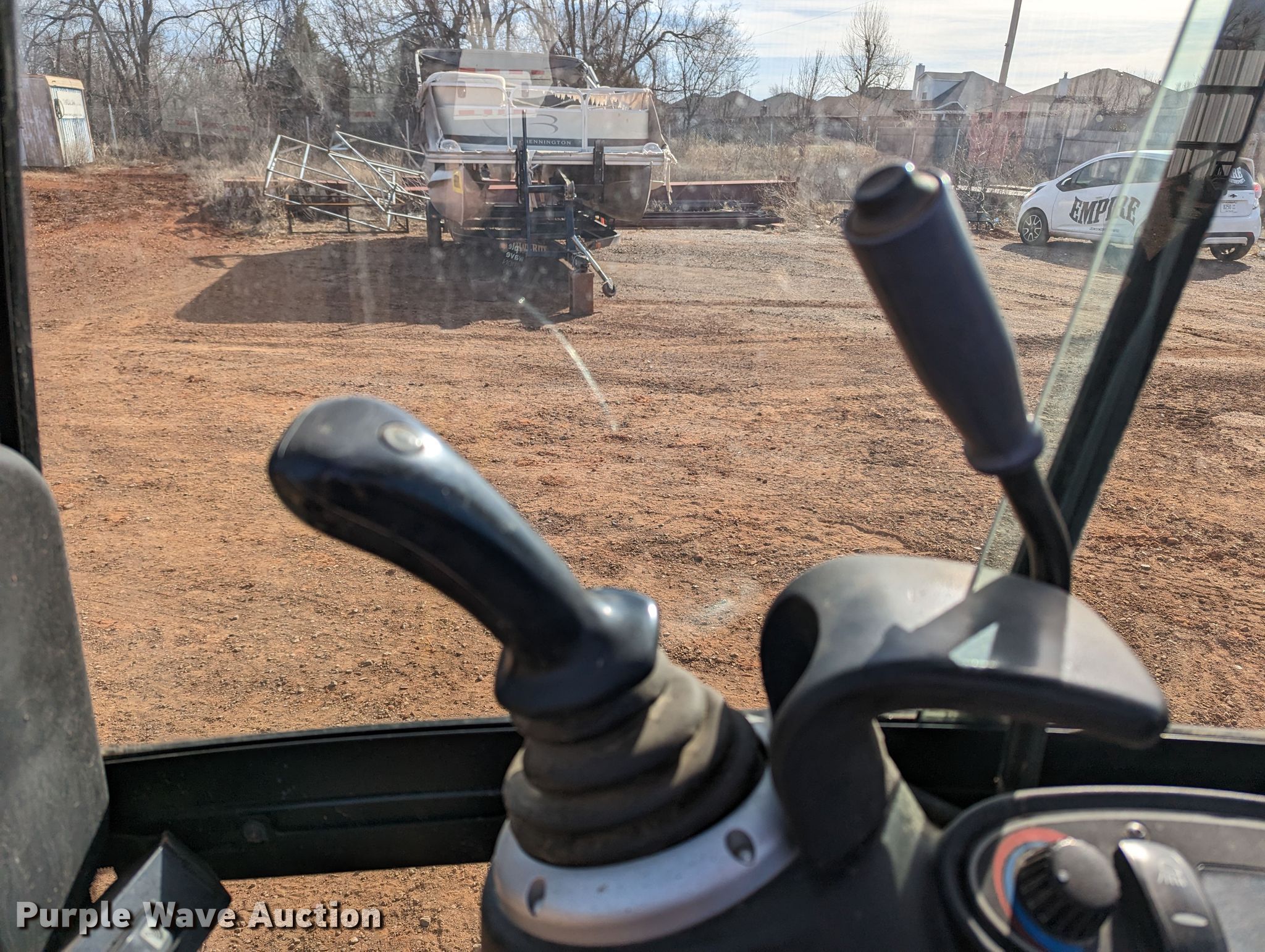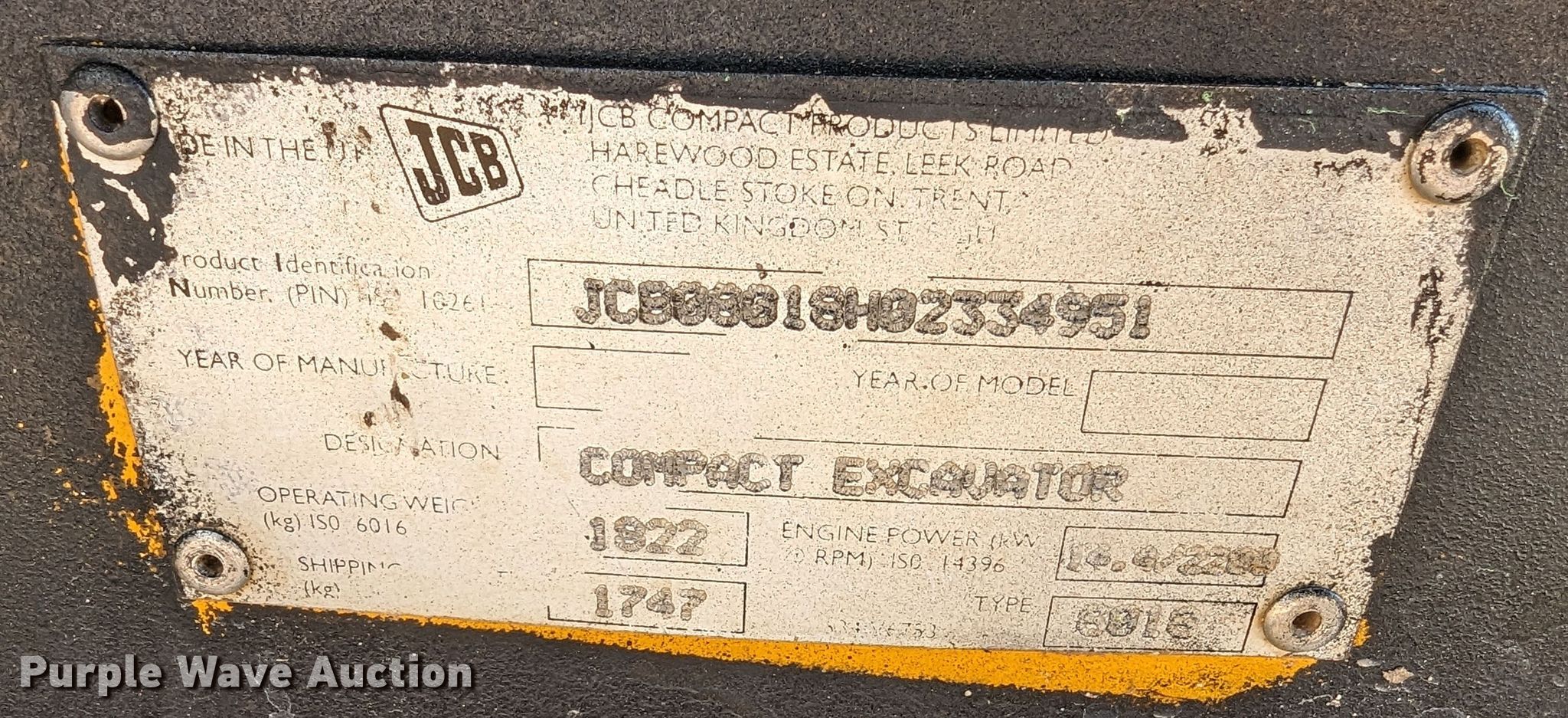 JCB 8018 mini excavator. Hours: 1,753 on meter, Serial: JCB08618H02334951. Engine Perkins, Cylinders: 3, Fuel type: Diesel. Transmission Hydrostatic. Features Auxiliary hydraulics, Backfill blade Width: 54", Boom Swing, Stick Stick length: 48", Bucket Width: 17", Cutting edge: Weld-on. Tracks Width: 9", Rubber. Notes Roof section missing, Door missing , Glass missing. 1401 Lakeshore Dr. Yukon, OK 73099