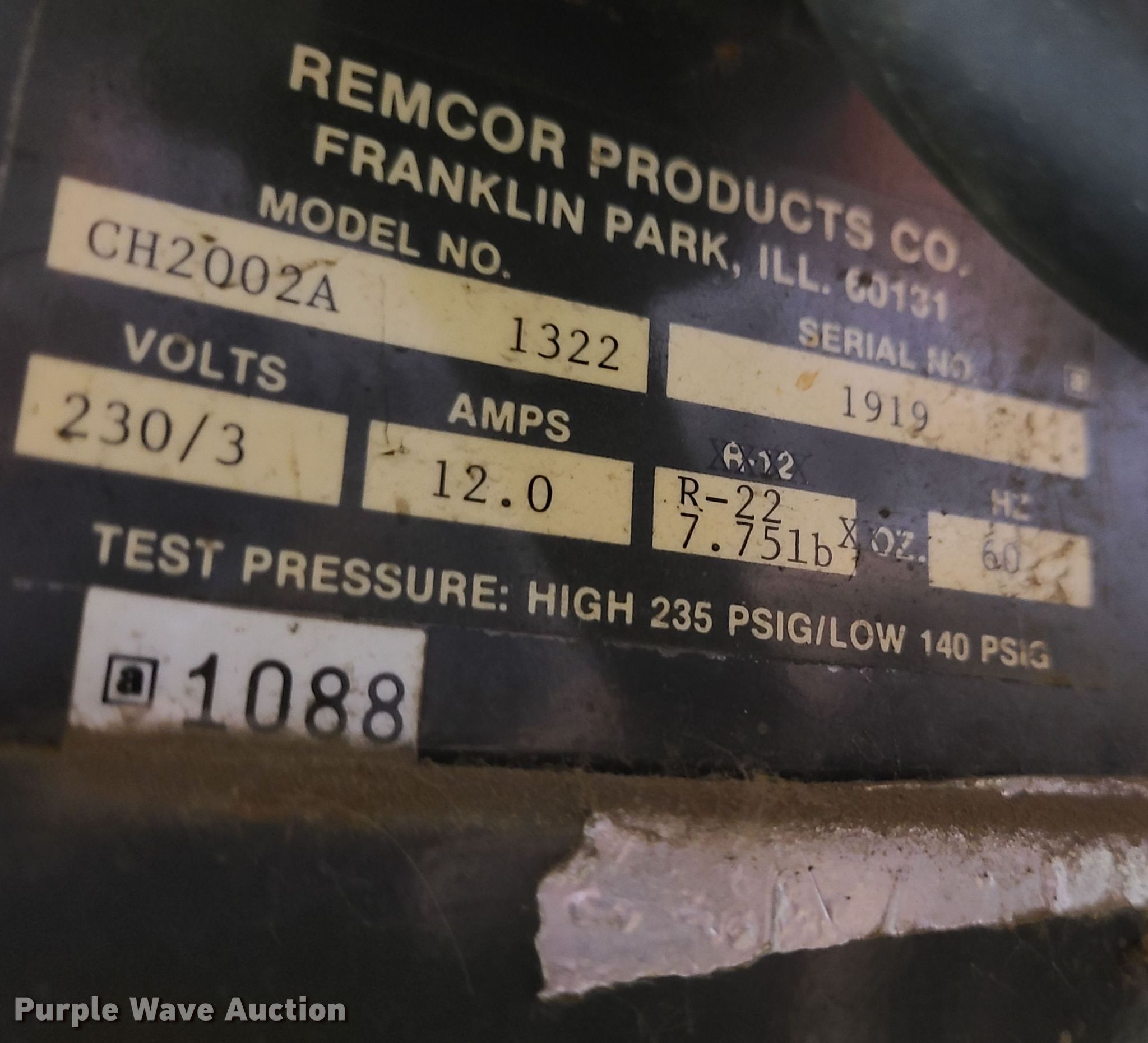 Purple Wave is selling a used Tools in Missouri. This item is a Remcor CH2002A liquid cooling system with the following: Unit #: 862692, Phase: Three, Volts: 230, Unknown operating condition